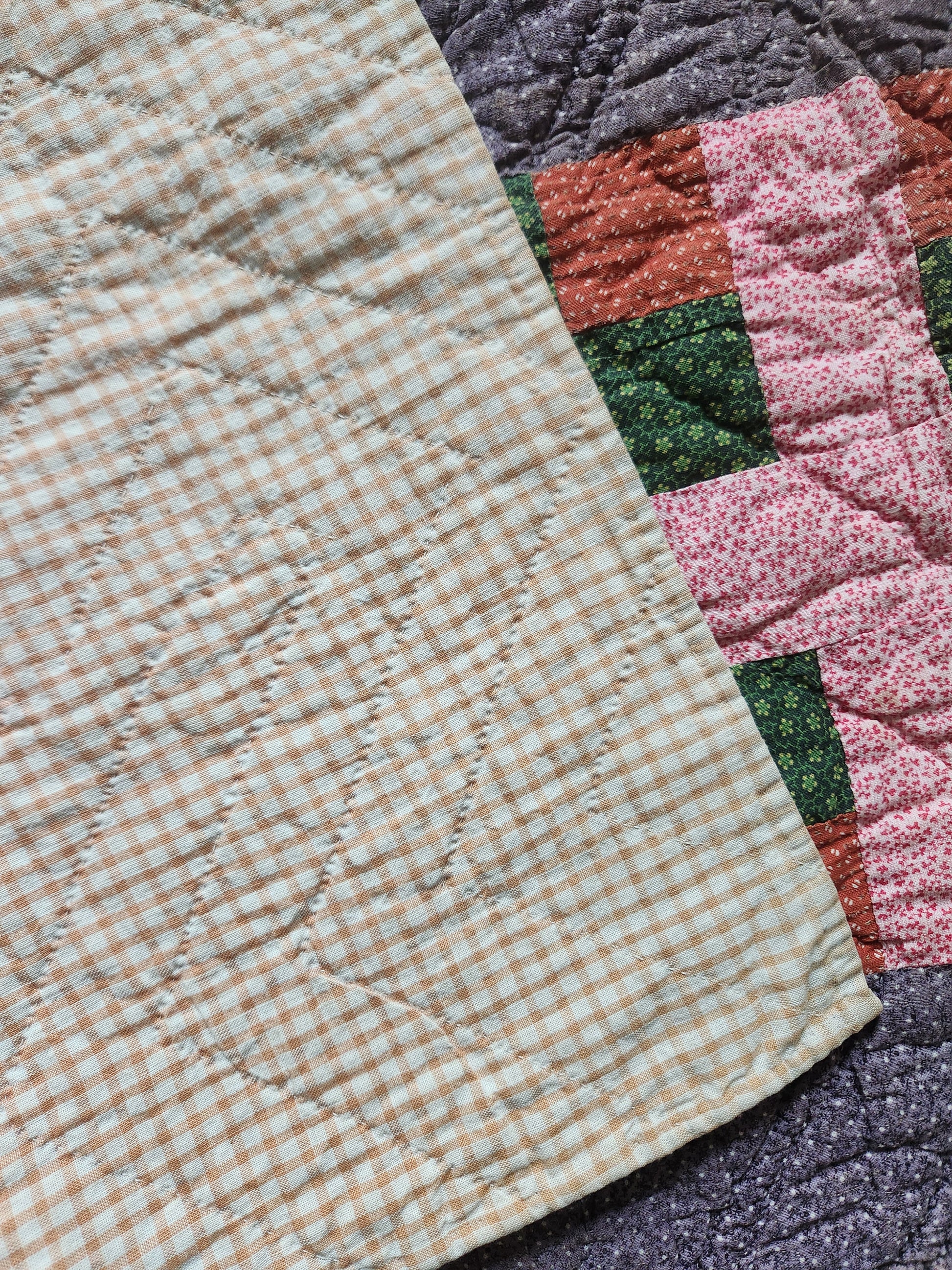 Late 19th Century, antique, Pennsylvania style, calico quilt, hand pieced and hand quilted. One of two in a pair, with subtle differences. This one has more wear to center fold lines and right border fabric, general thinning along the edges. The back is in perfect condition, a stunning yellow gingham check backing. The color combinations are beautiful with that lovely purple tying it all together.