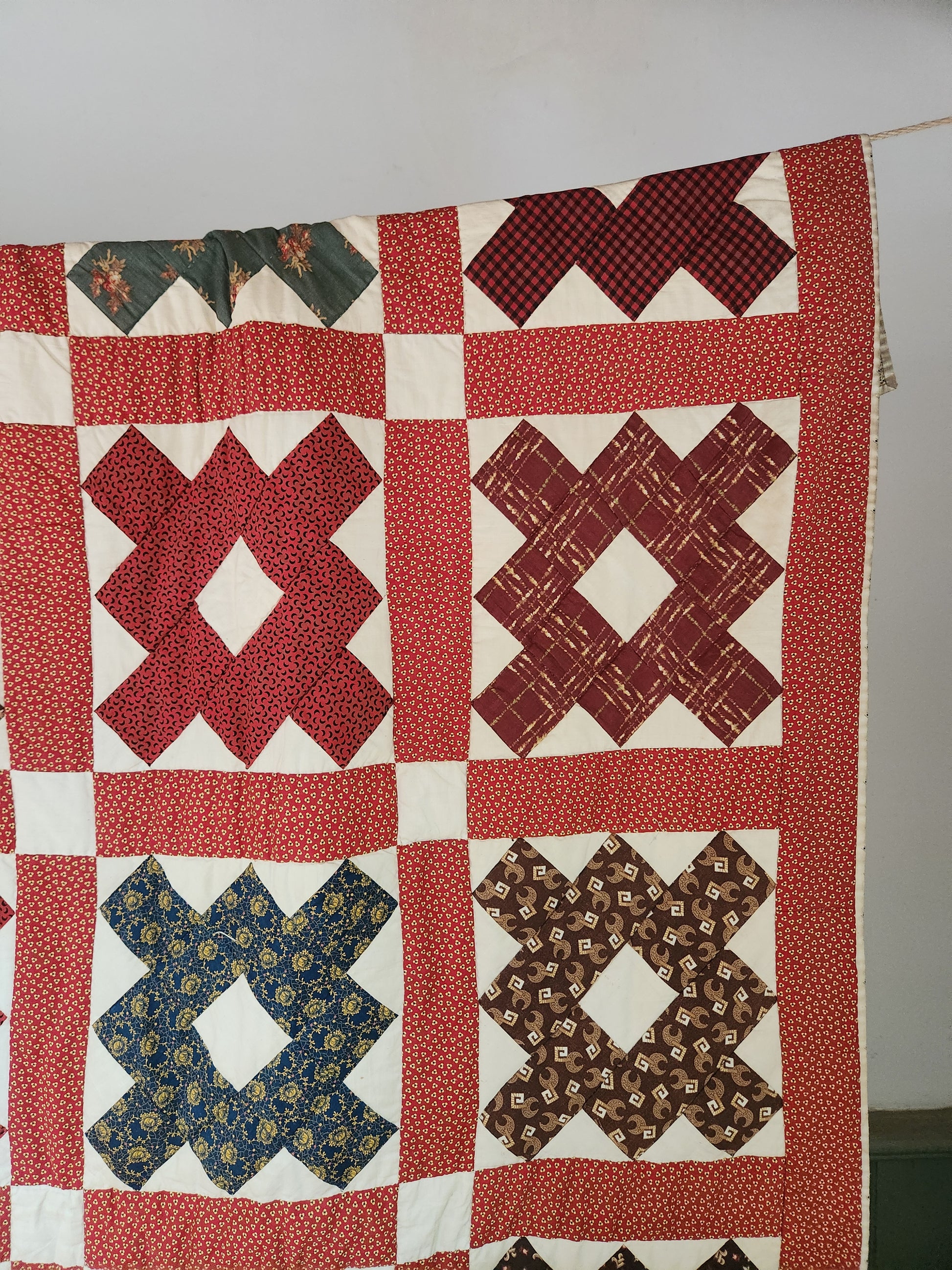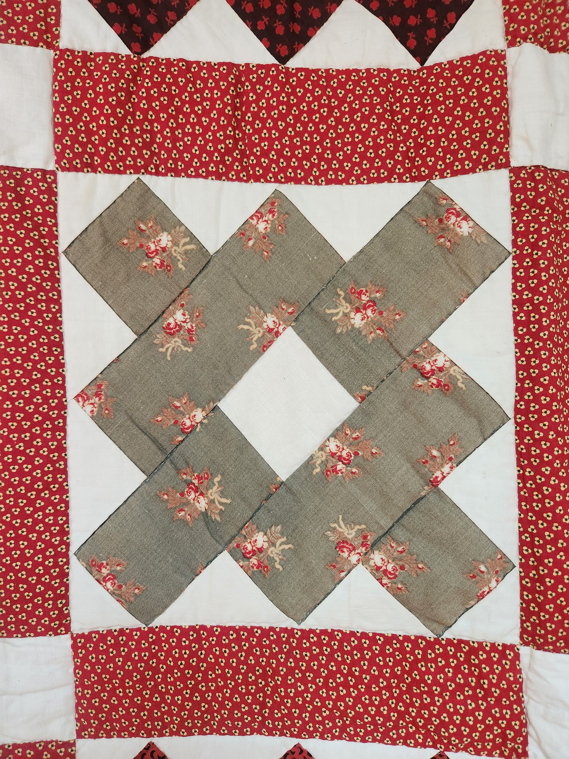 In amazing condition, this quilt was likely never used. The fabrics are fresh and crisp with no signs of wear. Beautiful blues, reds, browns and greens make up the blocks set in a red calico sashing. The back is an all-over micro floral in black and red.