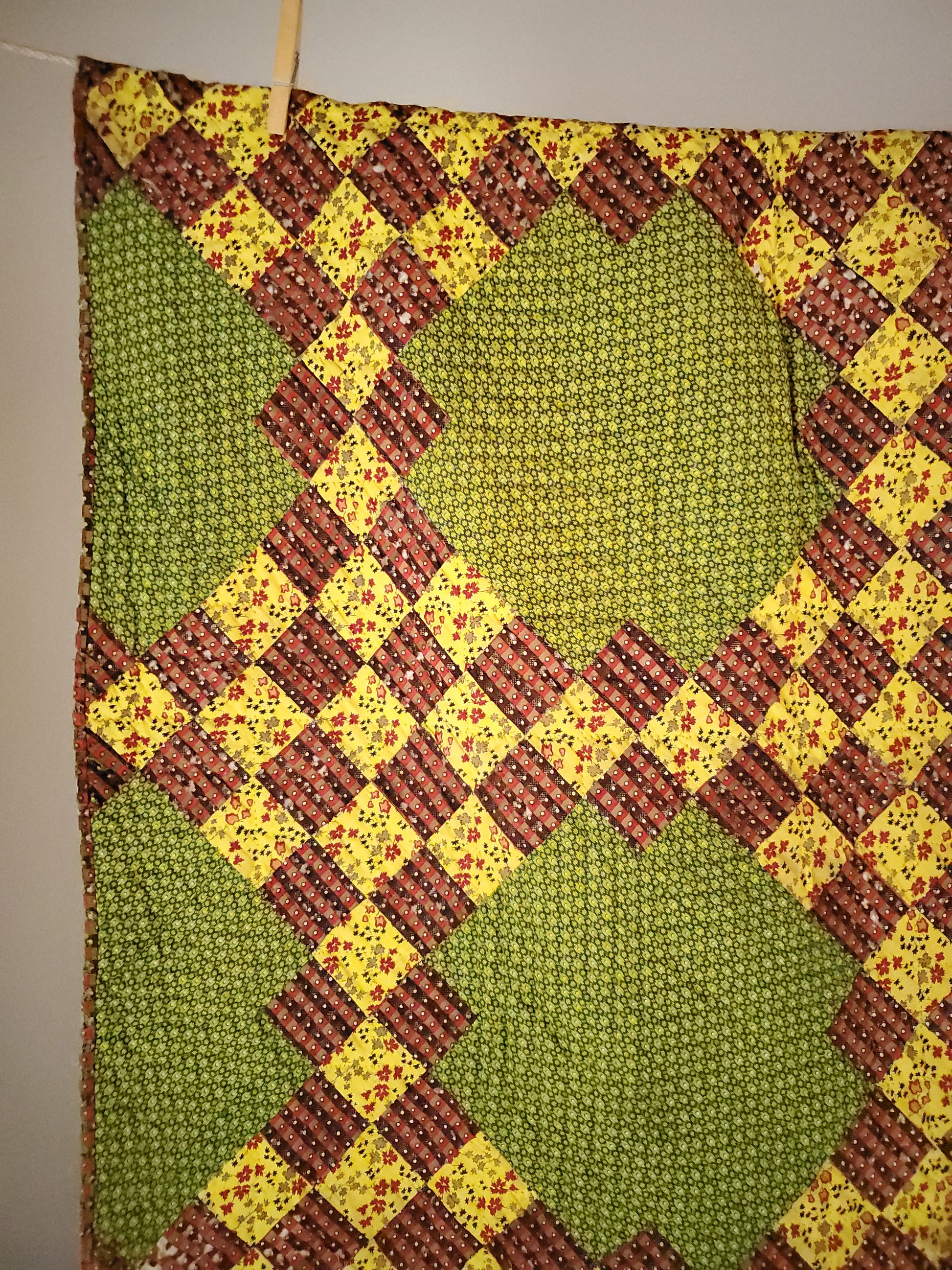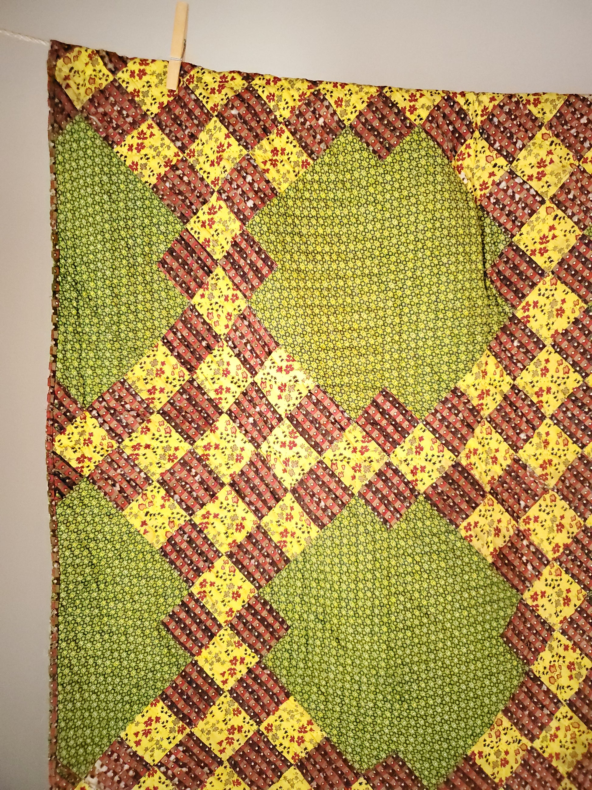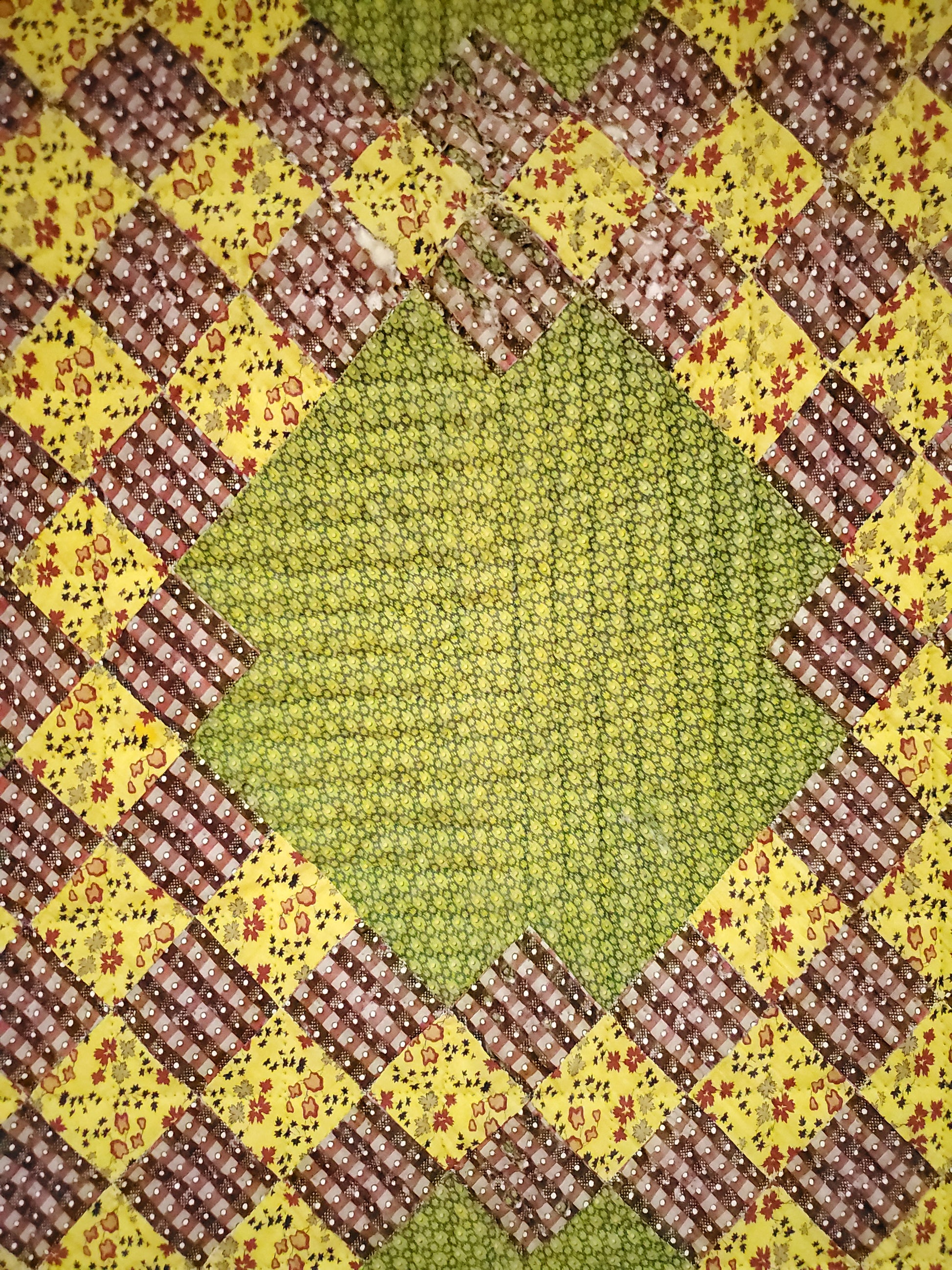 Unwashed to preserve original dyes, aired on a line. A stunning, patchwork quilt from the second half of the 19th century boasting gorgeous, saturated, early dyes in green, yellow and Madder browns. Hand quilted in a dark blue (likely once dark green) thread. The backing is a beautiful pink, floral, vermicular. There is a 3.5” rod pocket carefully hand stitched along the back, top edge for easy display. Some minor areas of split to the madder patches, and some thinning to the binding. over all great condition.