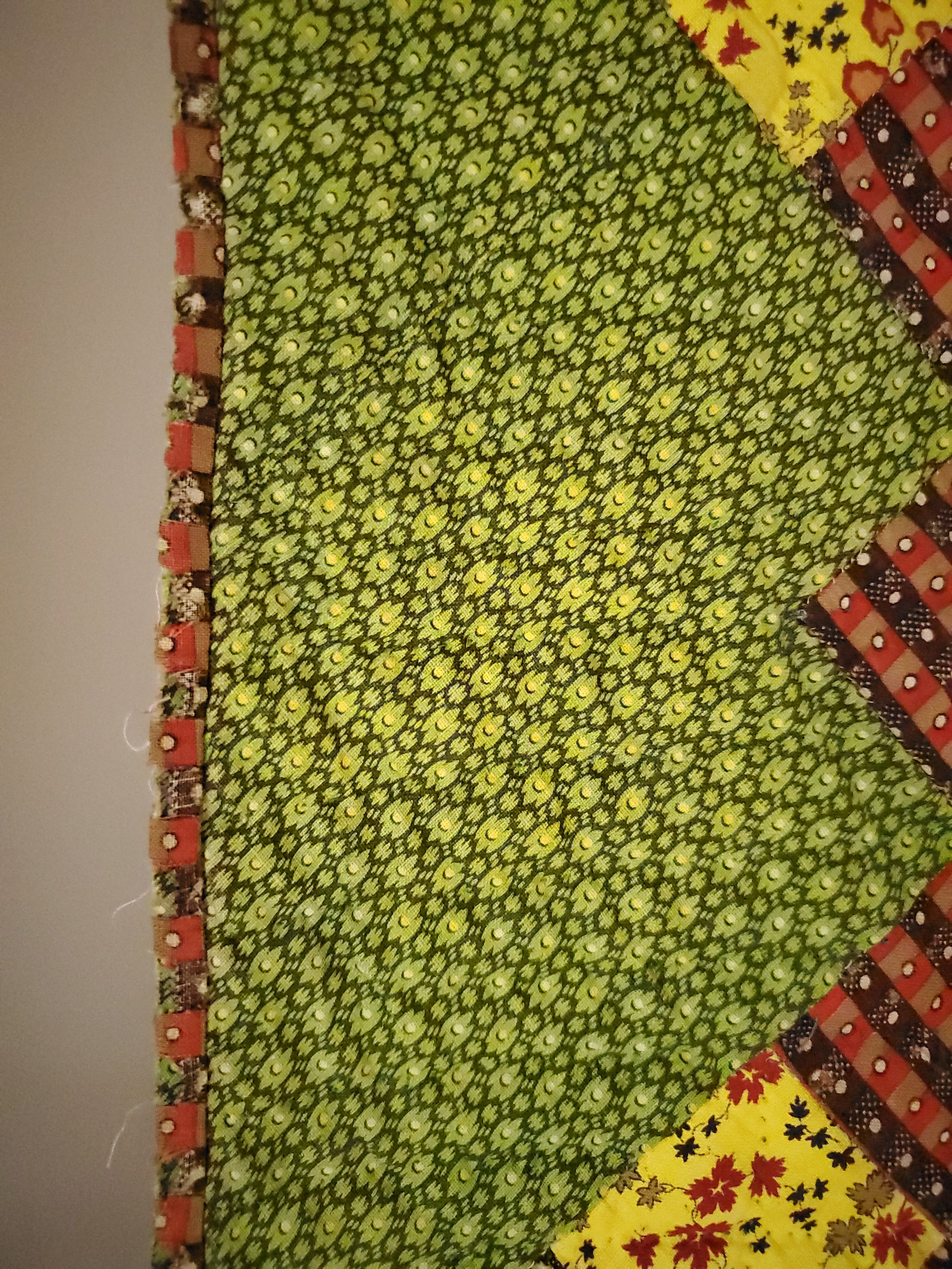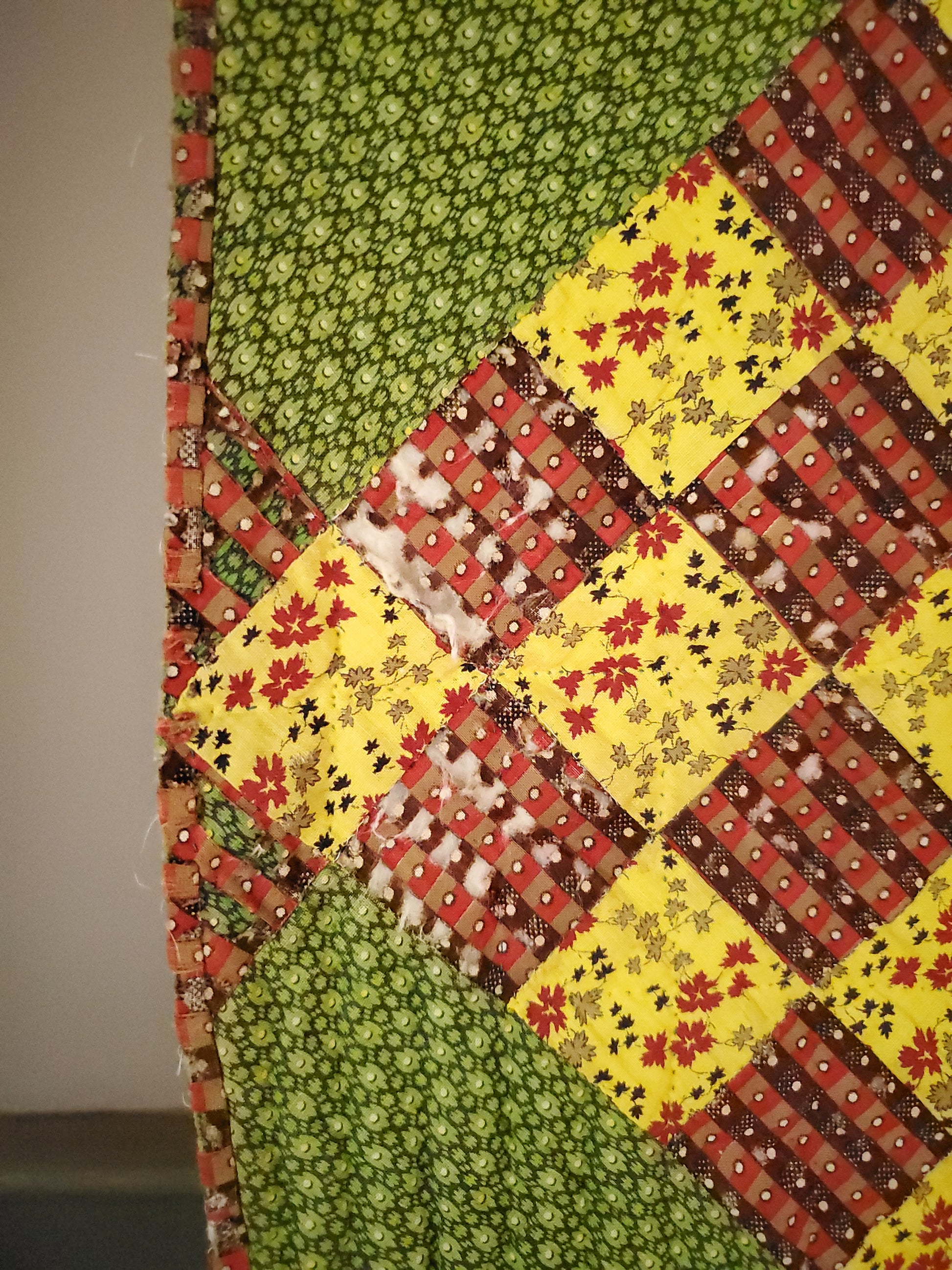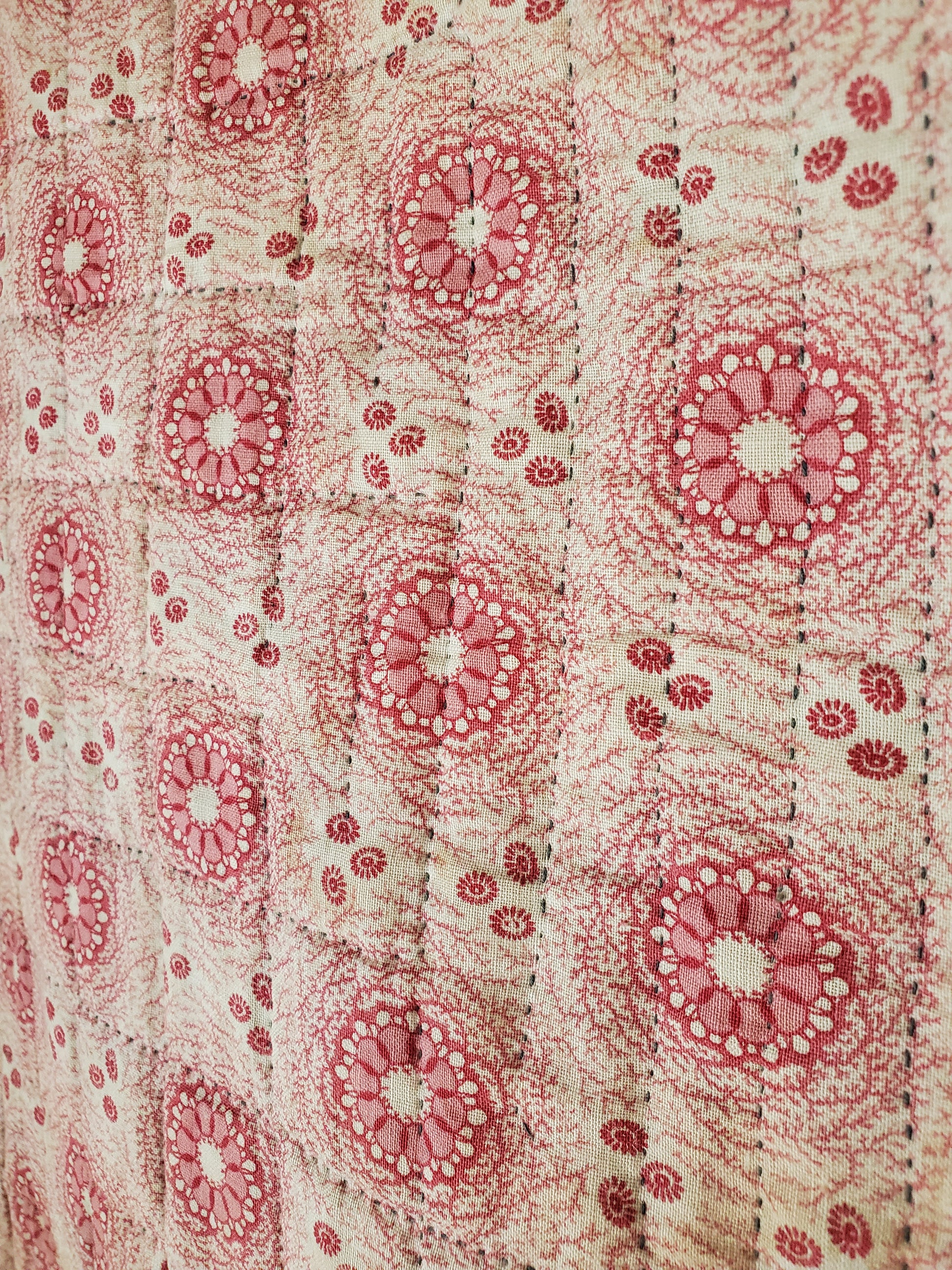 Unwashed to preserve original dyes, aired on a line. A stunning, patchwork quilt from the second half of the 19th century boasting gorgeous, saturated, early dyes in green, yellow and Madder browns. Hand quilted in a dark blue (likely once dark green) thread. The backing is a beautiful pink, floral, vermicular. There is a 3.5” rod pocket carefully hand stitched along the back, top edge for easy display. Some minor areas of split to the madder patches, and some thinning to the binding. over all great condition.