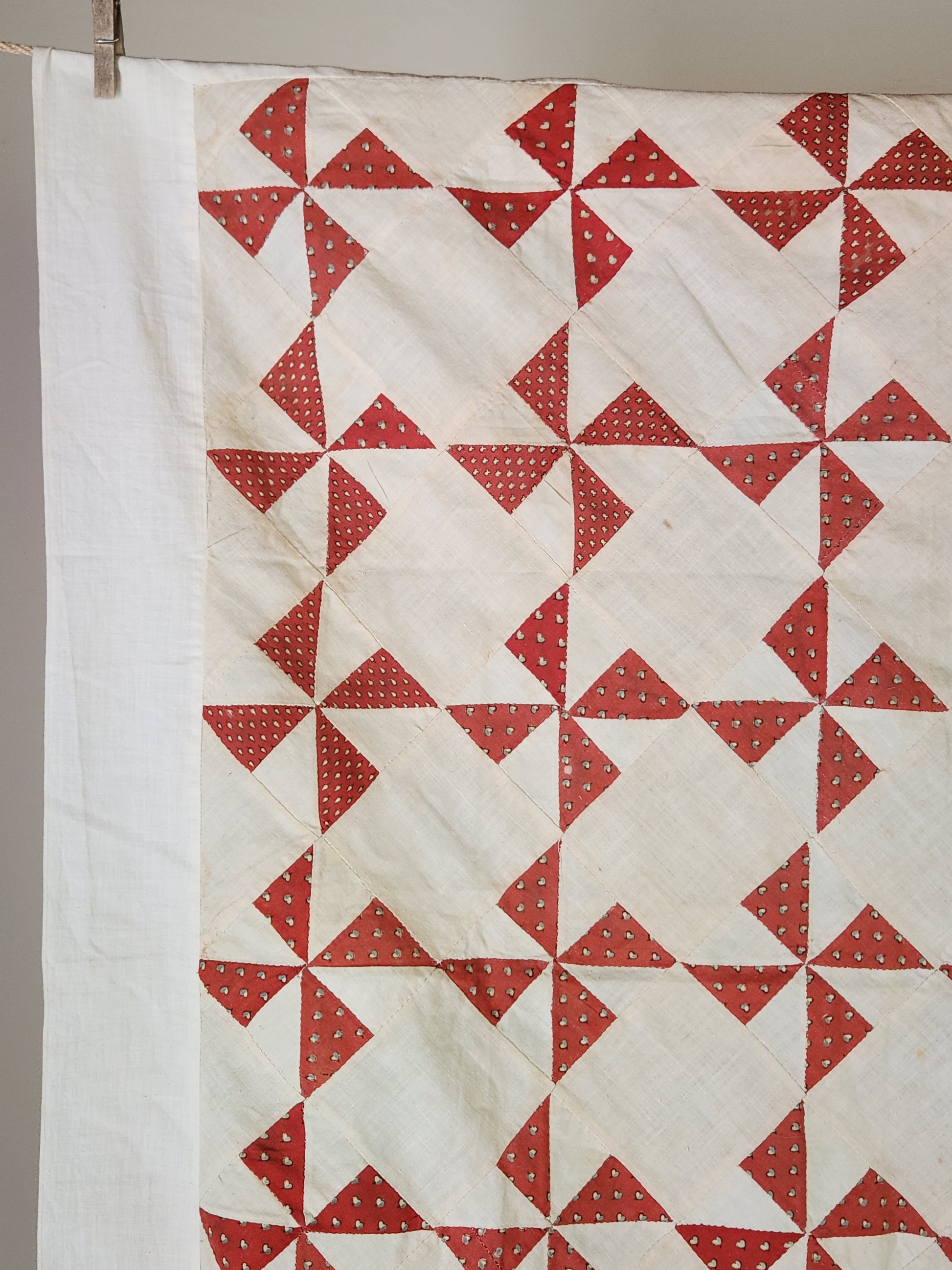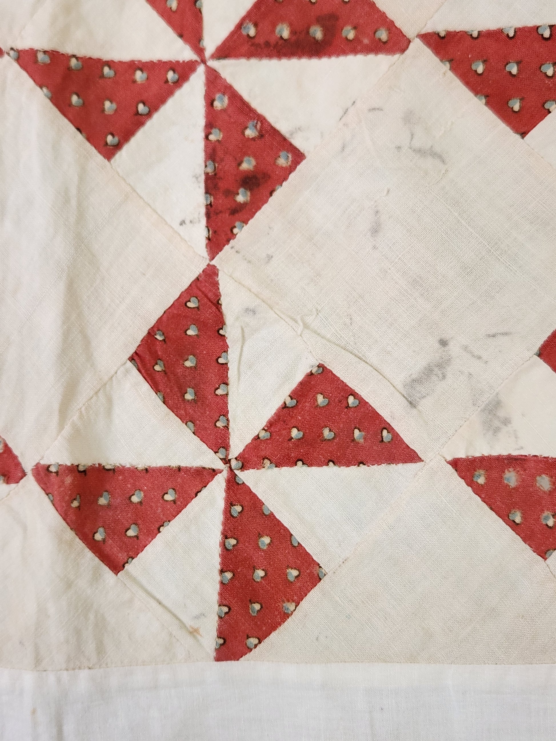 This unfinished quilt top fits dimensions for a crib quilt. It is the top only, and is carefully hand pieced in small pinwheel blocks measuring 3.5 x 3.5” each.