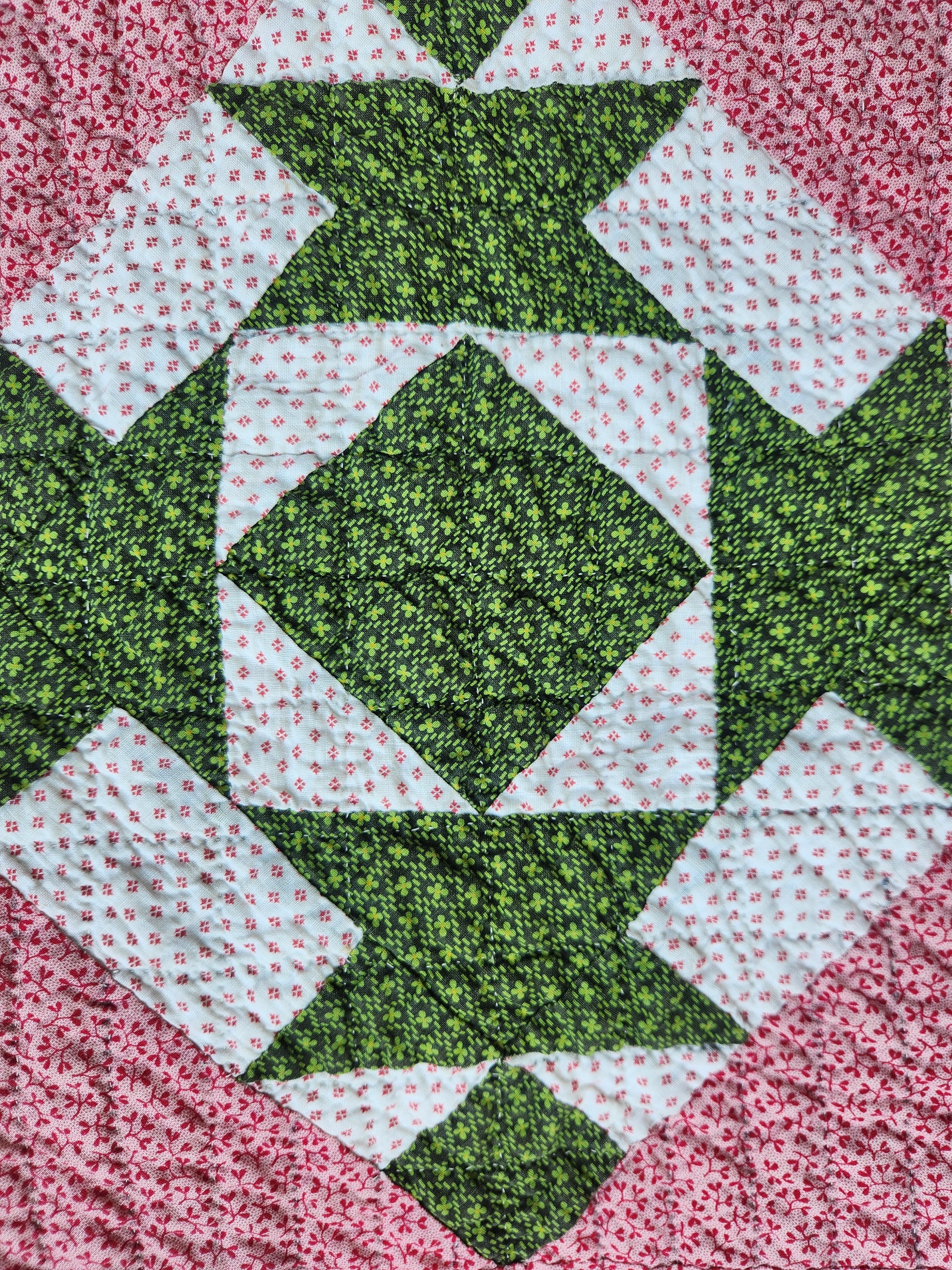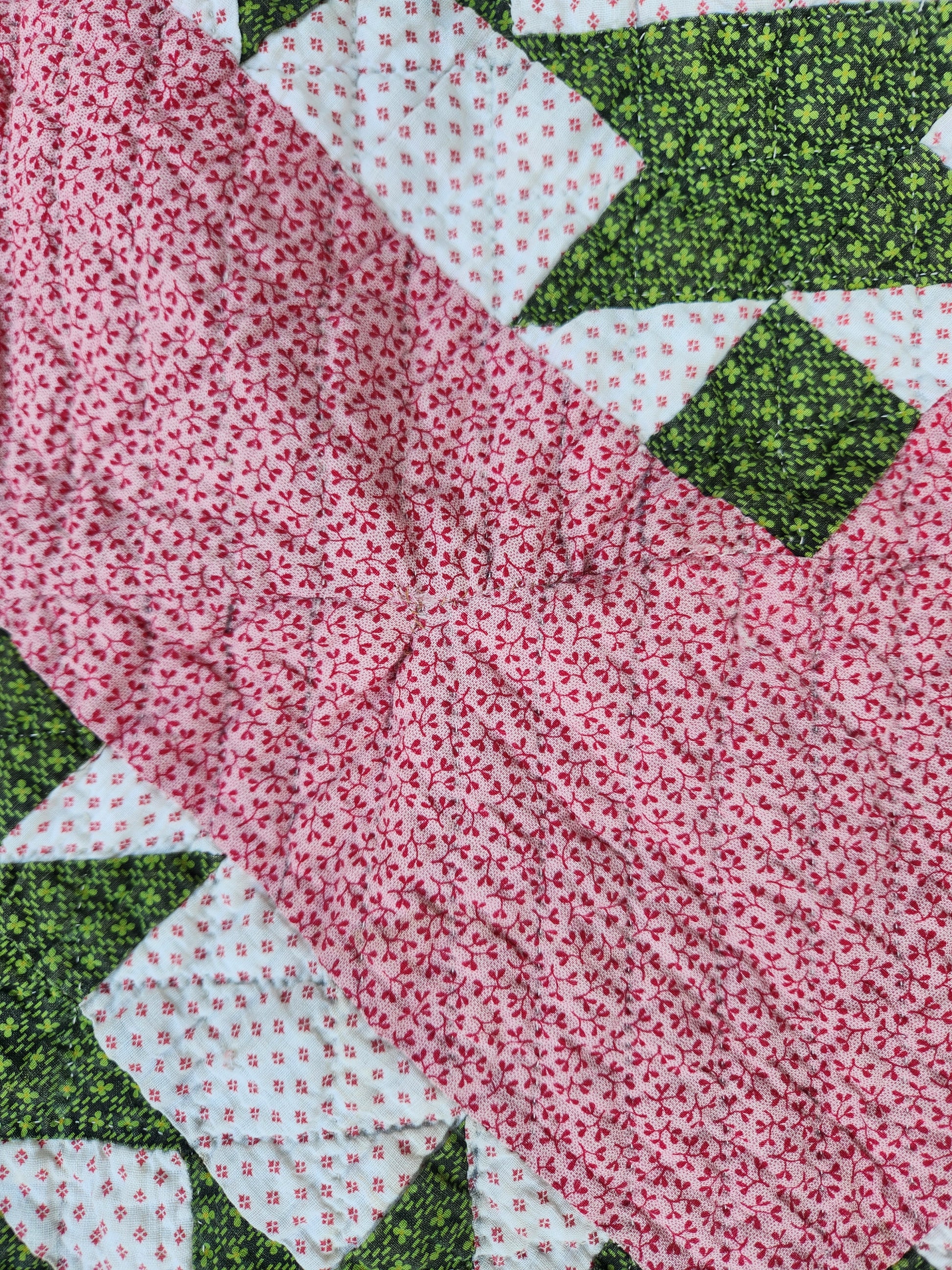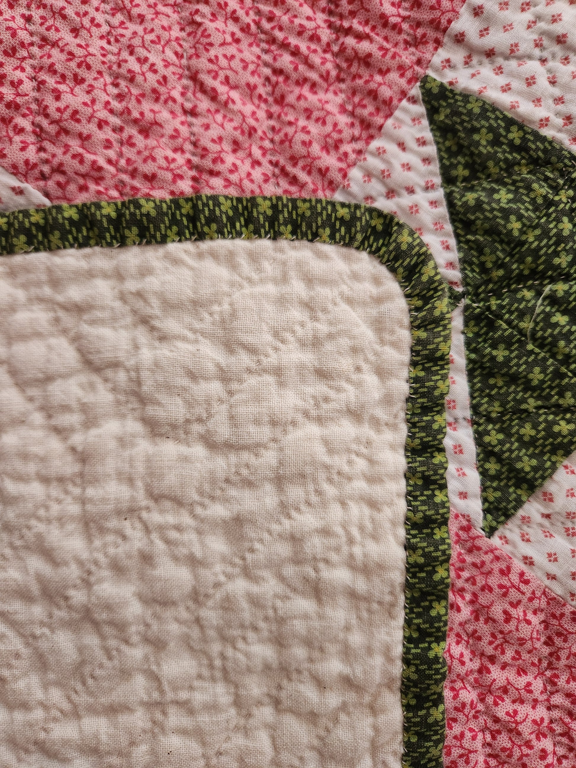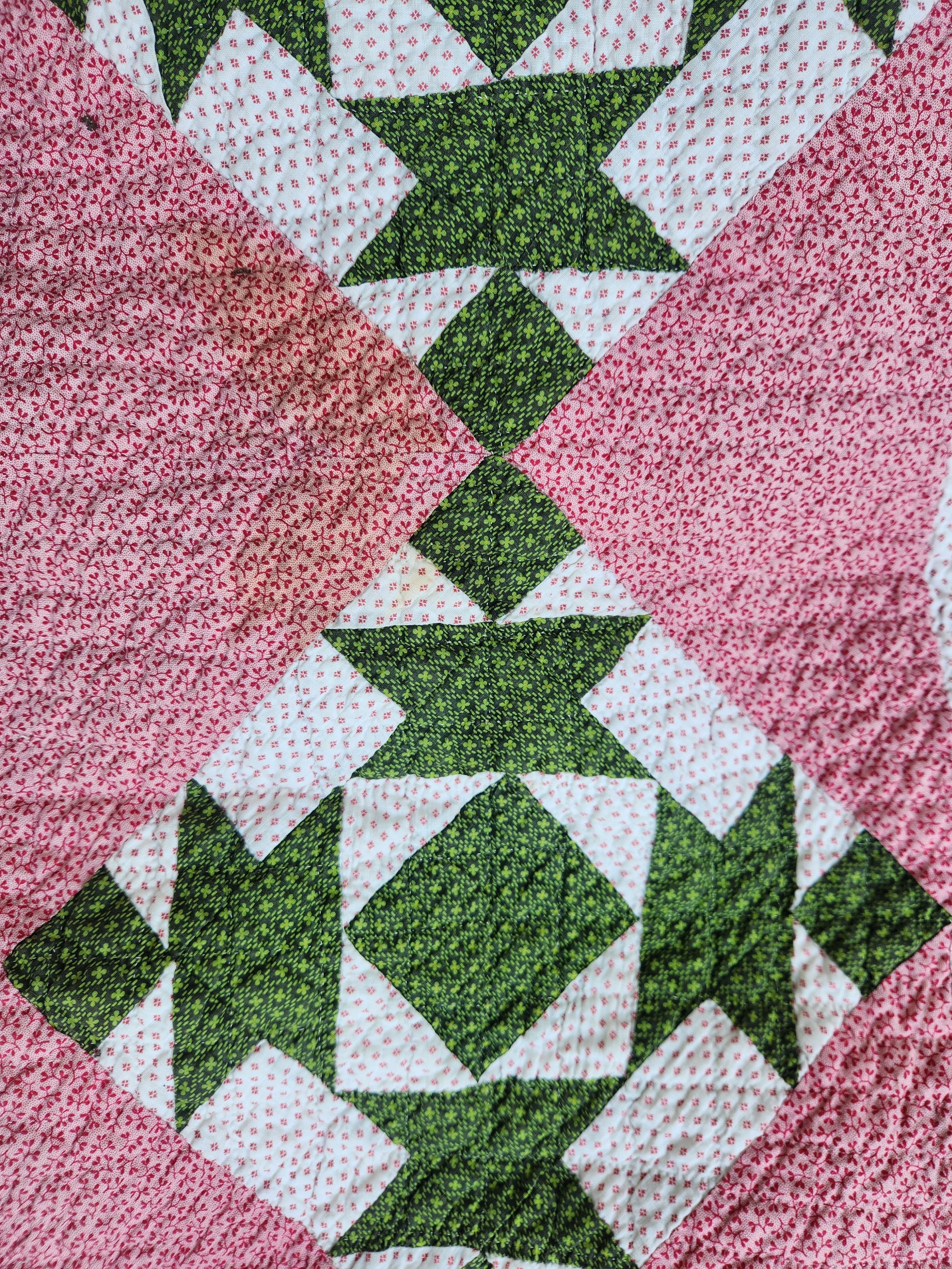 A gorgeous, hand pieced and hand quilted, antique quilt in double pink, green and white. It comes with some written provenance. This quilt is in wonderful condition with a few pale yellow areas and one mend (suture) on front and back about 2 inches in L shape. It is bound in green calico.