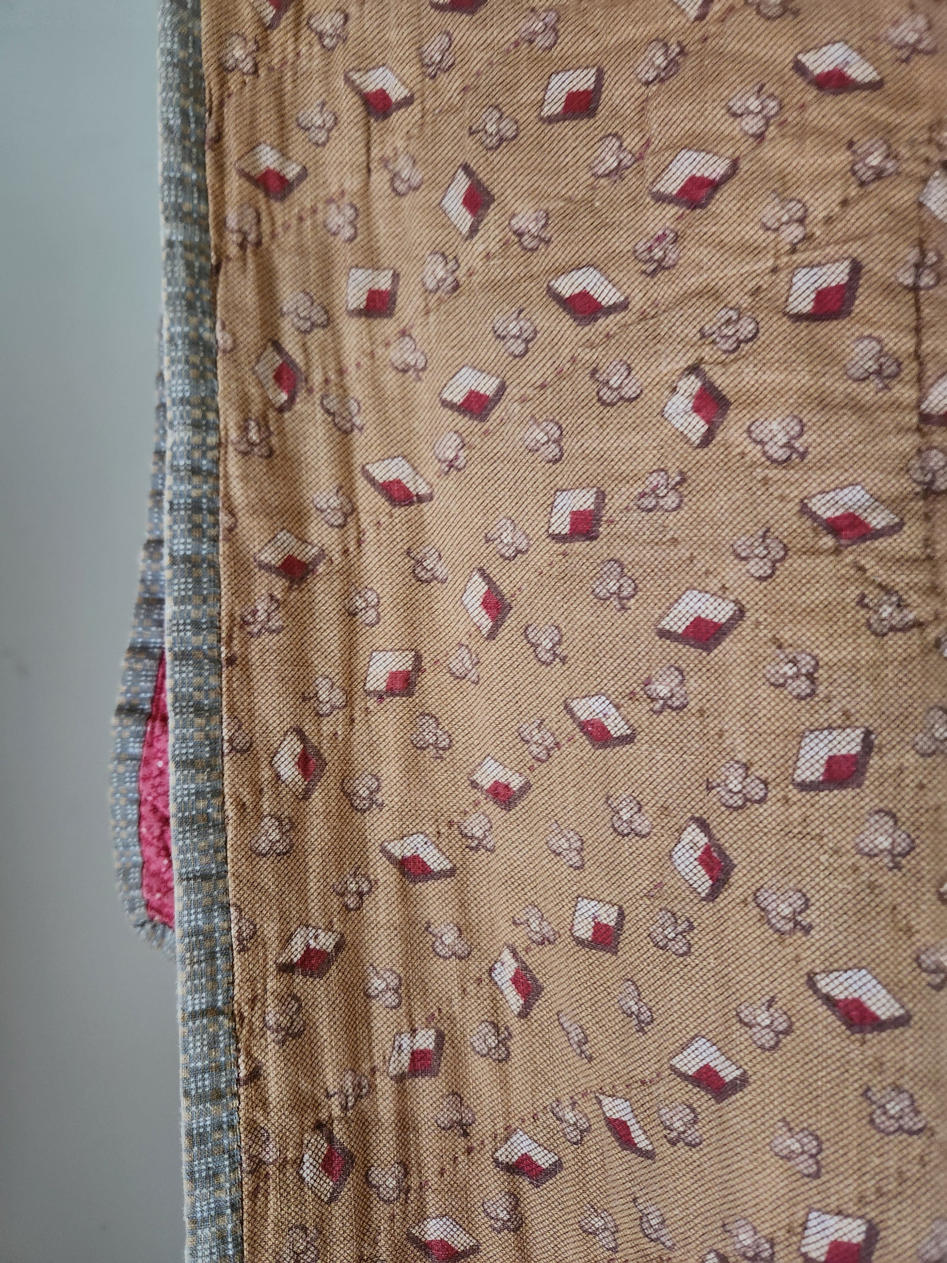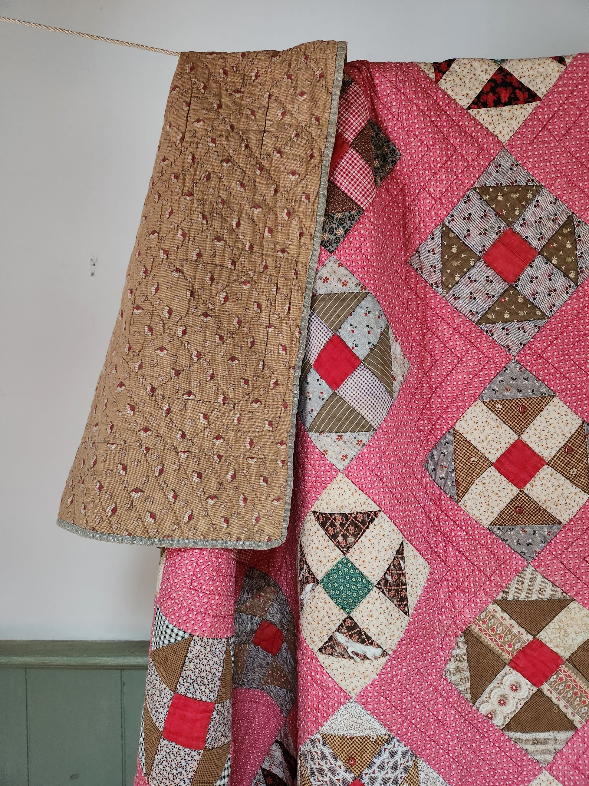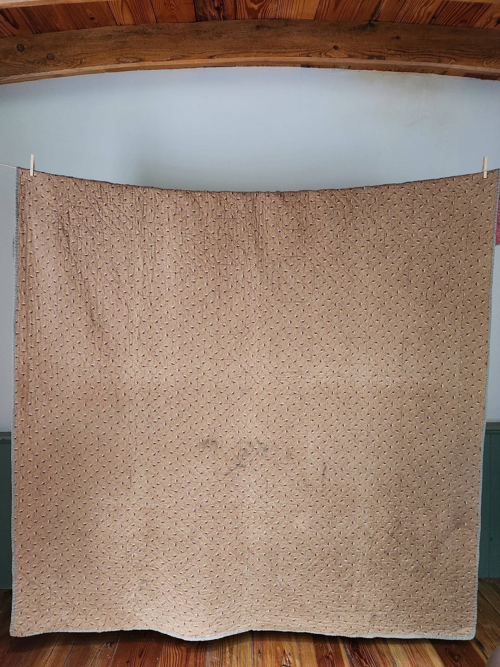 Circa 1870 -1890, this crosses quilt is hand pieced and hand quilted. It is soft and full of wonderfully 19th century fabrics. The beautiful brown, floral backing is a welcome addition and the whole piece is soft and lovely. It has been aired and sunned to refresh.