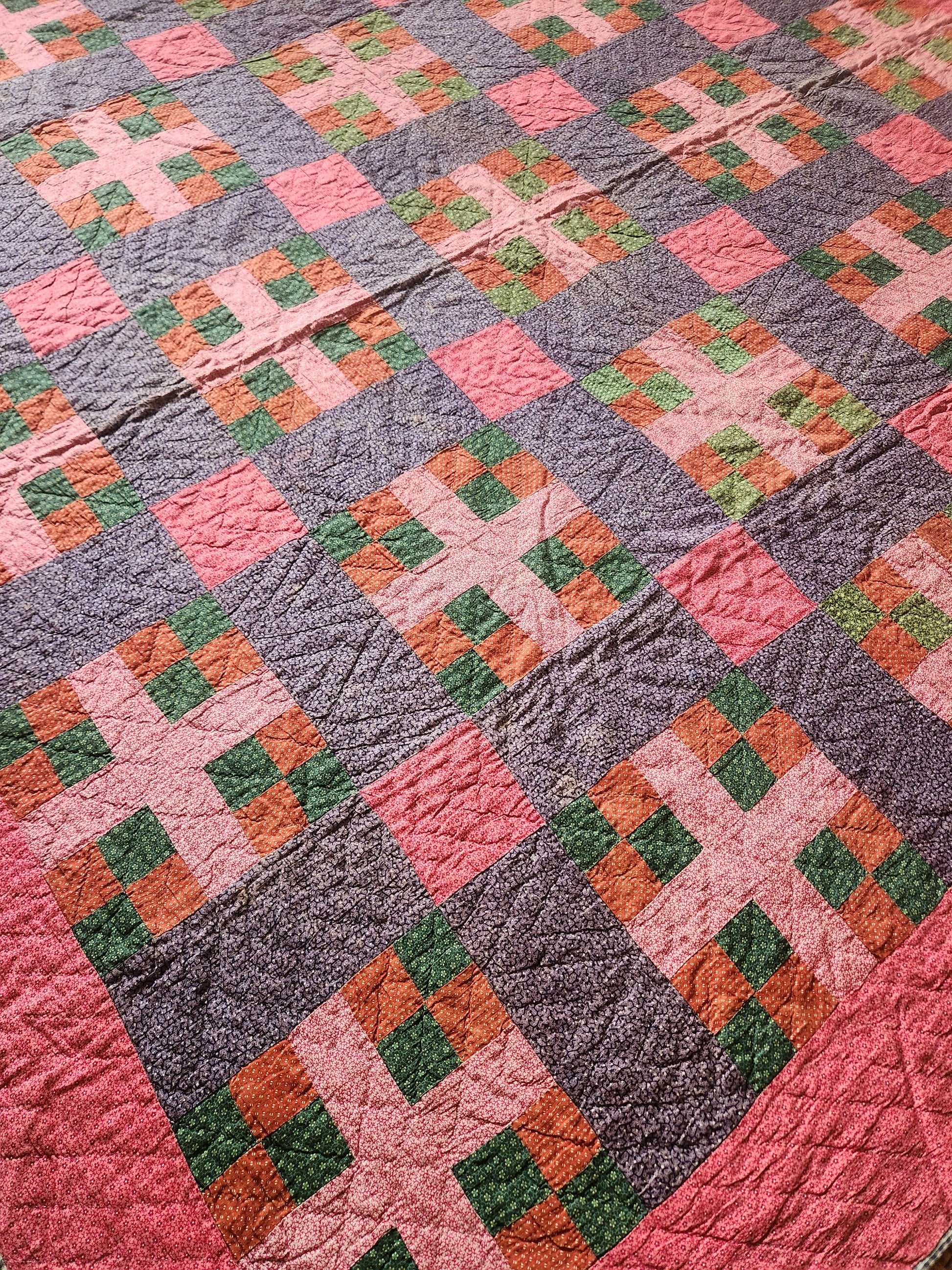 This is the match to the first calico quilt listed here, the better of the two in terms of condition. Hand pieced and hand quilted. Gorgeous, rich colors in reds, purples and greens. Purple is typically a color we see lose saturation, so it's wonderful to sww it so bright and true here still.