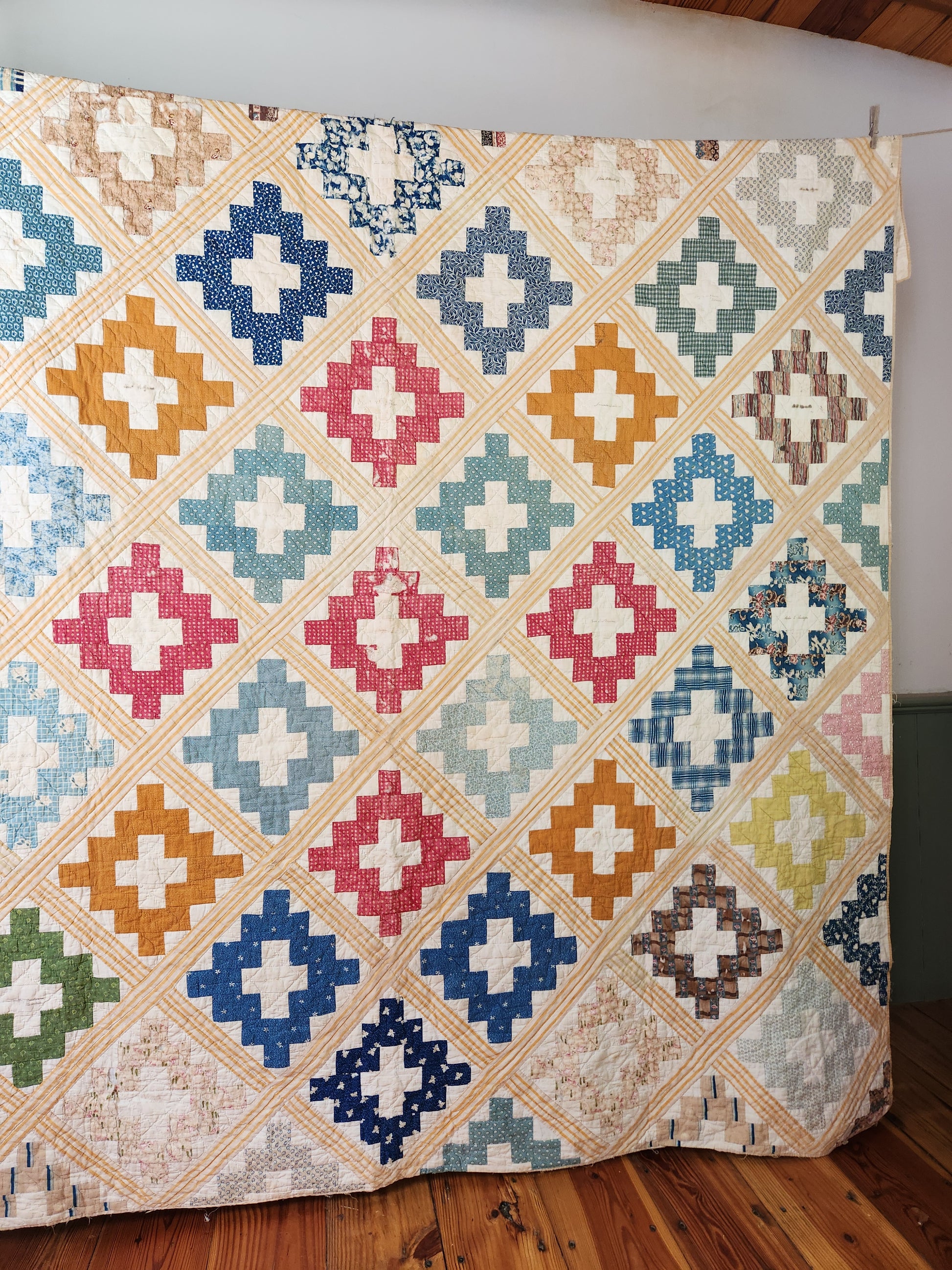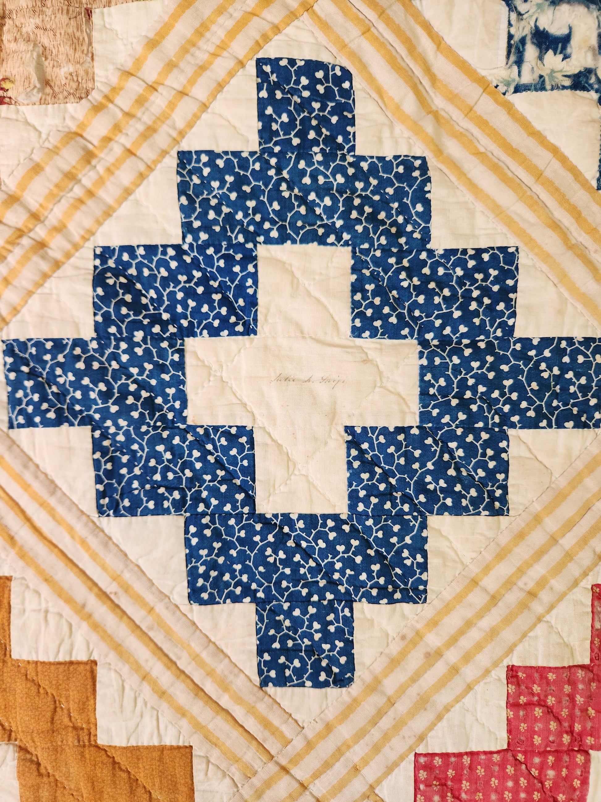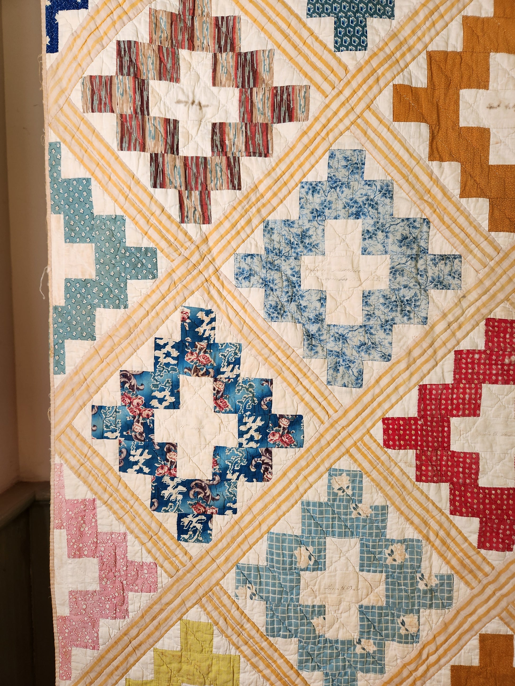 Wow! The colors and dyes on this 1850’s album quilt are to die for with chromes and prussian blues stealing the stage, supported by various other lovely florals and prints. There are signatures in every block center, with a few lost or blurred with time. Many names are discernible offering ample research opportunities.