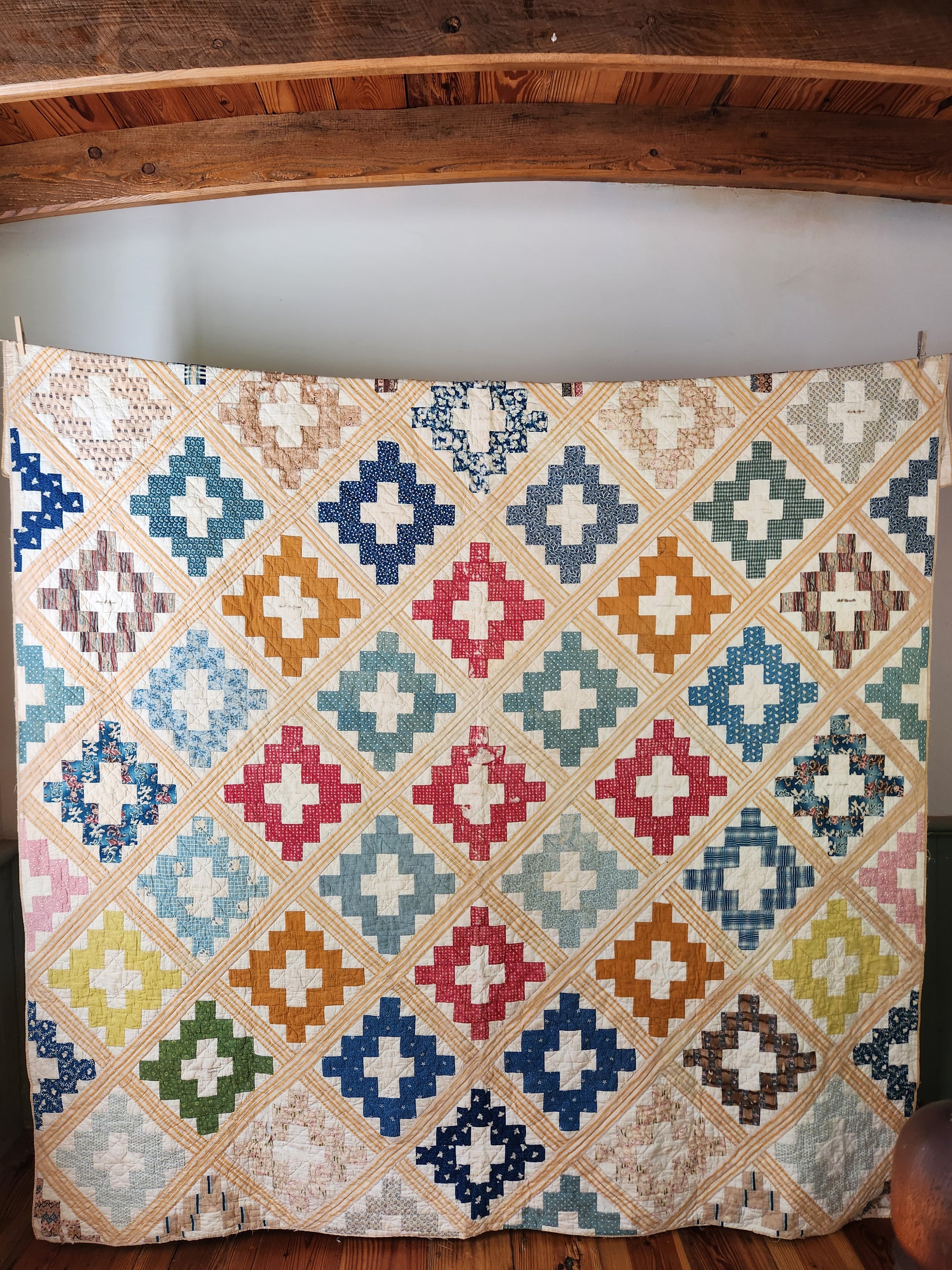The locations are listed as Lebanon and Watertown suggesting a New York provenance. There are many areas of wear and some fabric loss. This has been aired, unwetted to protect the ink signatures. There are some water stains to the backing. From the striped sashing to the bold blocks, this quilt displays beautifully.