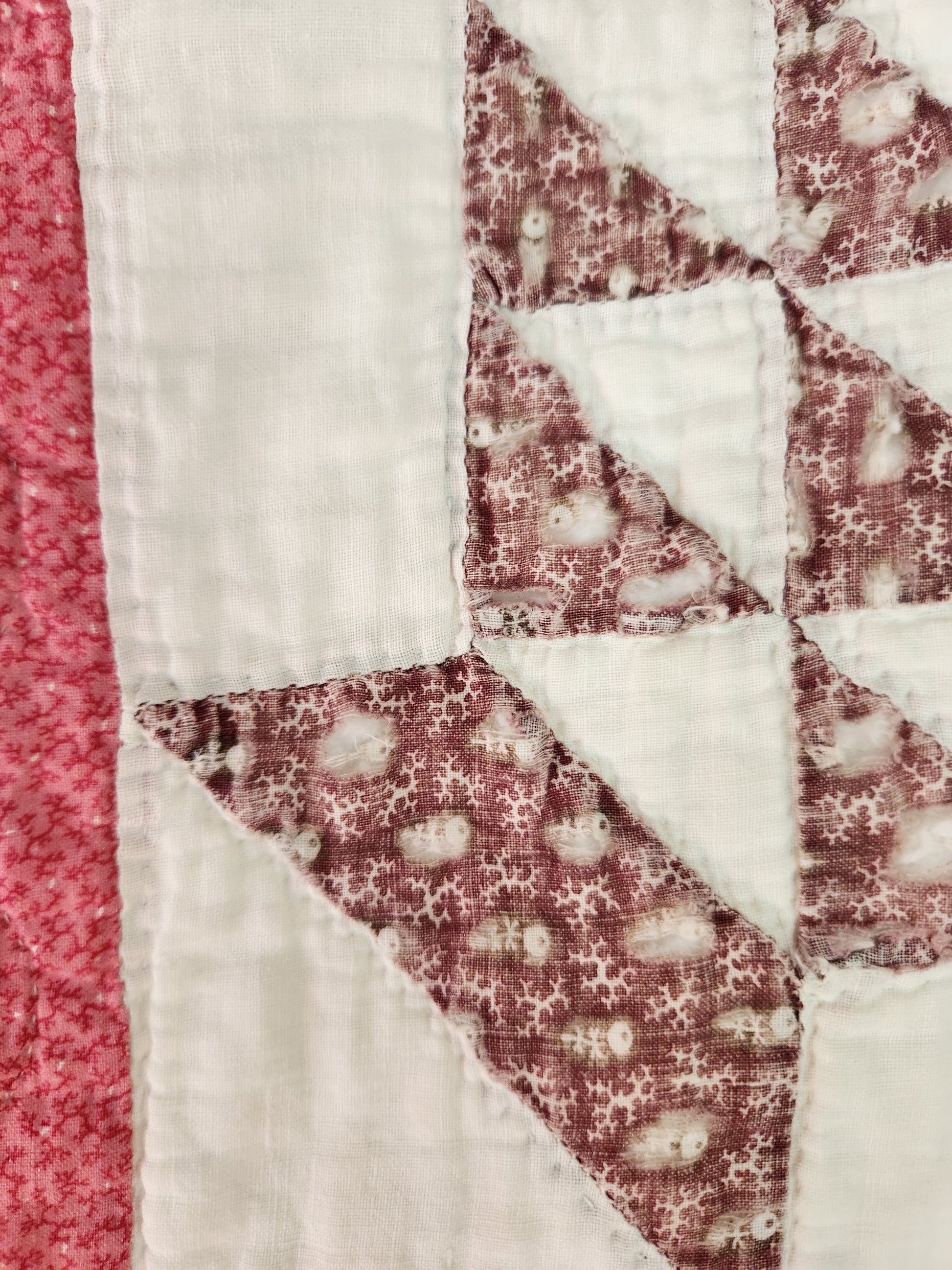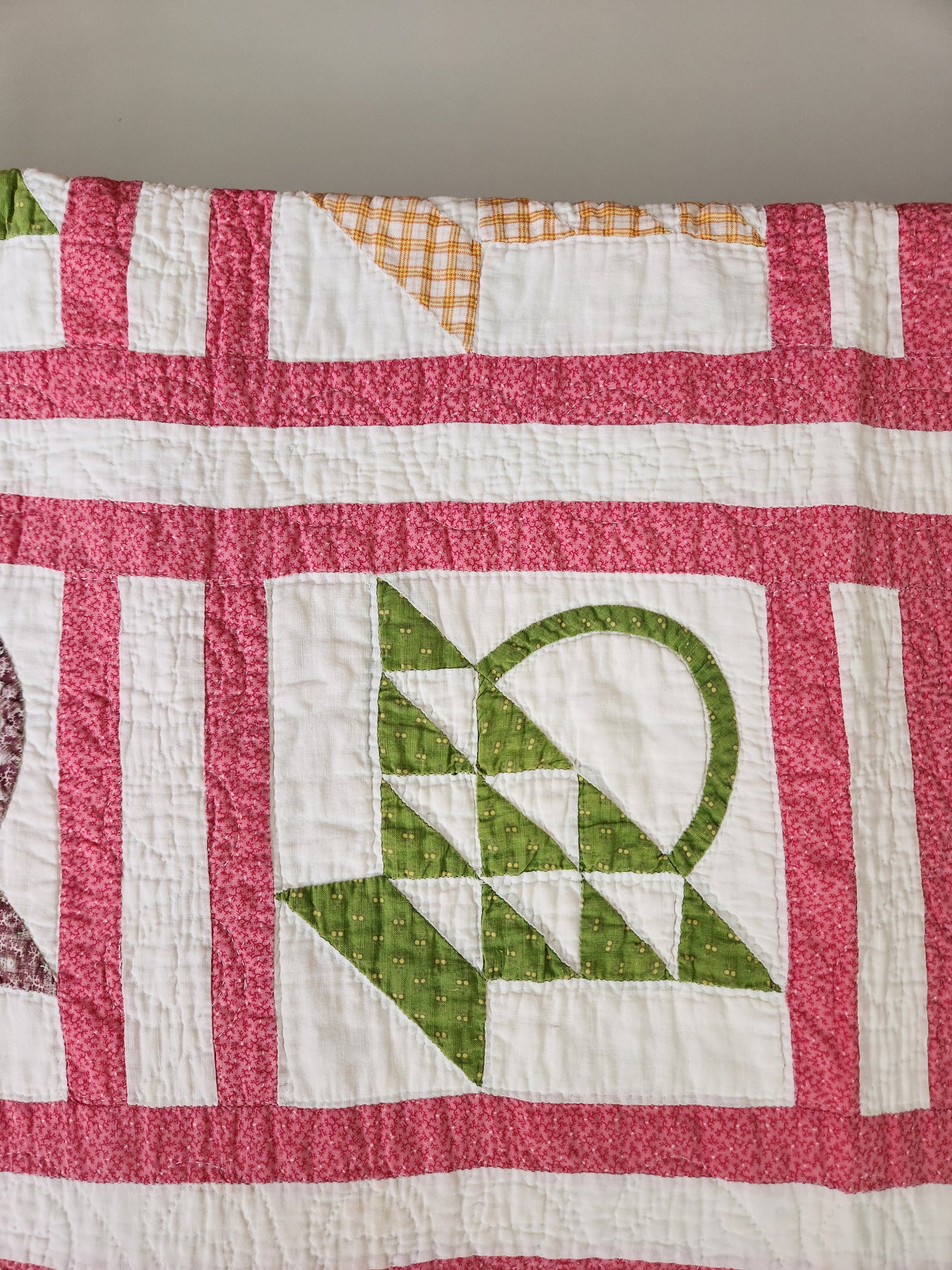 A cheerful, bright basket quilt from the late 1800s with a uniquely designed double pink sashing. It is hand pieced and hand quilted, and the colors are so bright. Note the curling wave motif quilted into the sashing and borders.