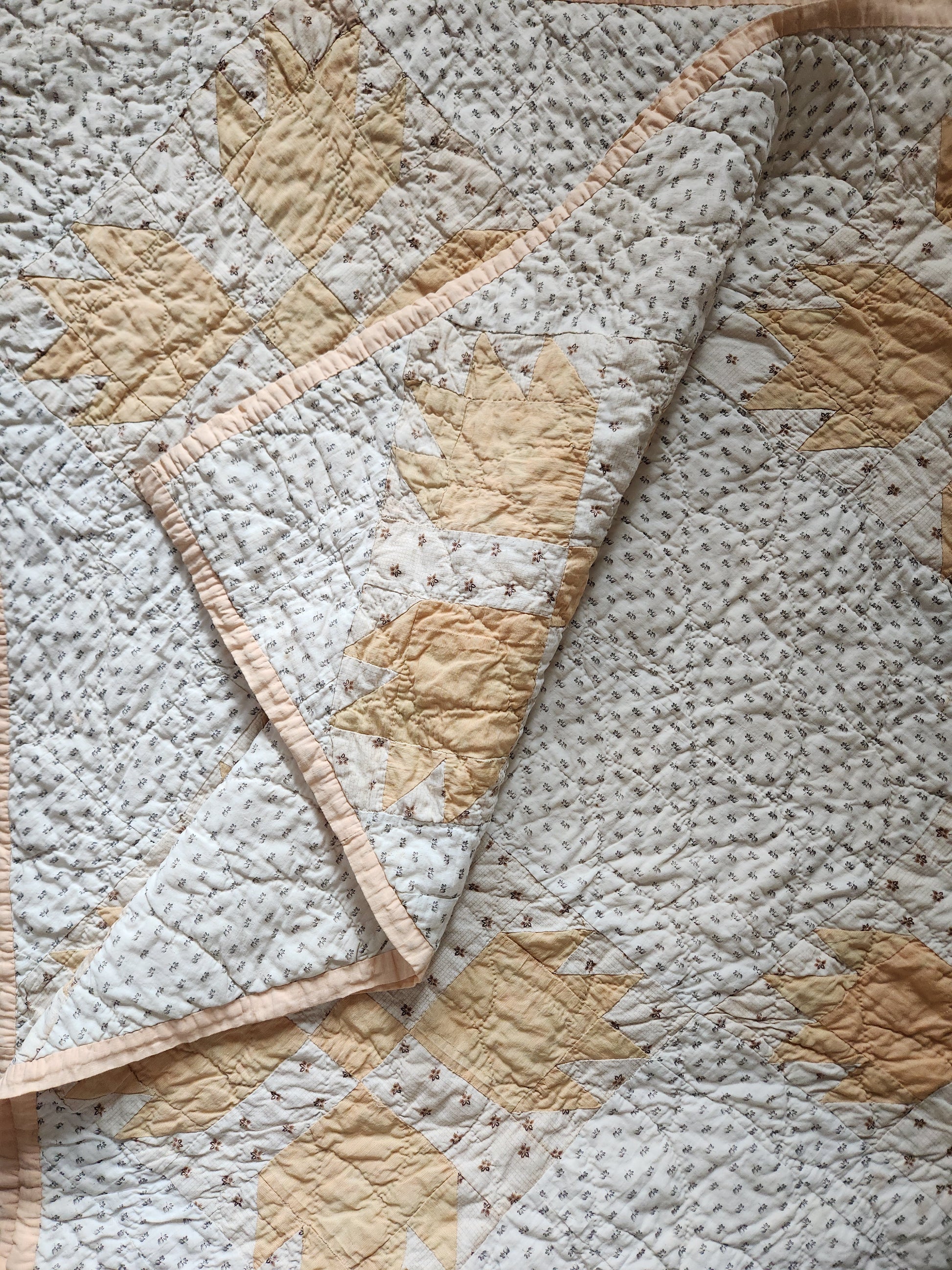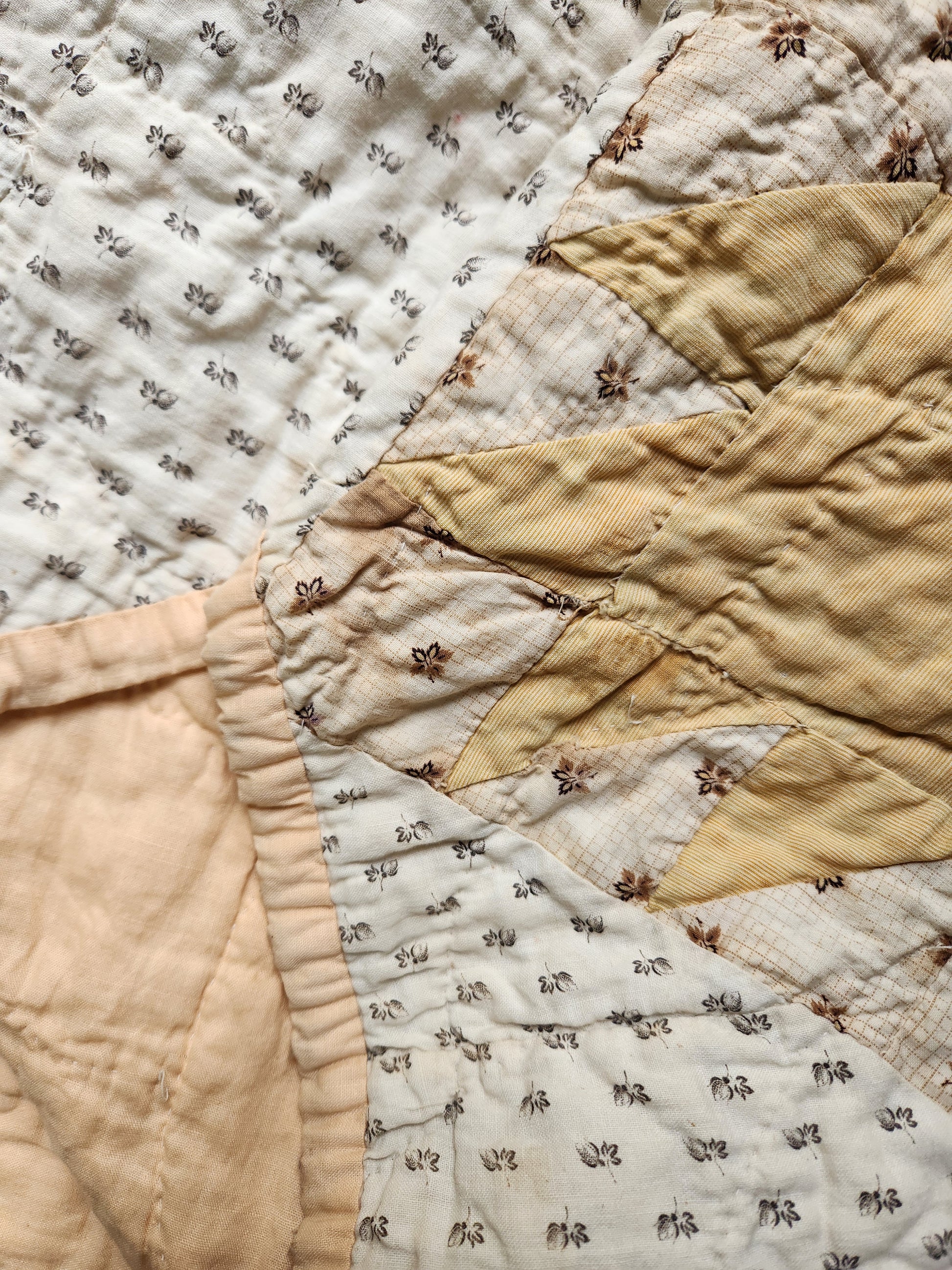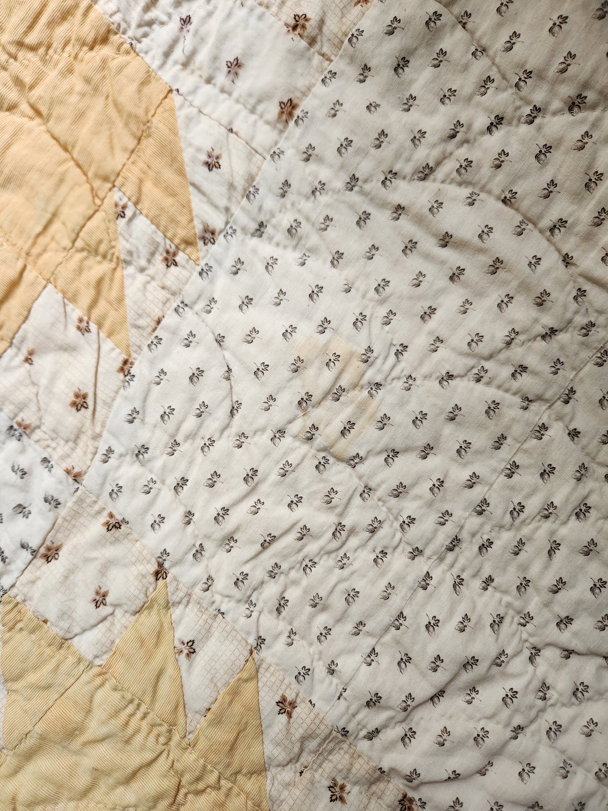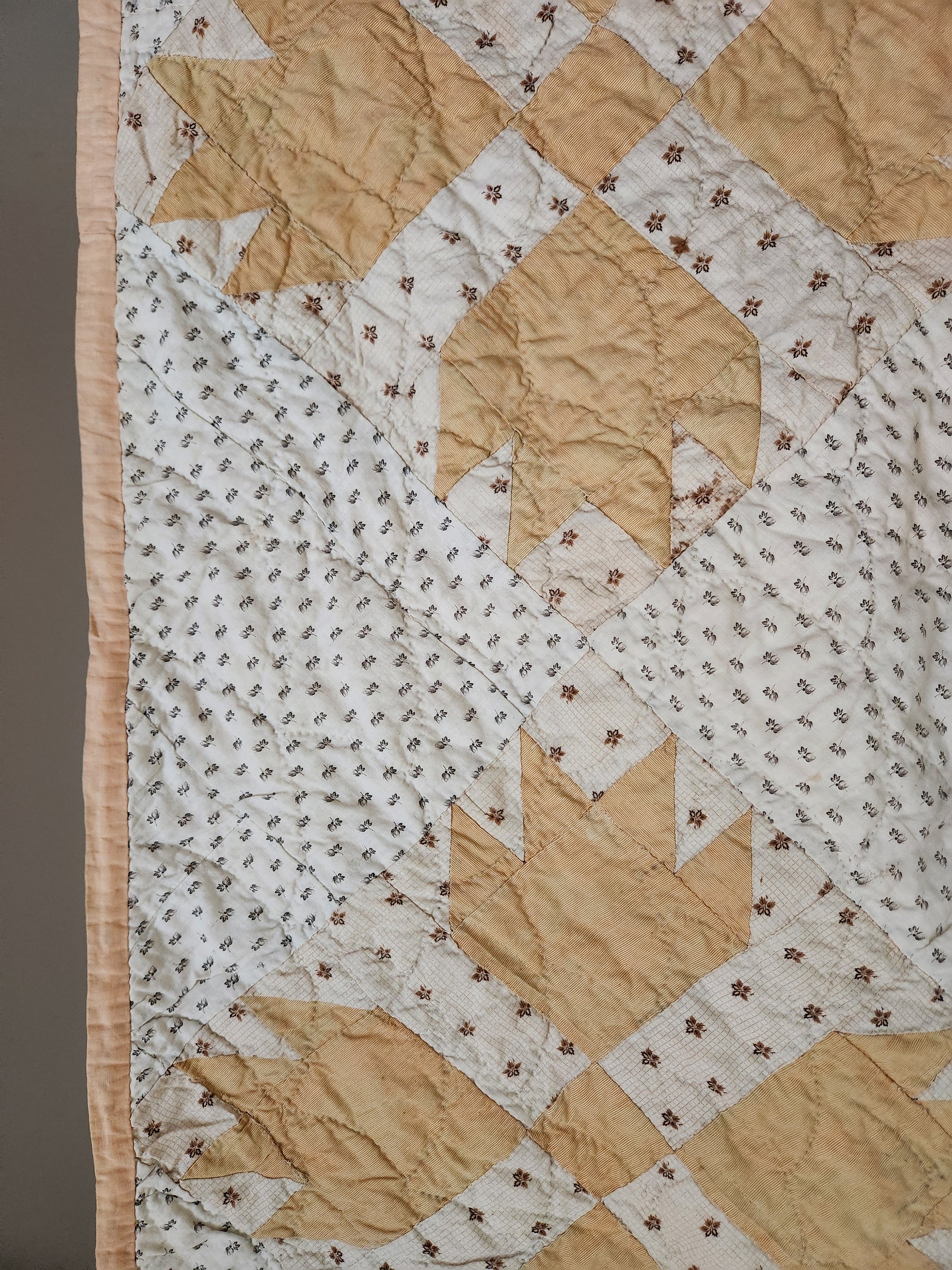 Freshly washed, this sweet bear paw quilt is constructed of two different, late 19th century prints with figures of leaves. One is in a brown color palette and the other a black figure on a white ground. The paws are a white and chrome orange micro-stripe. It is hand pieced and hand quilted.
