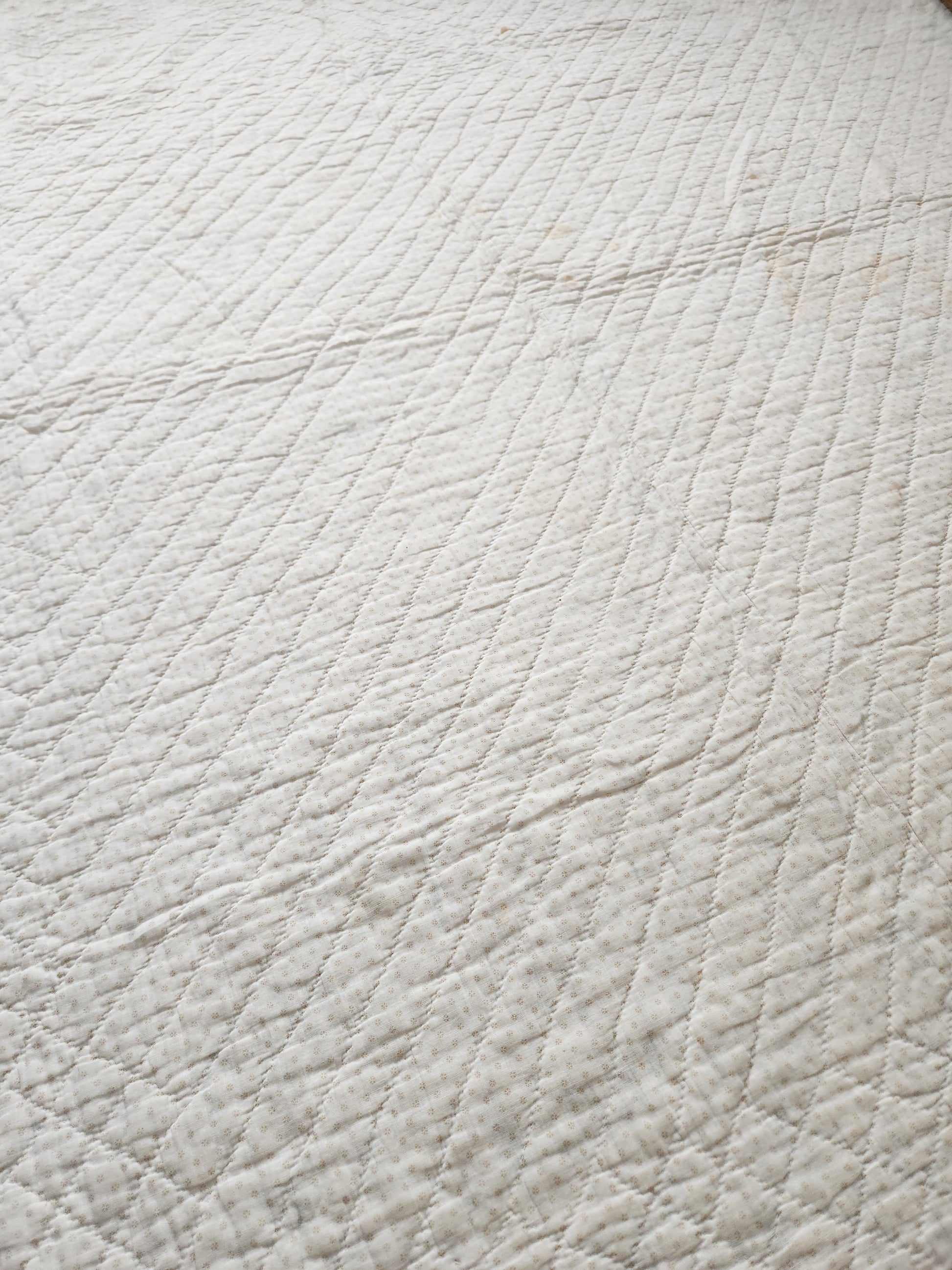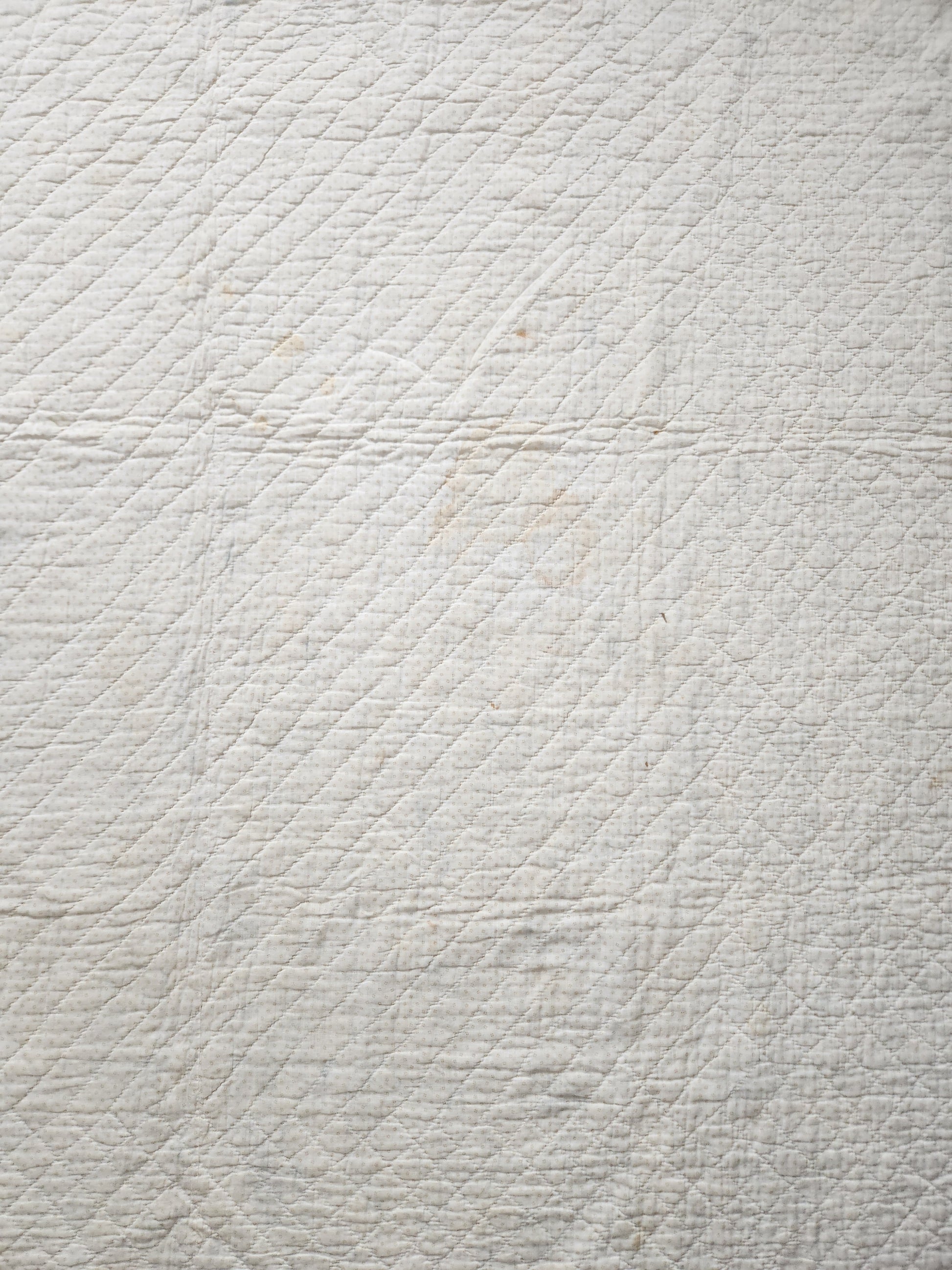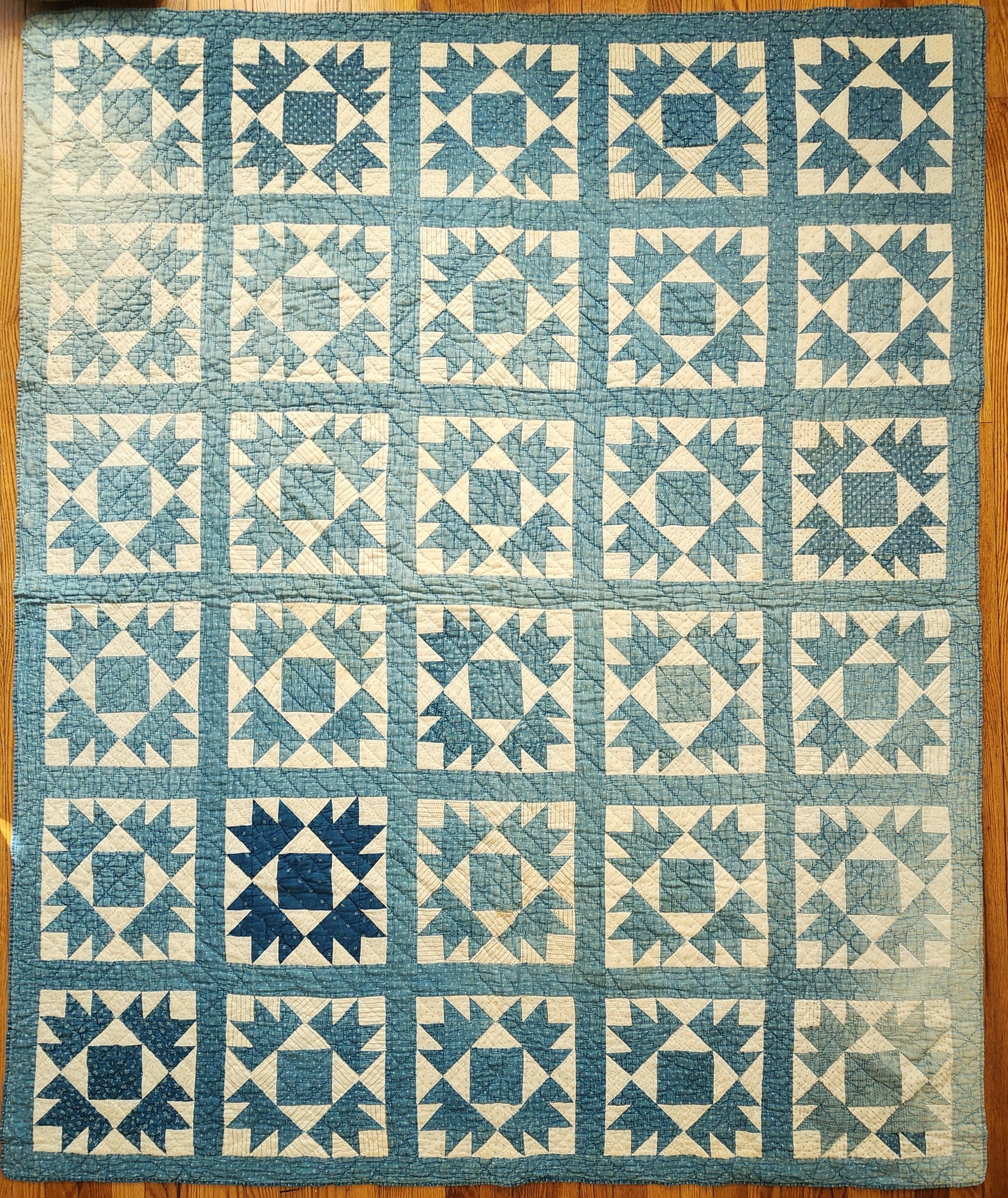A gorgeous, hand stitched antique quilt in classic white and blue combos. Lots of Indigo and other shirting fabrics. It is loved, and has some faded areas from light exposure. It's very soft and has a perfect, classic look and feel.
