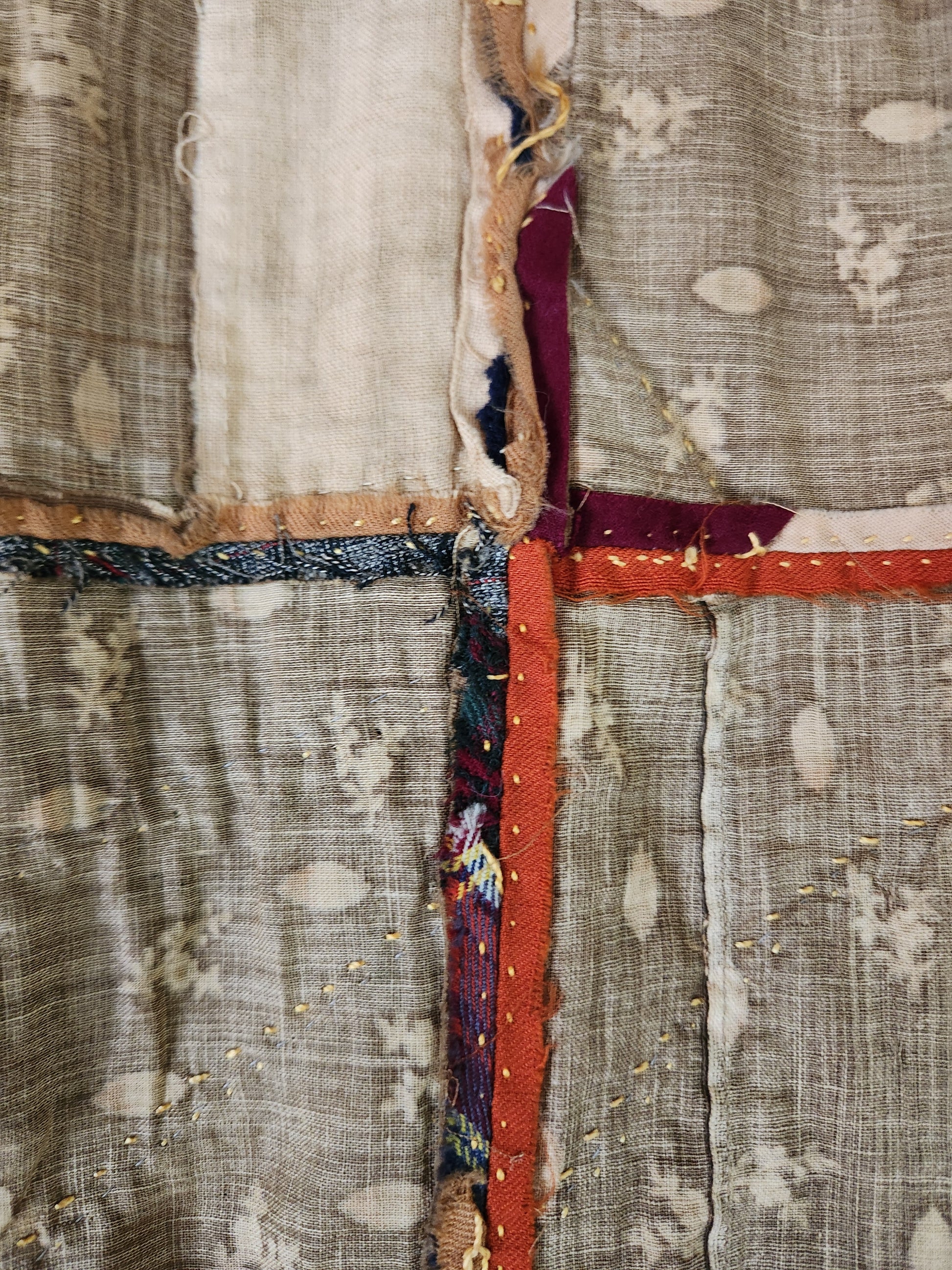 A fabulous, hand stitched crazy quilt in wools, tweed, and a little silk. Classic design in the late 19th century. This quilt, in a traditional “Crazy Quilt” style is complete with the classic hand embroidery to finish. It is unquilted, the foundation backing is visible (to our delight) and a black grosgrain ribbon has been added to finish the edges. From a private collection out of New York, this quilt has been well kept.