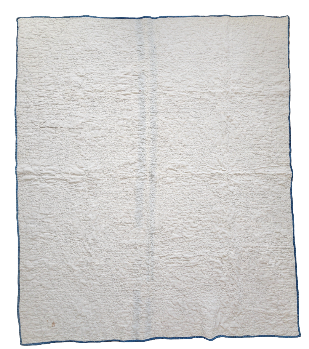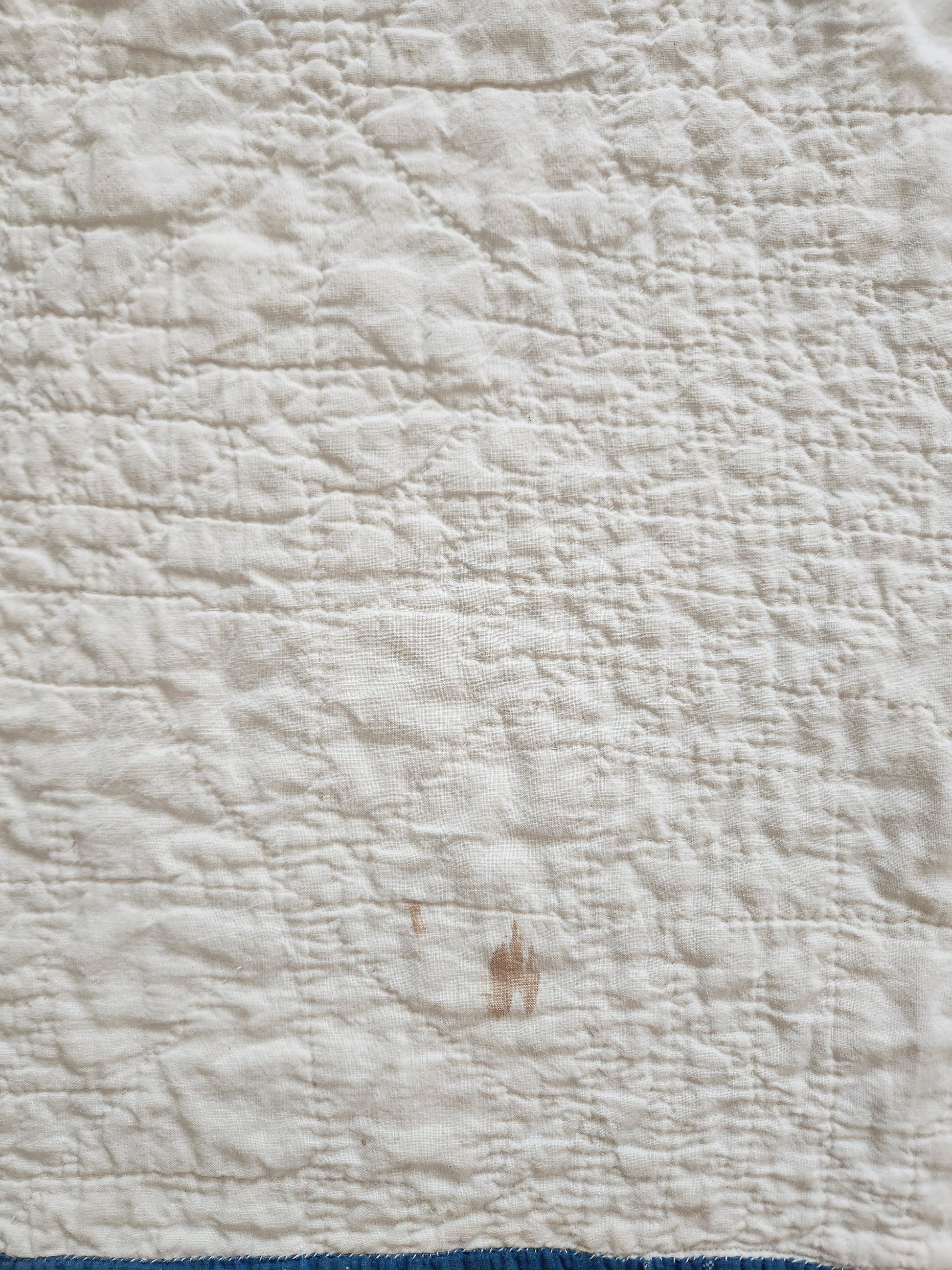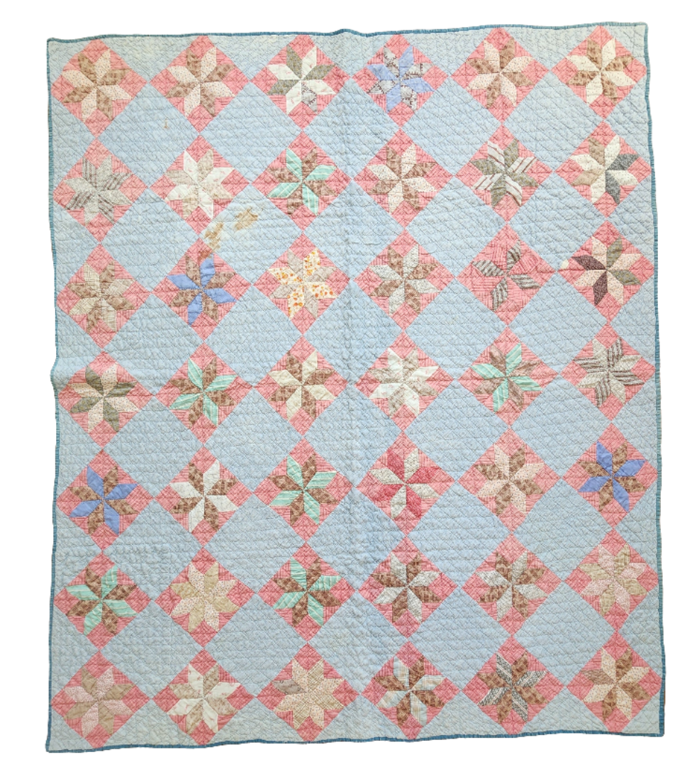 Condition: Good. The quilt is sound and soft, well stored. **There are two blotches of brown surrounded by some localized fade in one blue block in the upper left quarter. There is one small, coin-sized mend done by hand on a right hand star as shown. Some other minor thinning to a few diamonds here or there. The back is clean and bright.