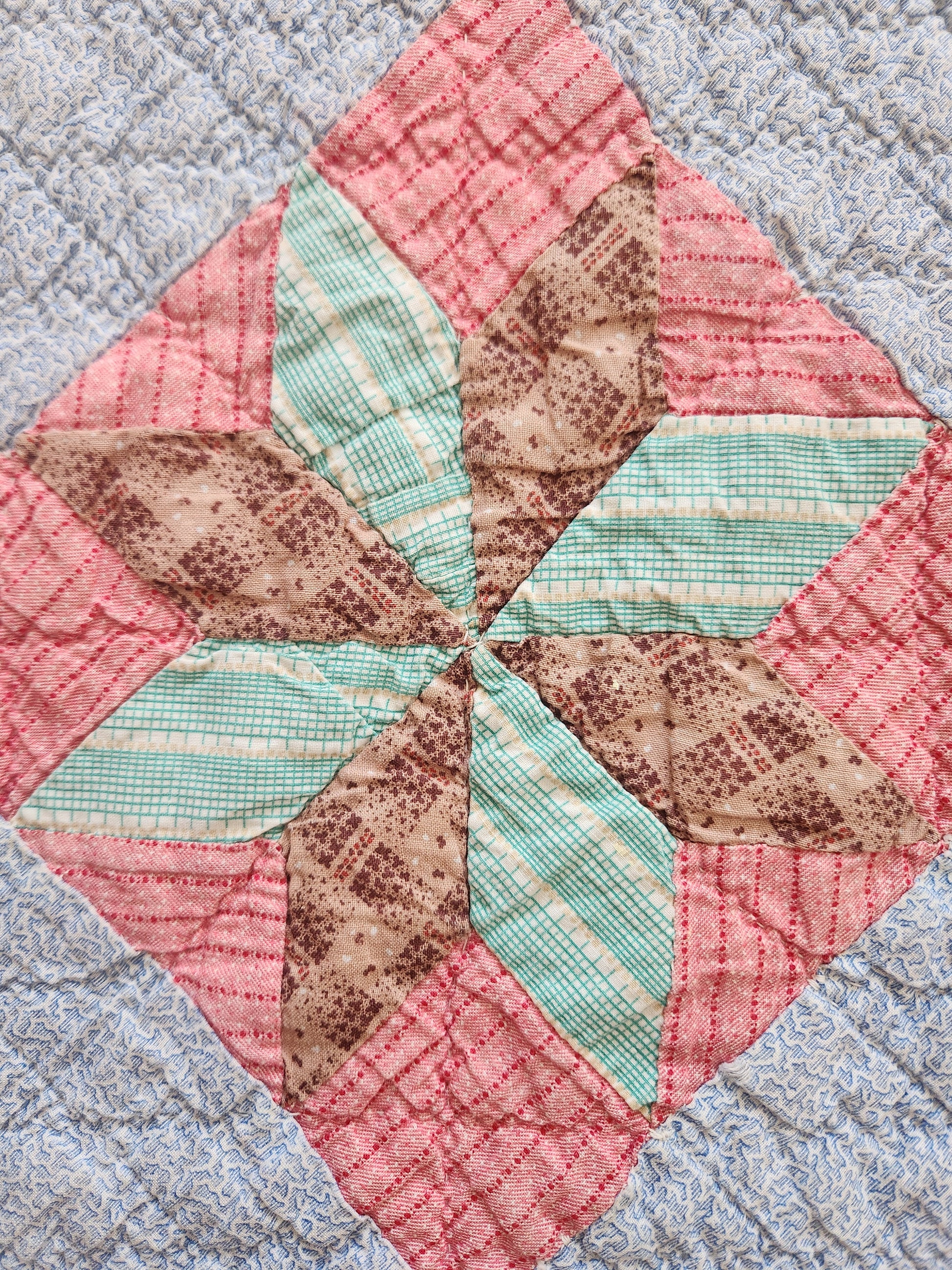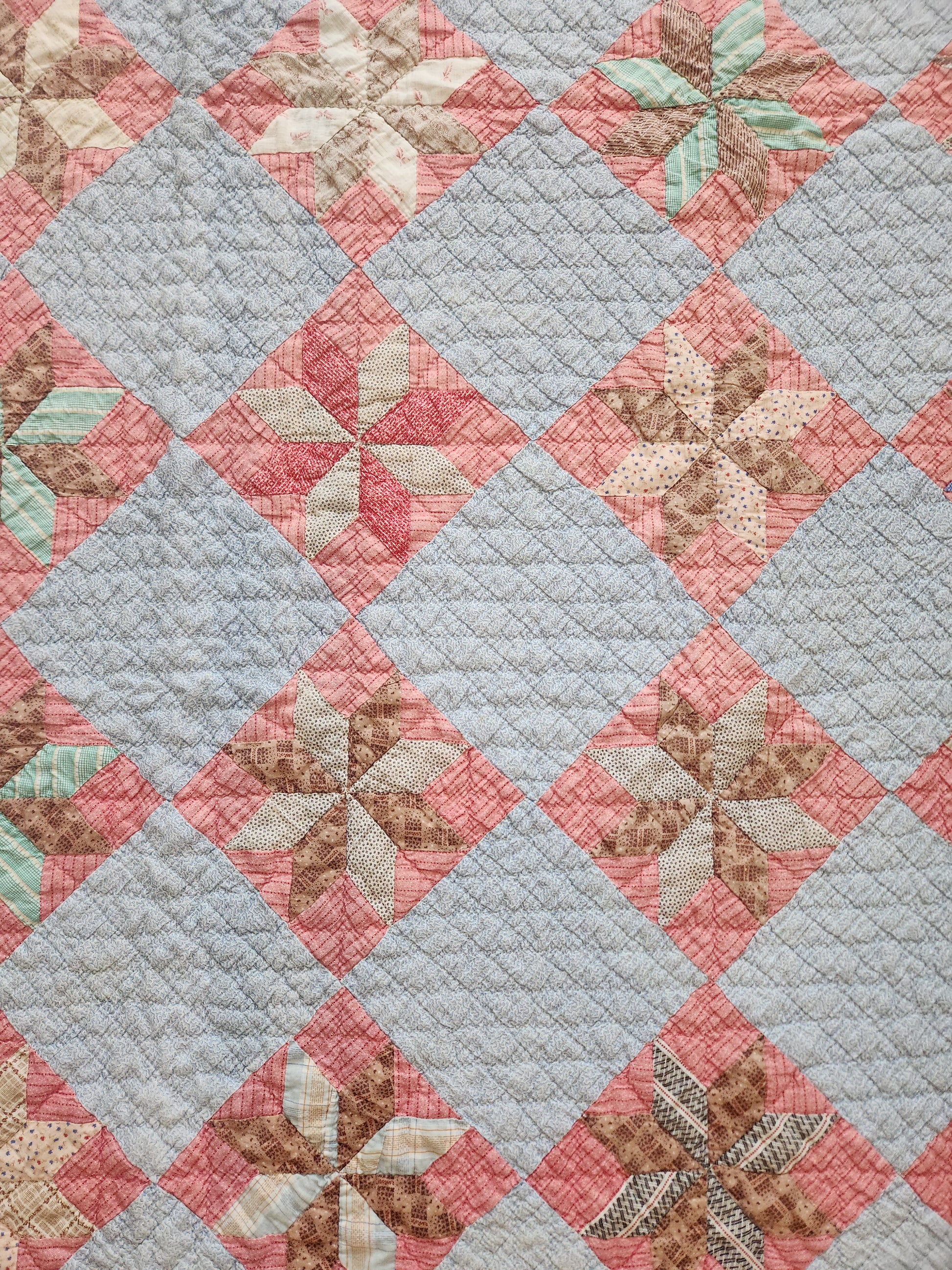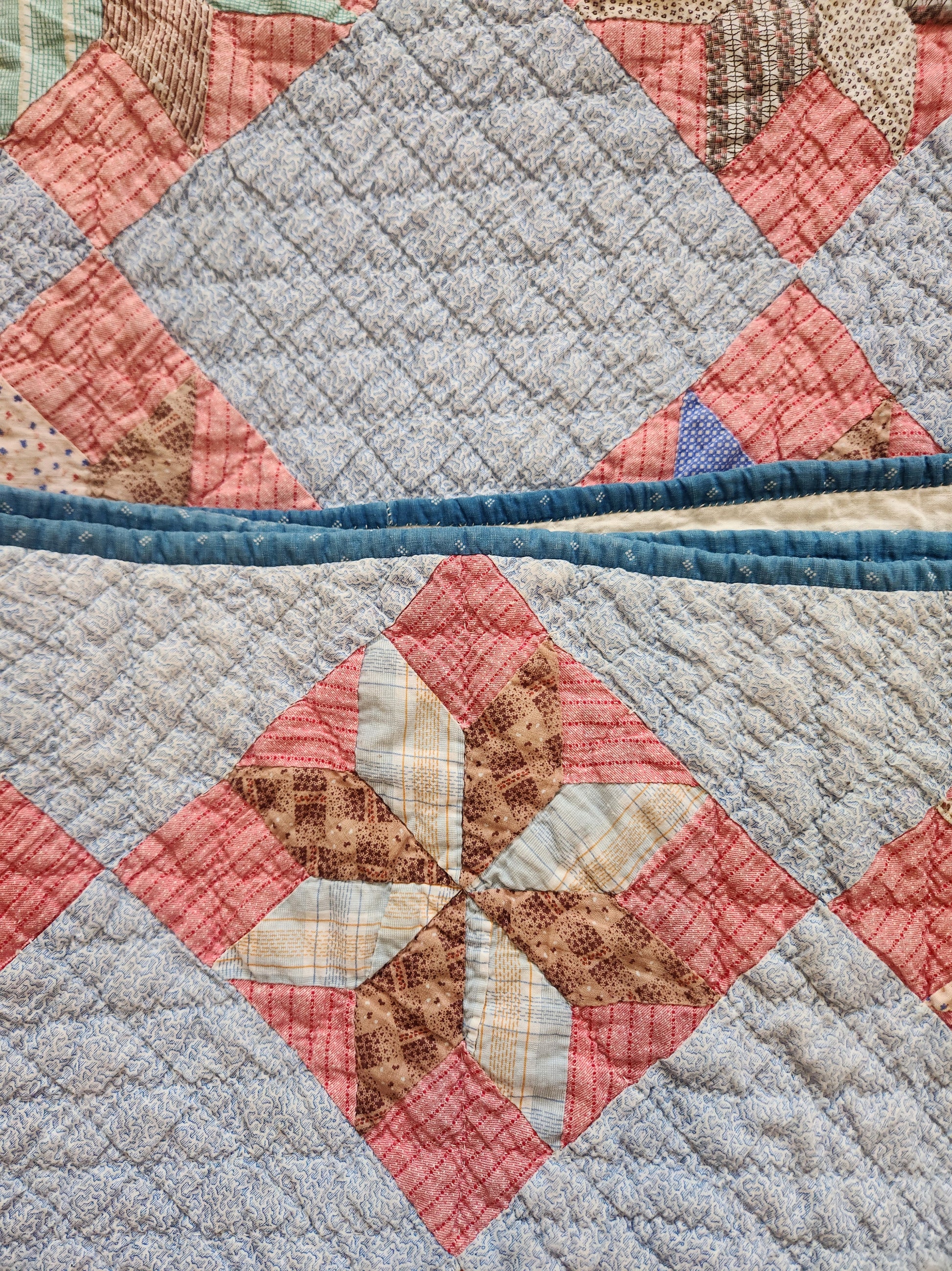 A gorgeous, hand pieced and hand quilted patchwork quilt in eight point star blocks. The star blocks are sent in a double pink stripe, on point, and alternate with a pale blue vermicelli print cotton. The stars are comprised of wonderful shirtings in pinks, blues, greens and browns of the late 1800s. The binding is a lovely, hand stitched blue.