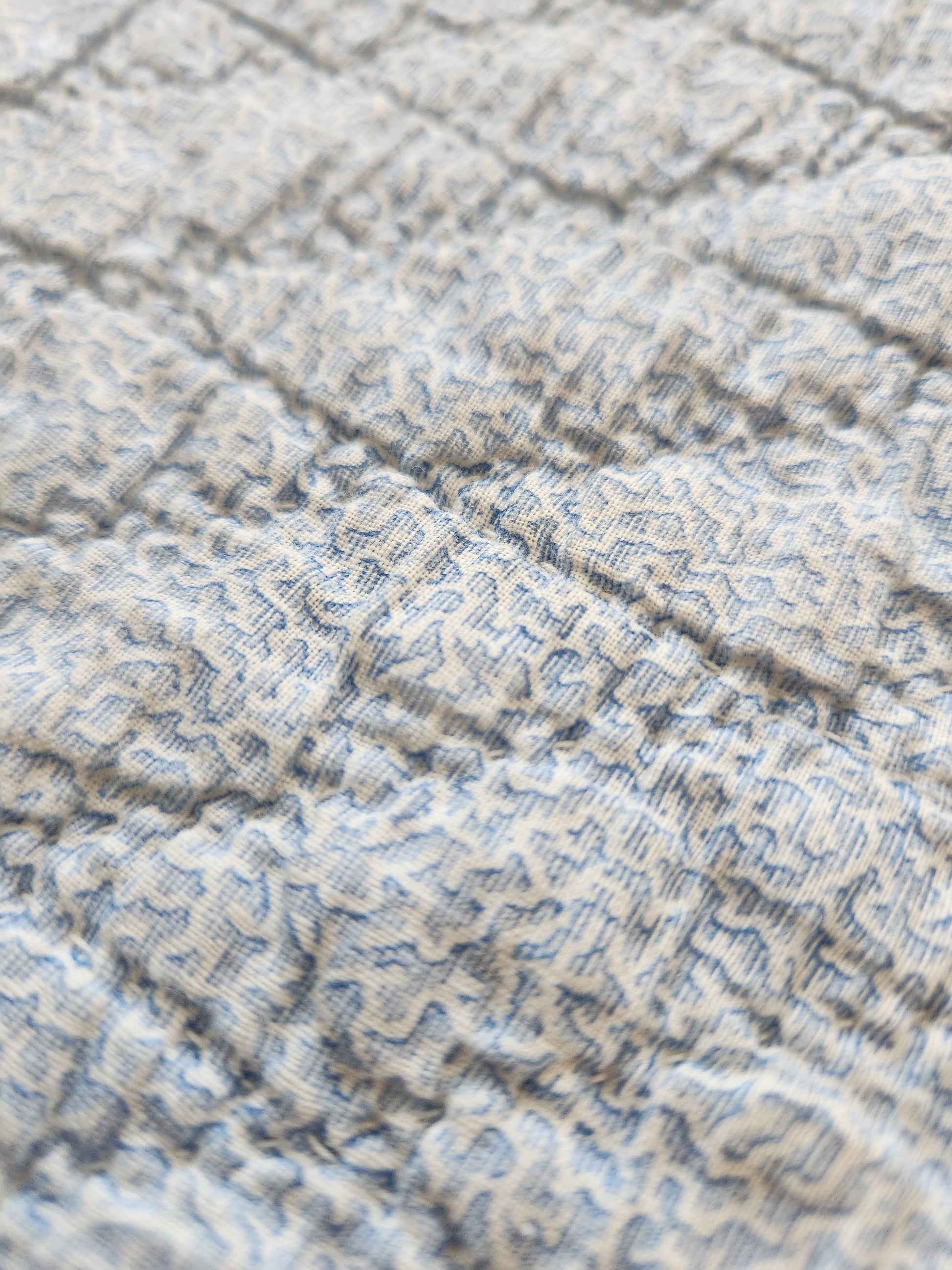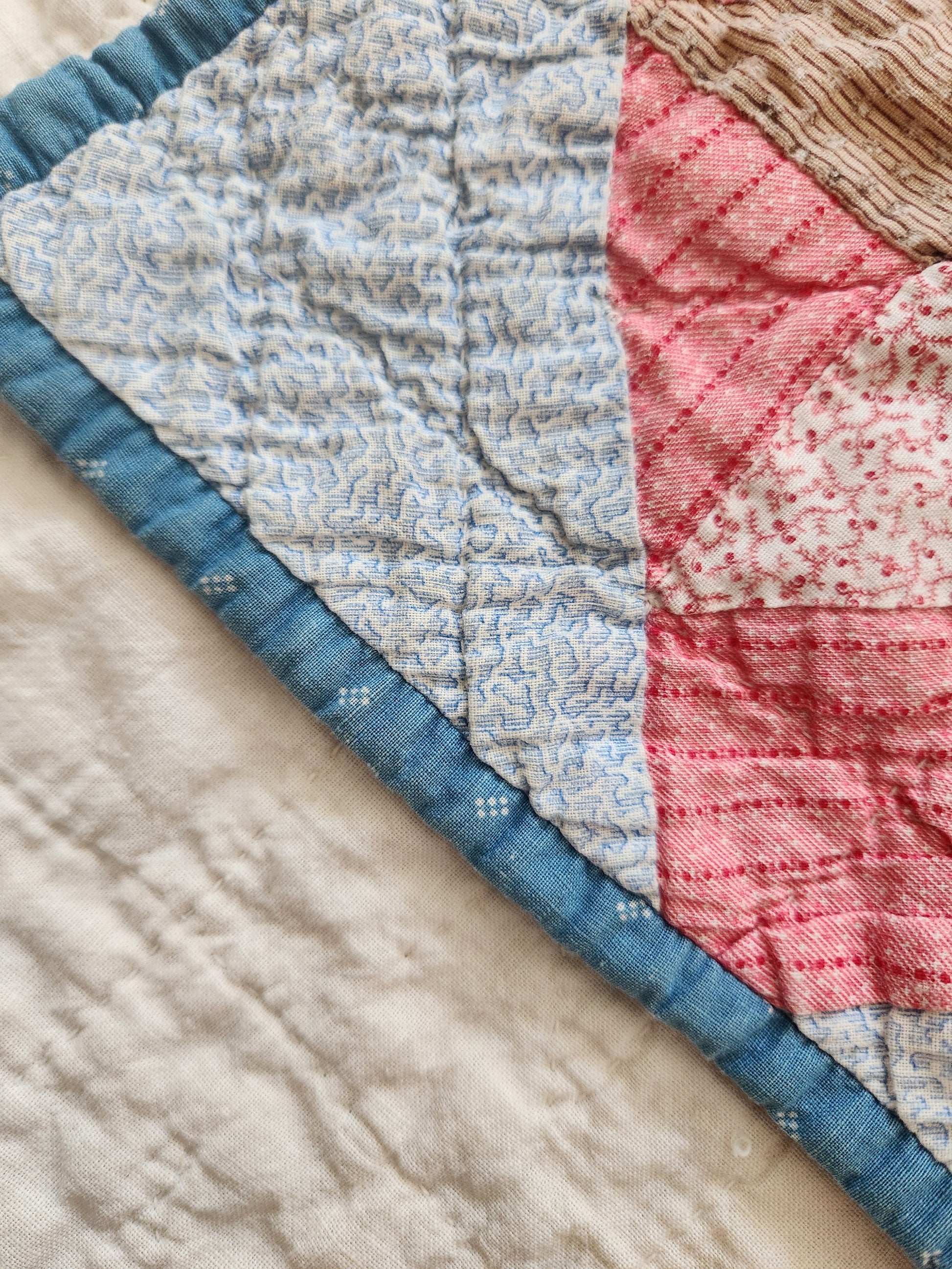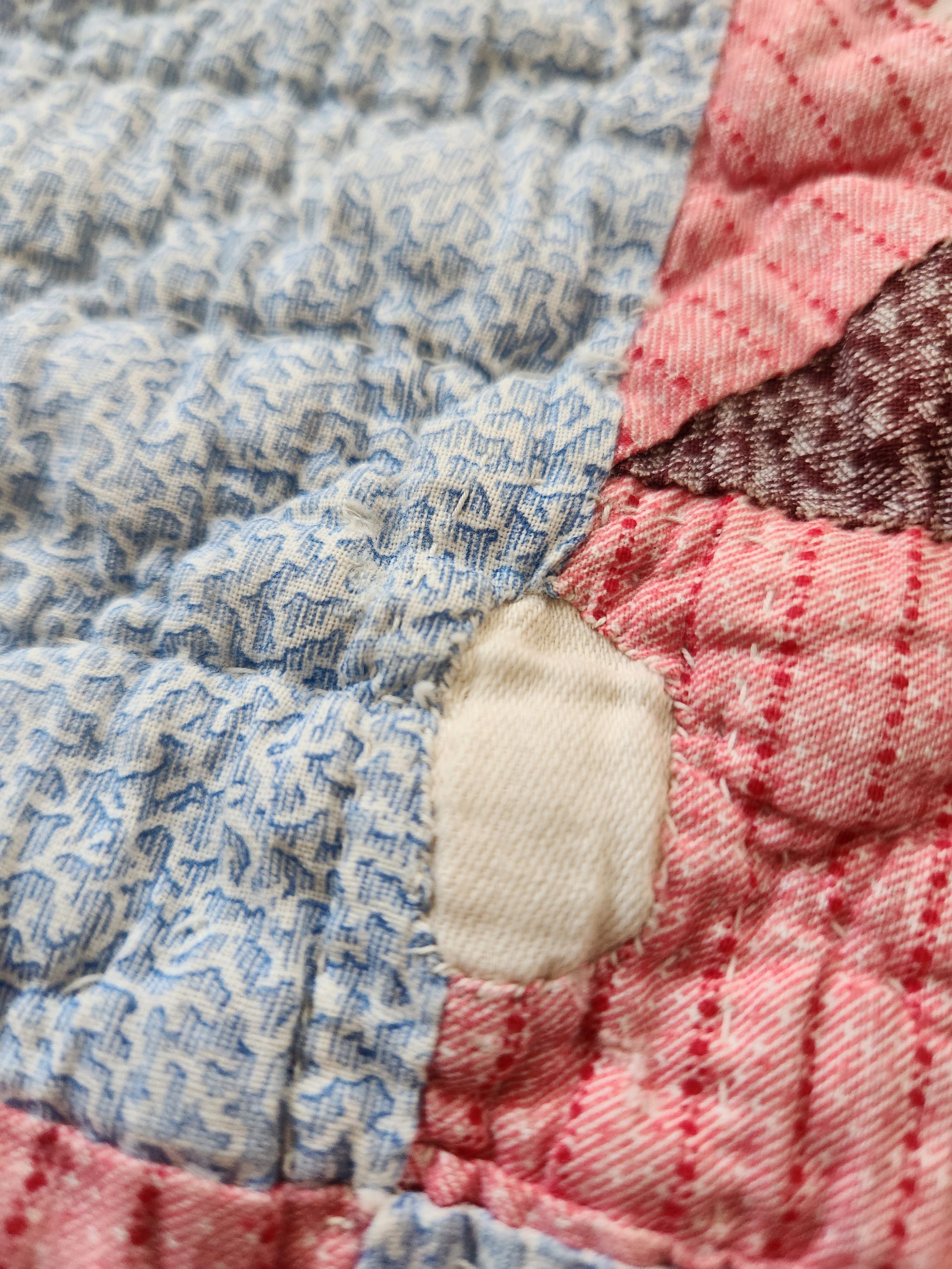 A gorgeous, hand pieced and hand quilted patchwork quilt in eight point star blocks. The star blocks are sent in a double pink stripe, on point, and alternate with a pale blue vermicelli print cotton. The stars are comprised of wonderful shirtings in pinks, blues, greens and browns of the late 1800s. The binding is a lovely, hand stitched blue.