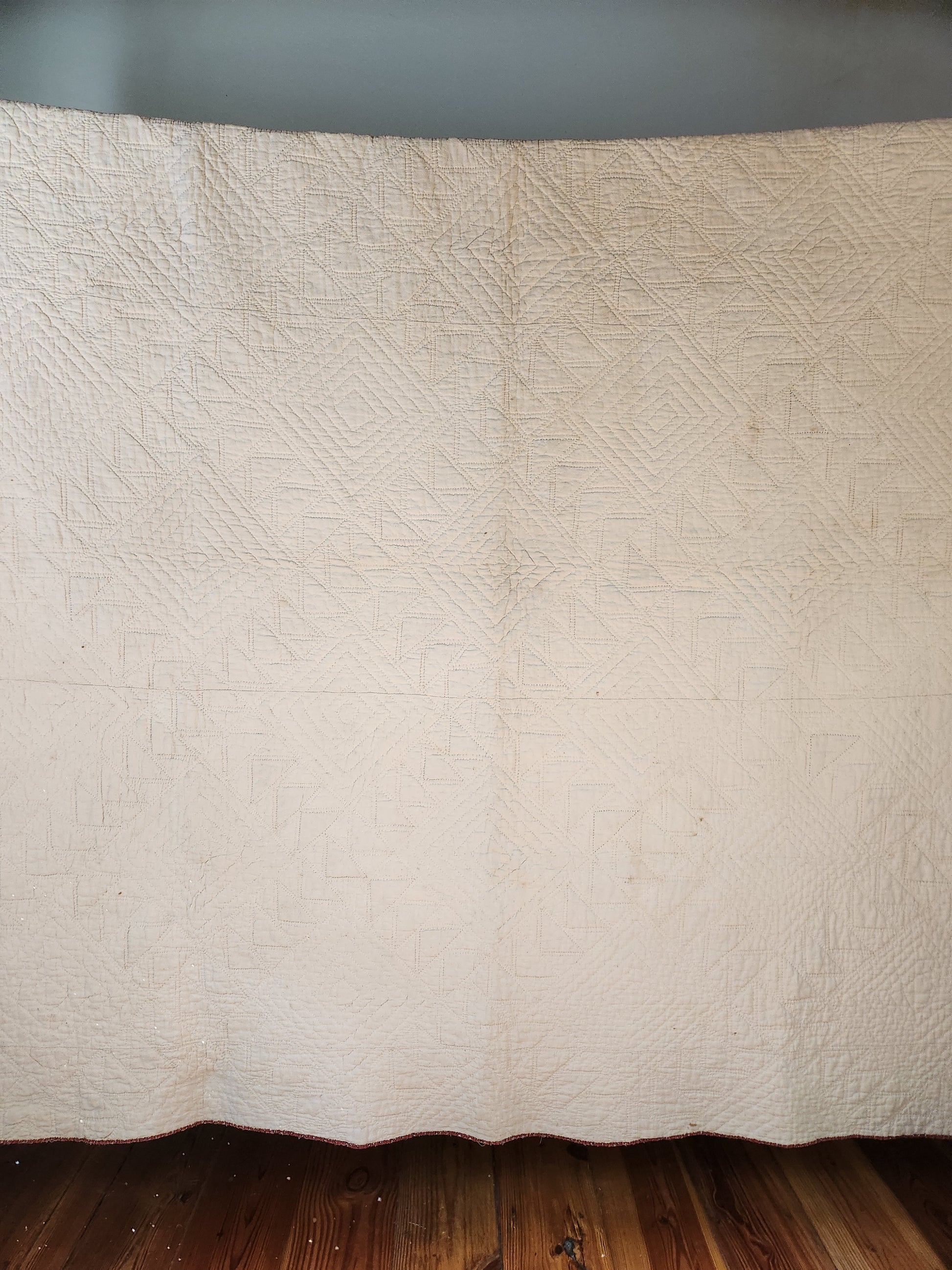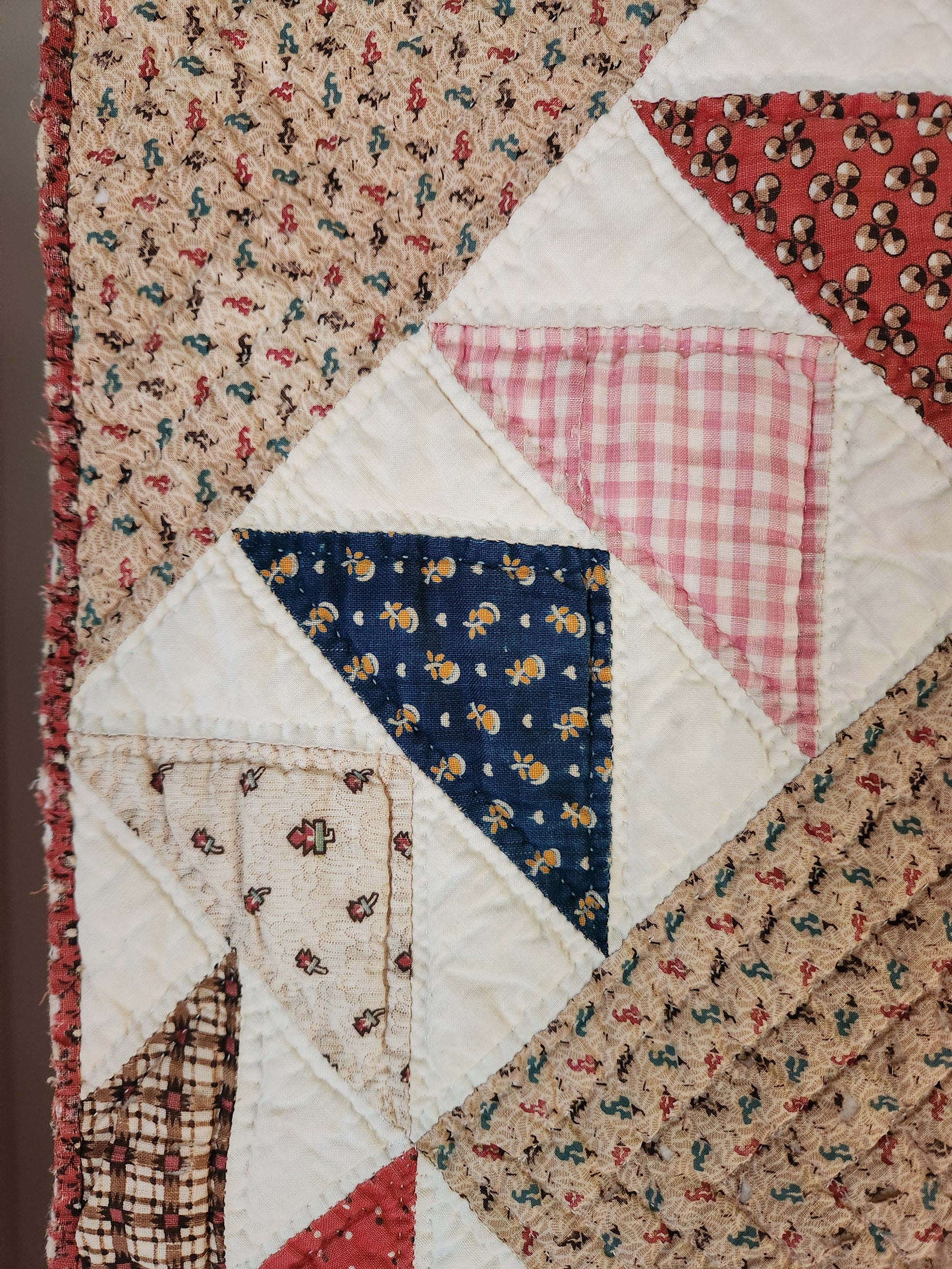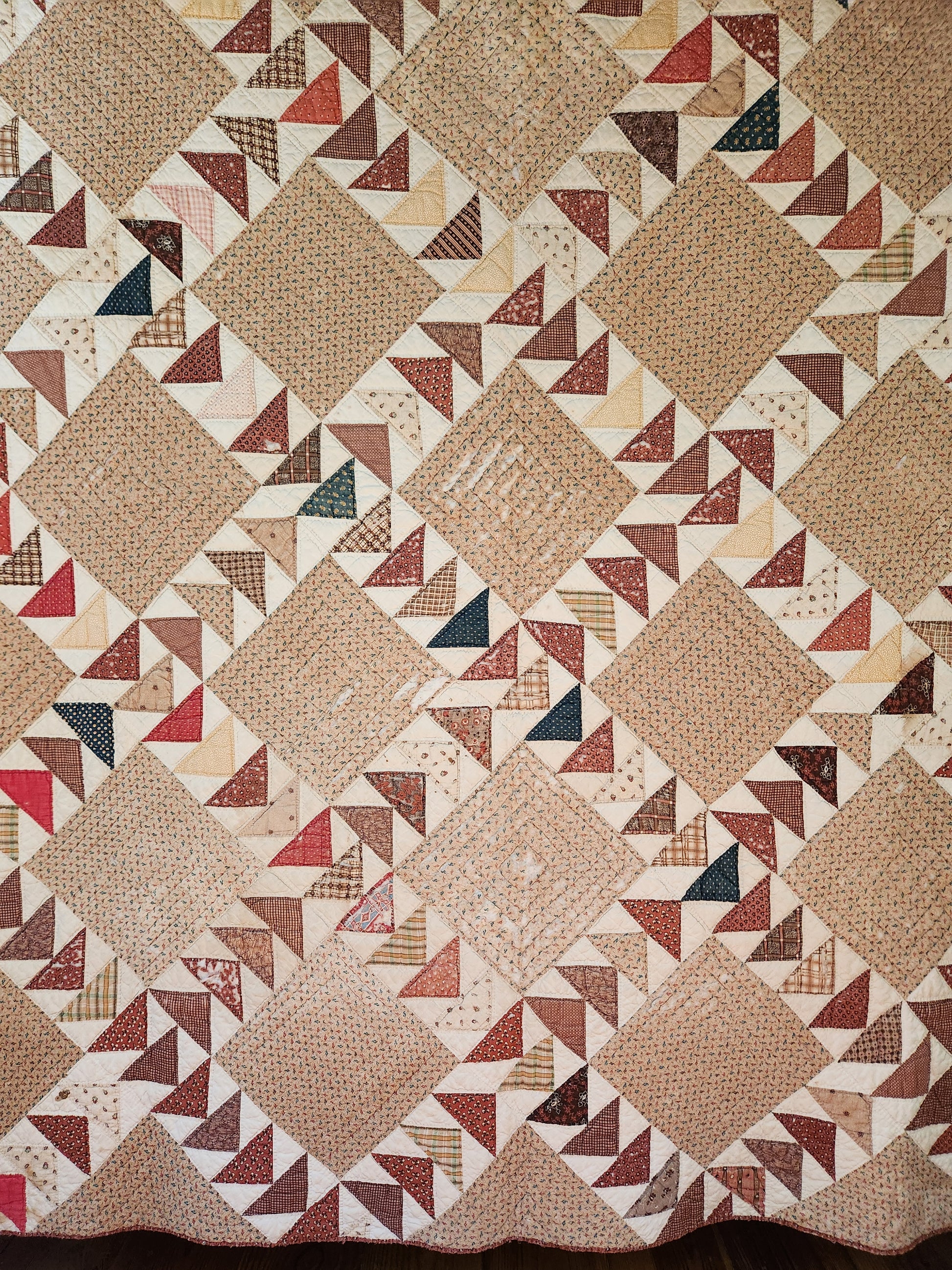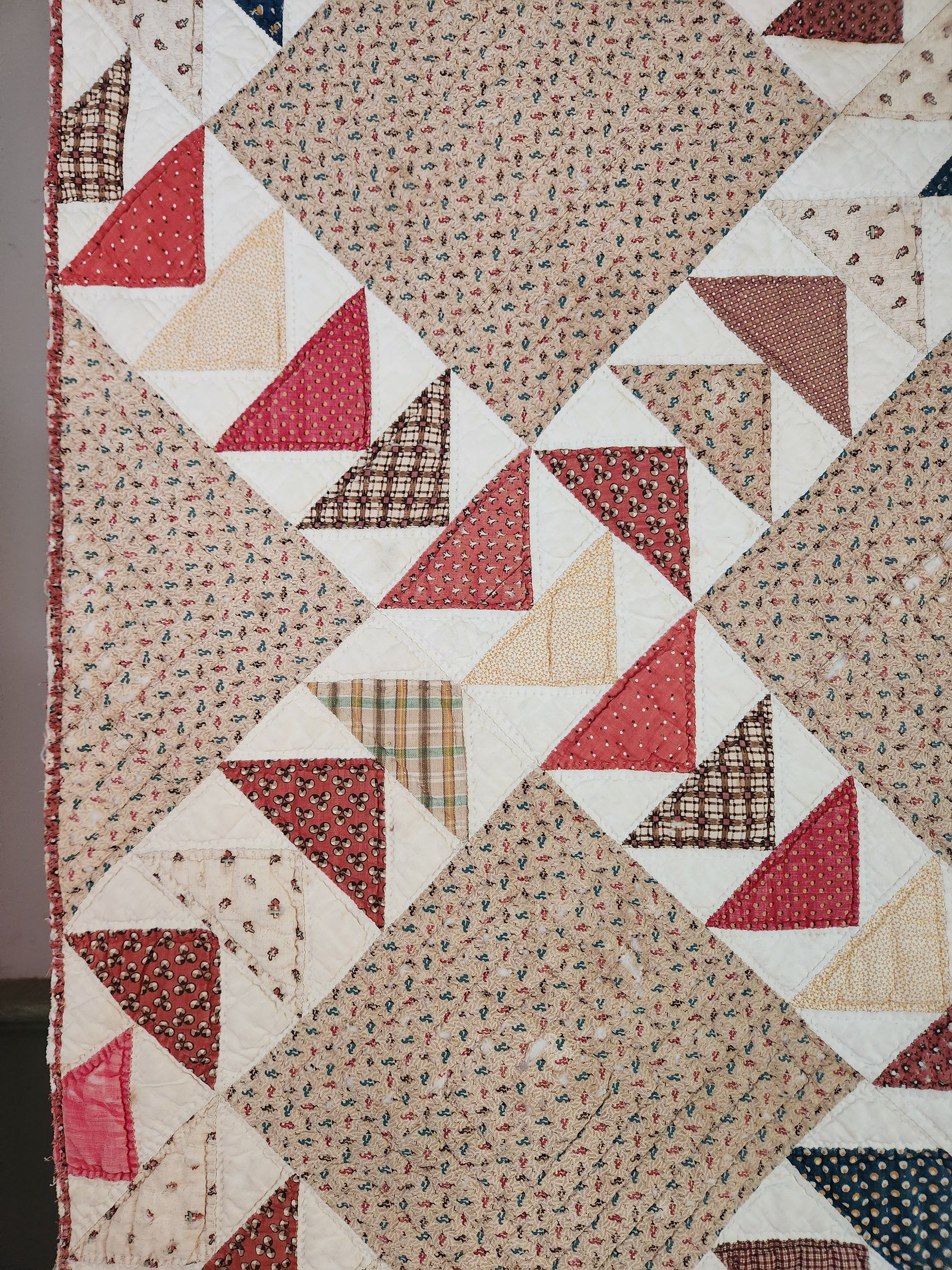 Condition: Fair. Some fabric loss particularly to the solid, tan blocks at center. Binding worn and some triangles showing fabric loss. A few small water marks. Has been aired.