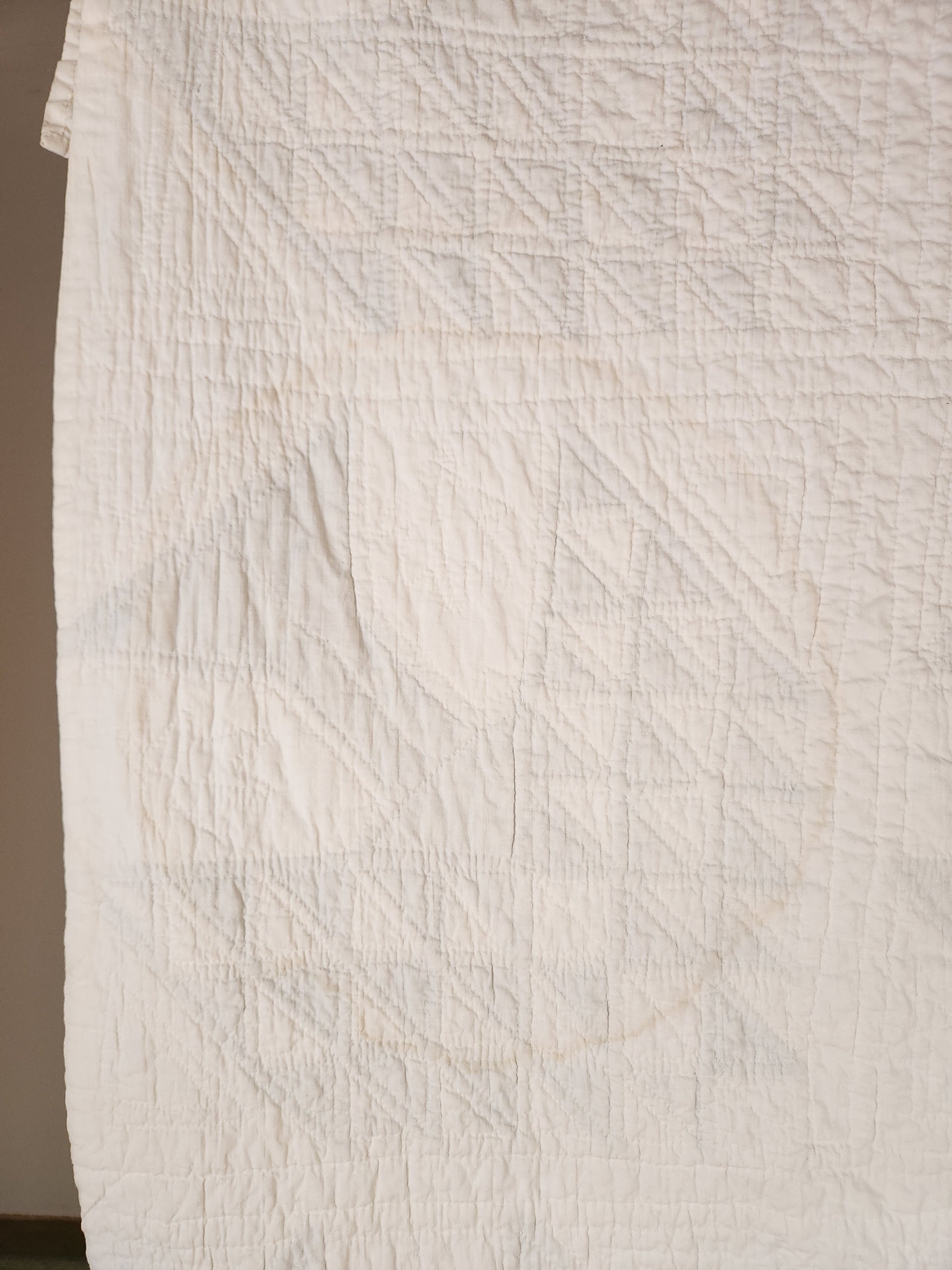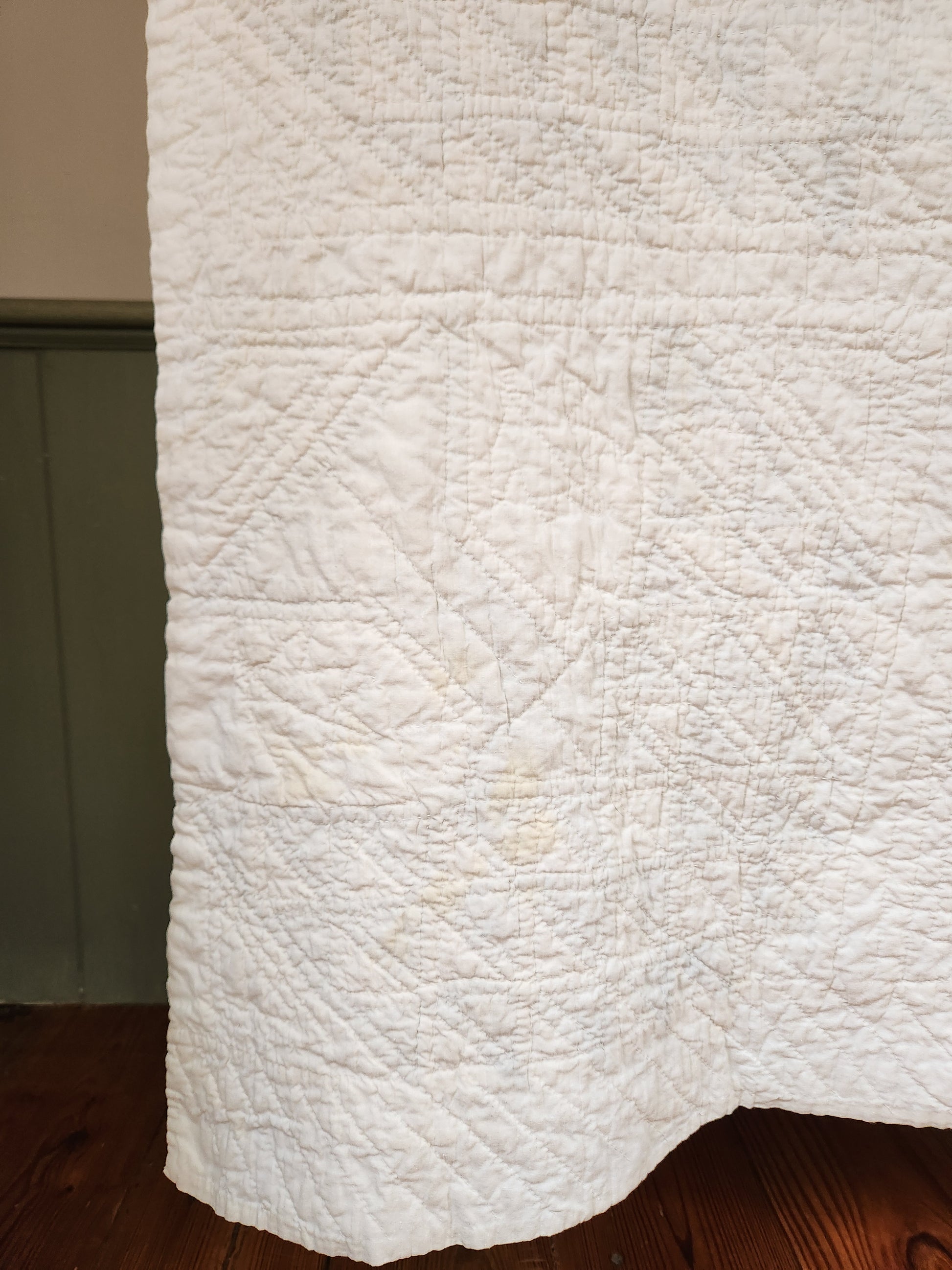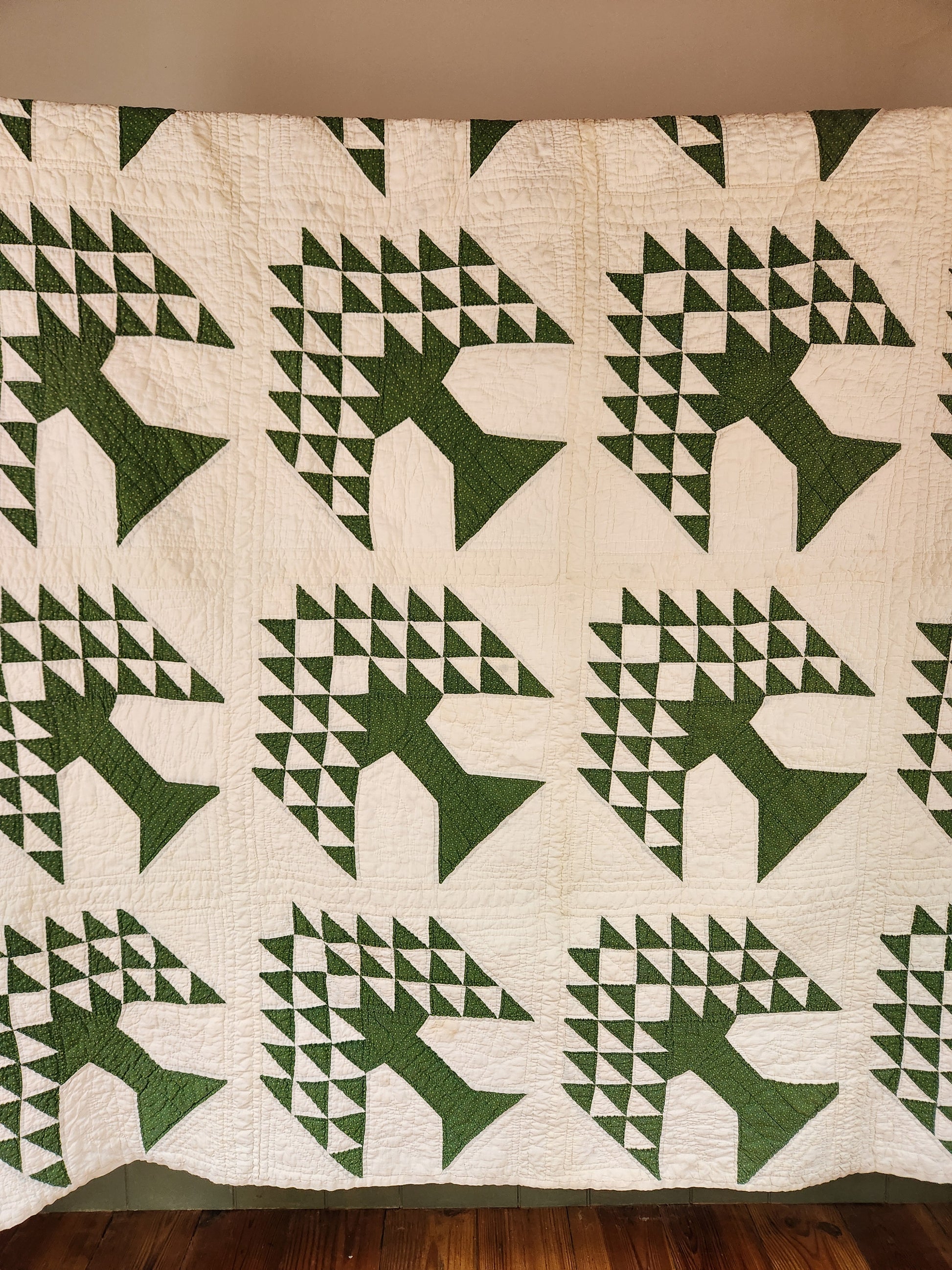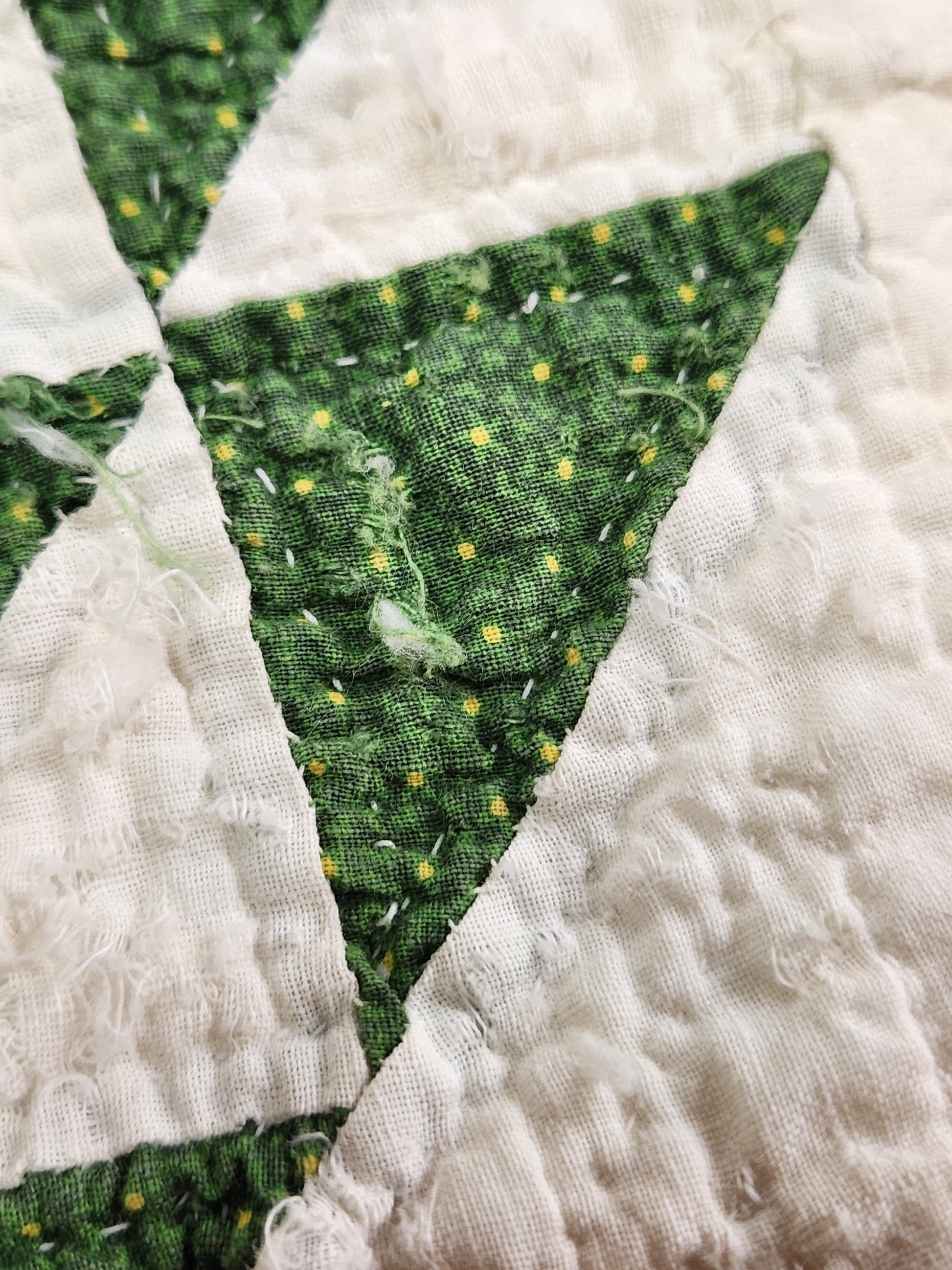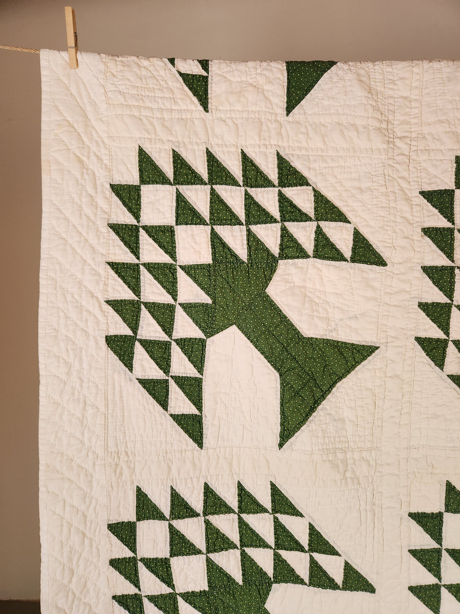 Hand pieced and hand quilted, a stunning late 19th century patchwork quilt in deep green (daisy) and white. Very soft, in great condition.