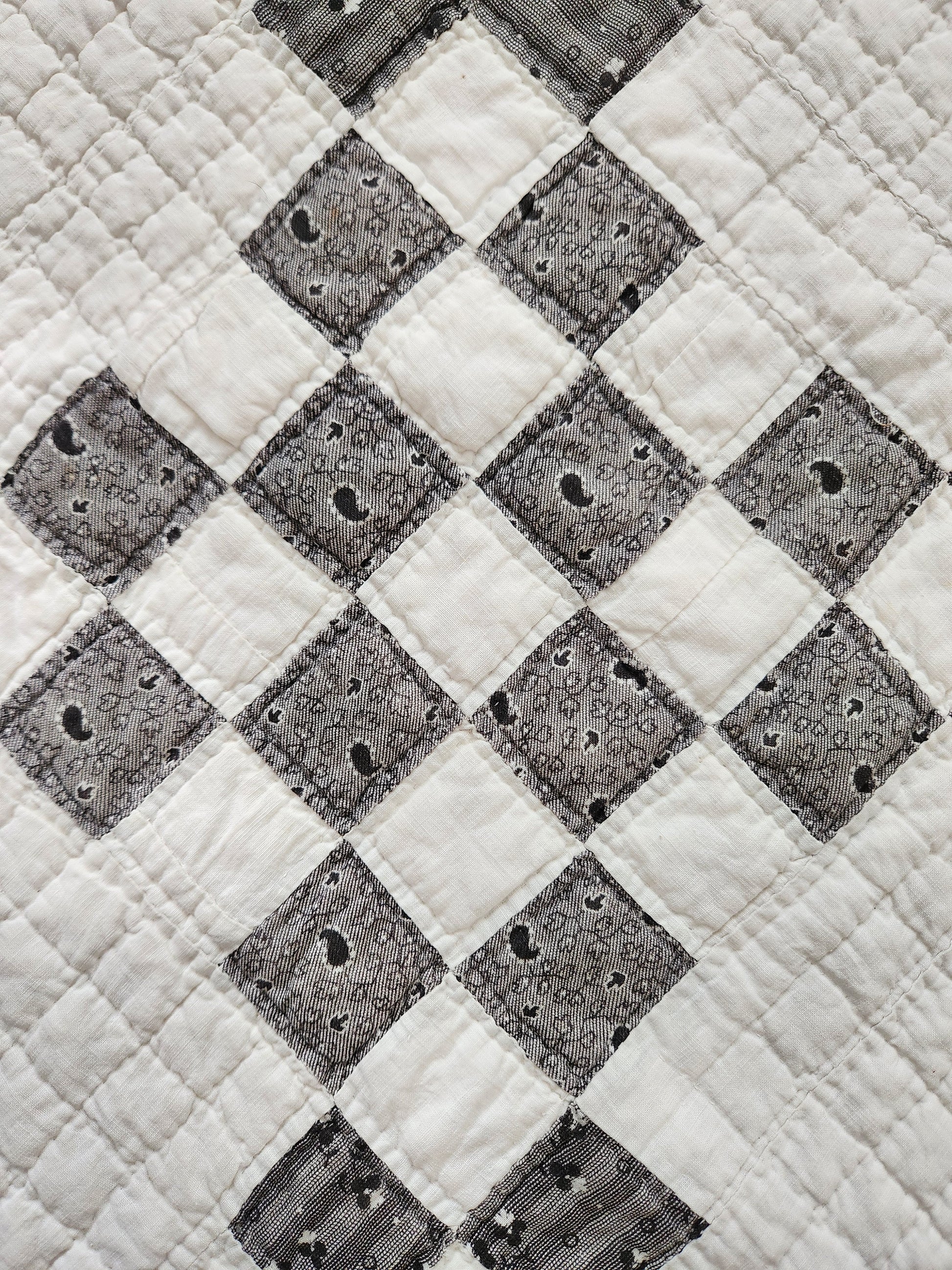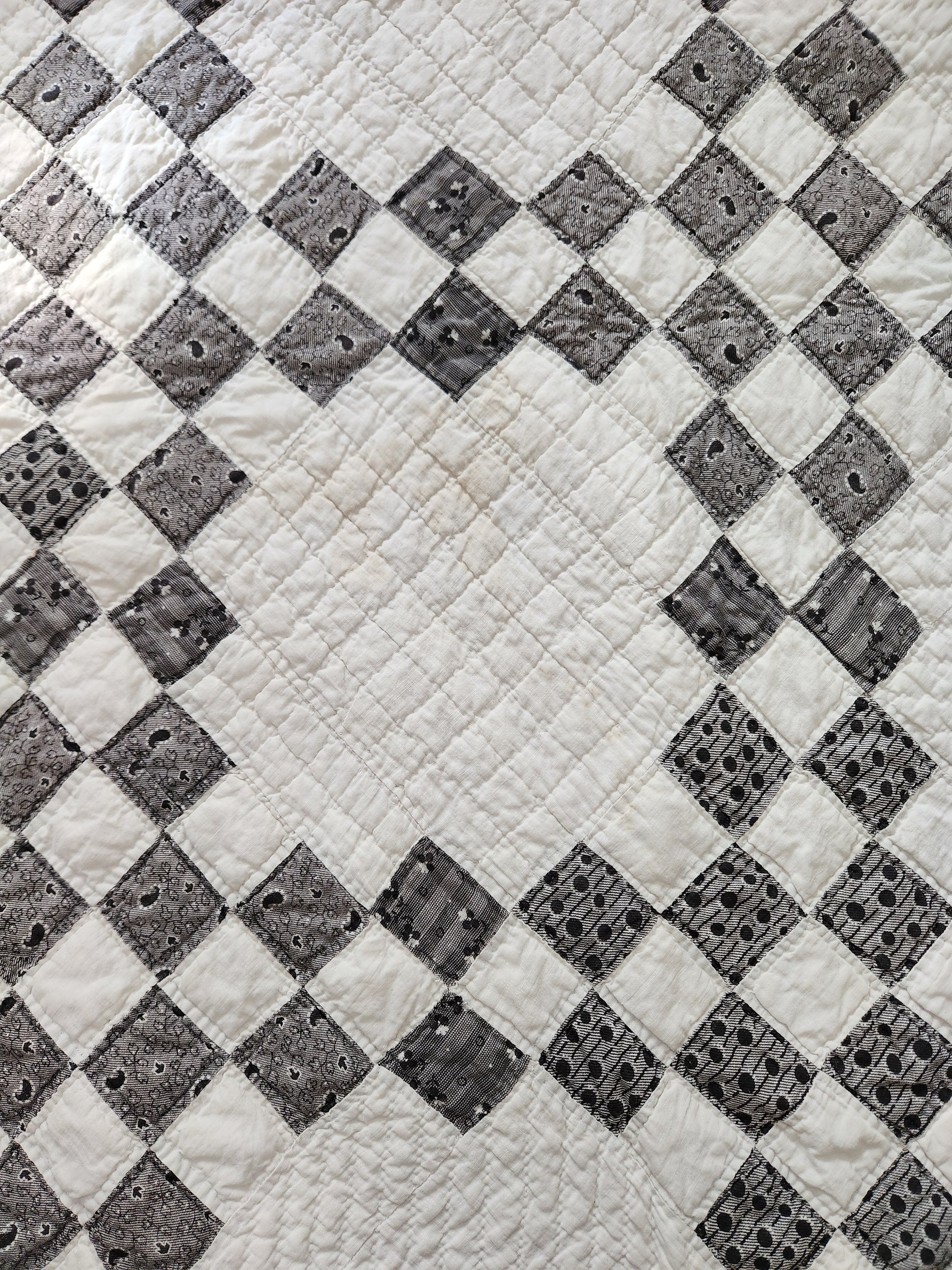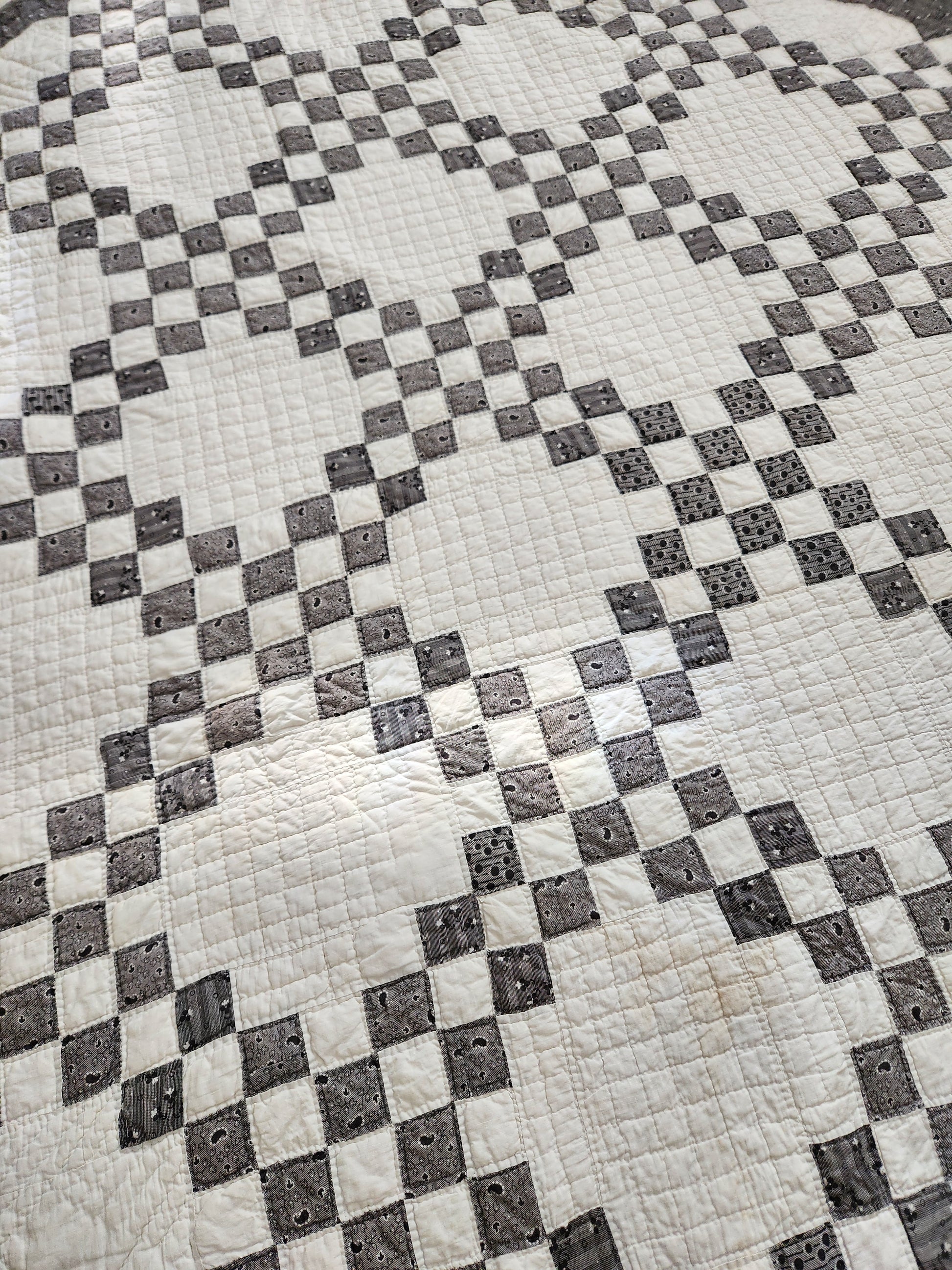 Hand pieced and hand quilted, this quilt is constructed with cloth typically worn during times of mourning in the late 19th Century. The pattern is a classic Double Irish Chain. Some say quilts like these, with mourning prints, were made to mark or honor the loss of a loved one. This quilt has significant toast, toning to the edges and backing from storage but has been freshly hand washed. See condition below: