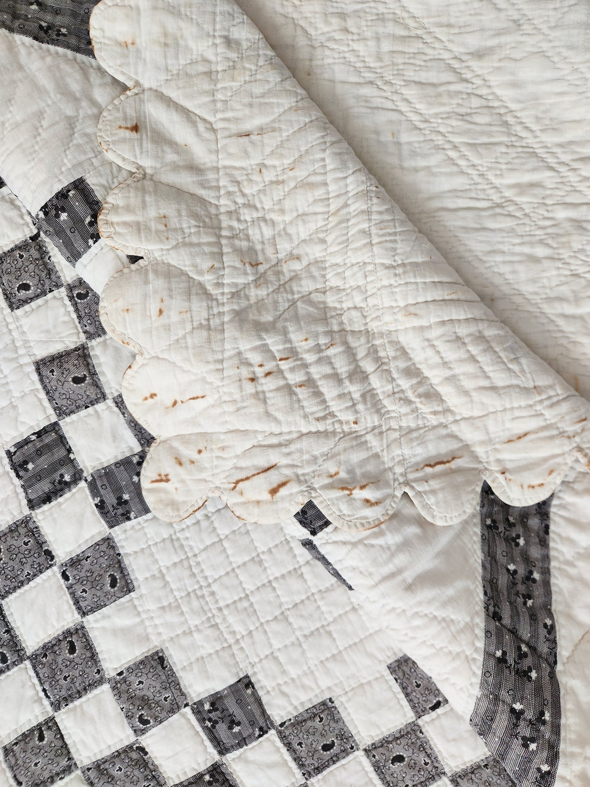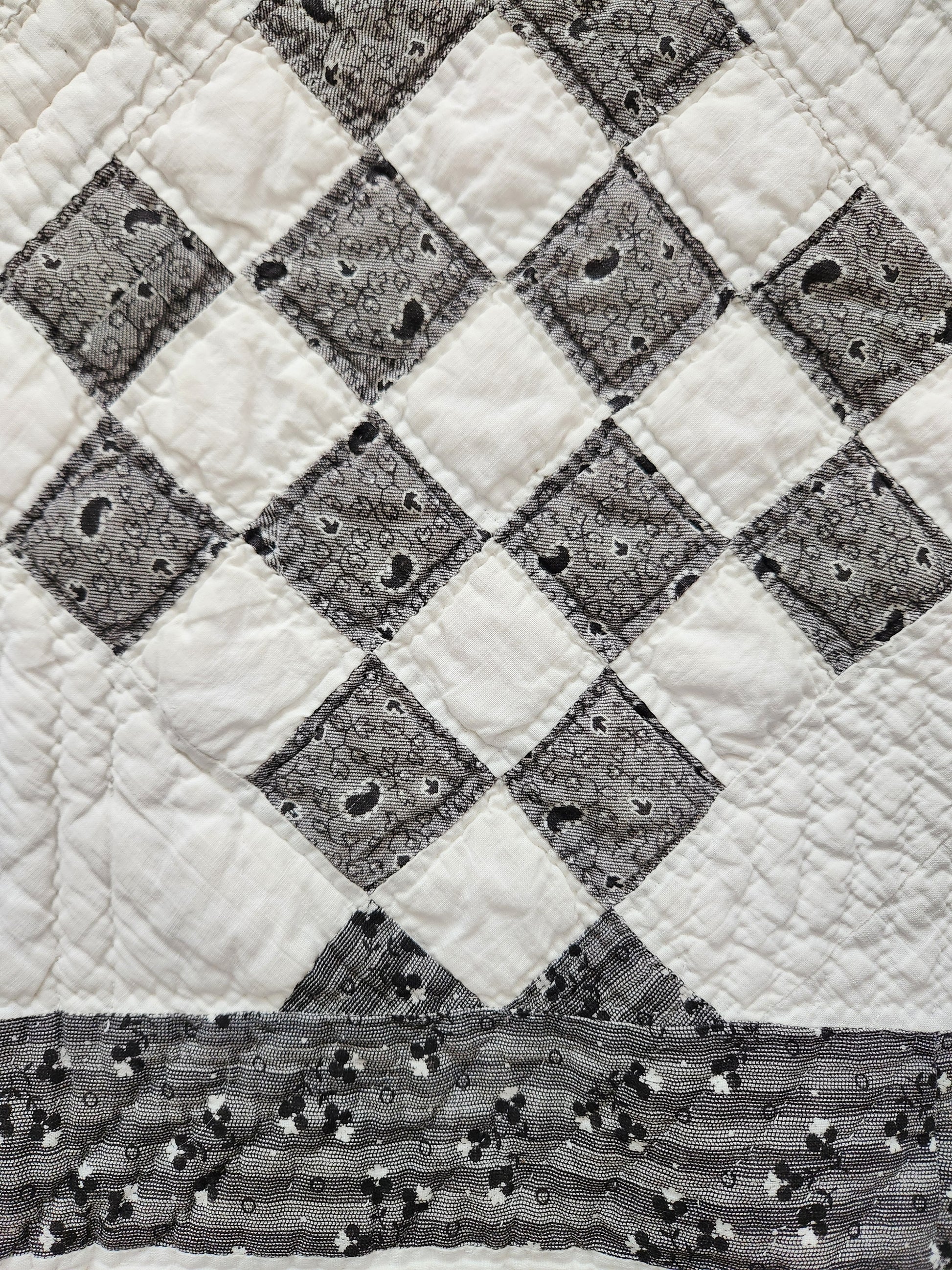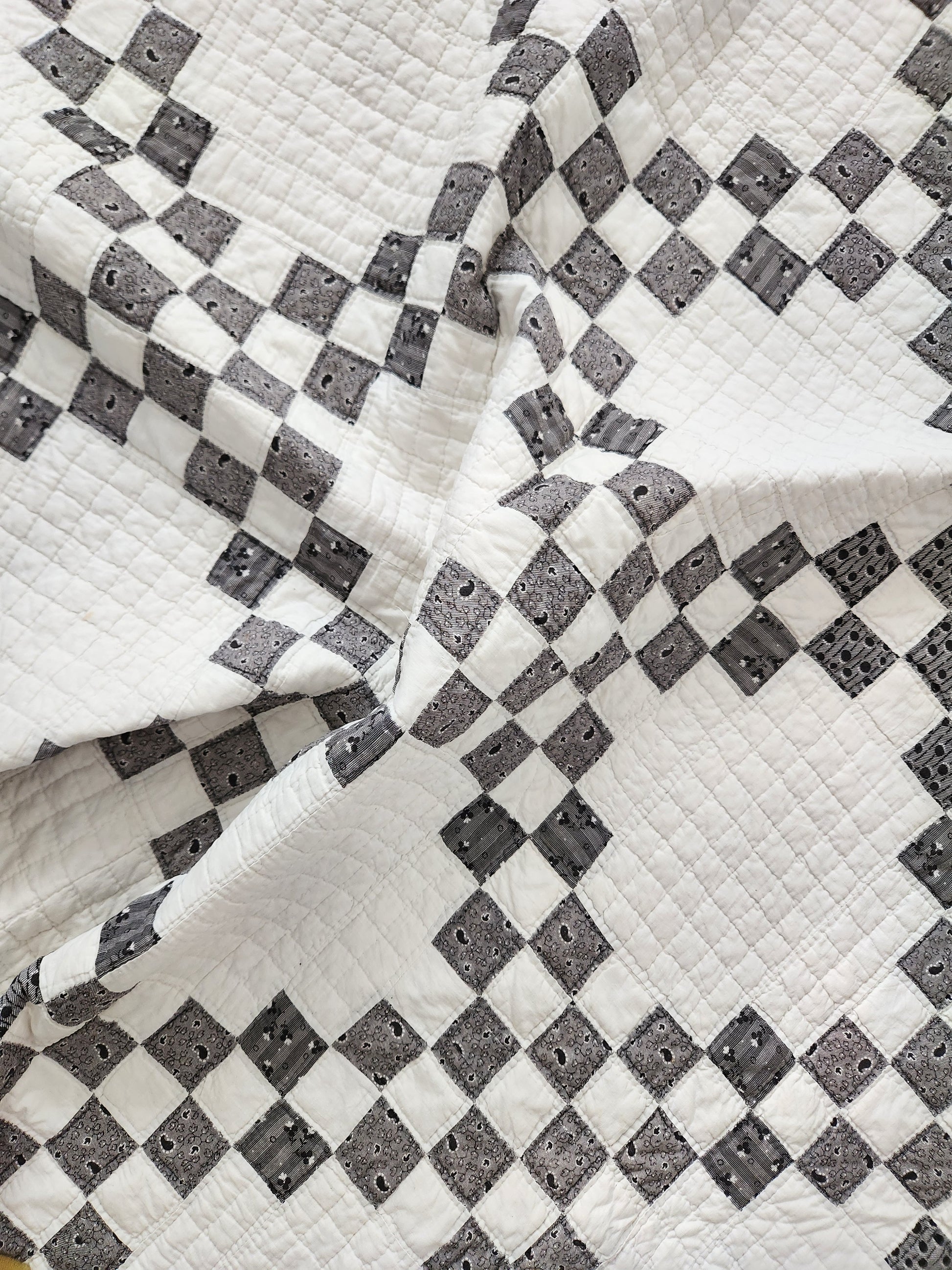 Hand pieced and hand quilted, this quilt is constructed with cloth typically worn during times of mourning in the late 19th Century. The pattern is a classic Double Irish Chain. Some say quilts like these, with mourning prints, were made to mark or honor the loss of a loved one. This quilt has significant toast, toning to the edges and backing from storage but has been freshly hand washed. See condition below: