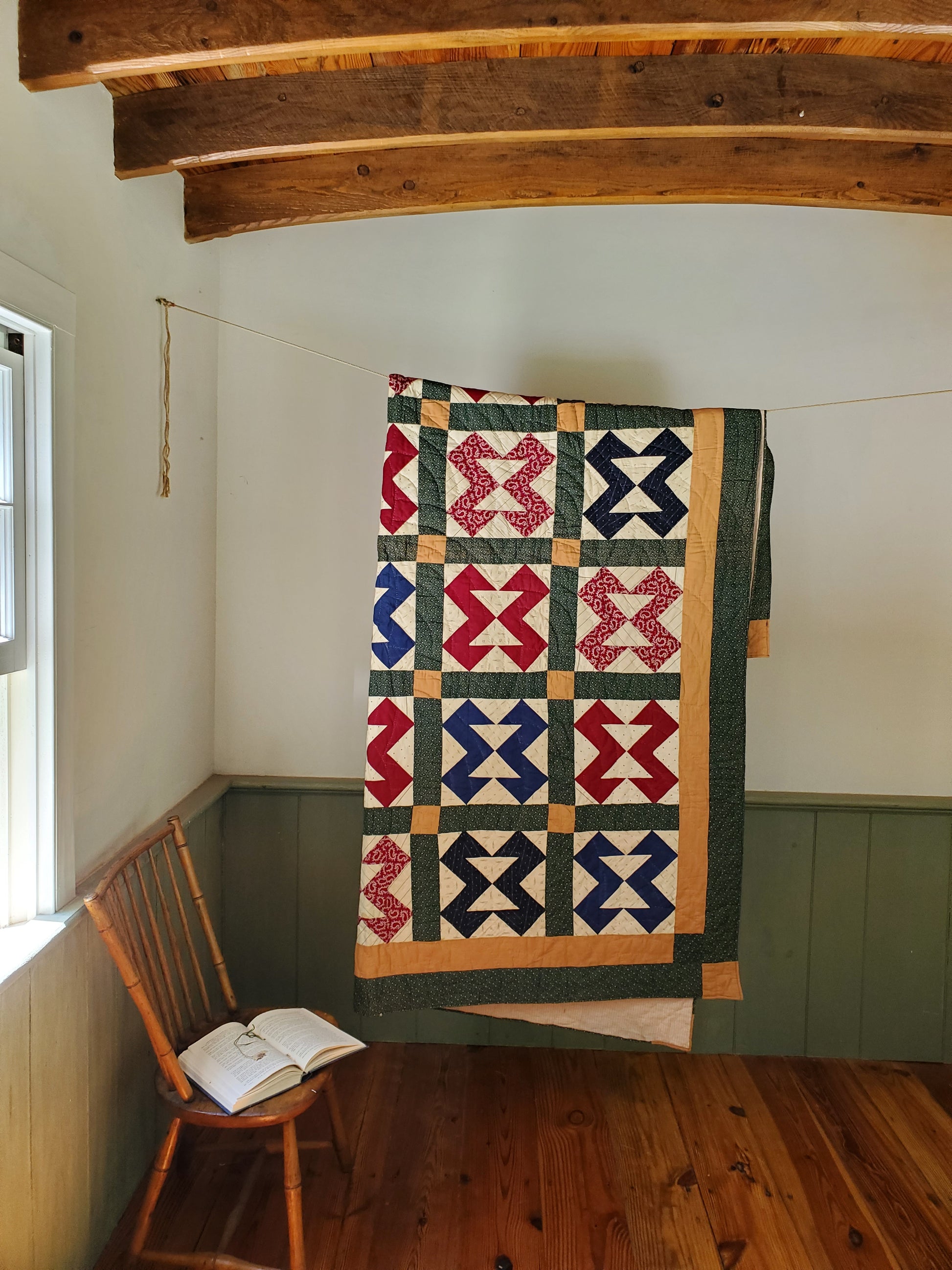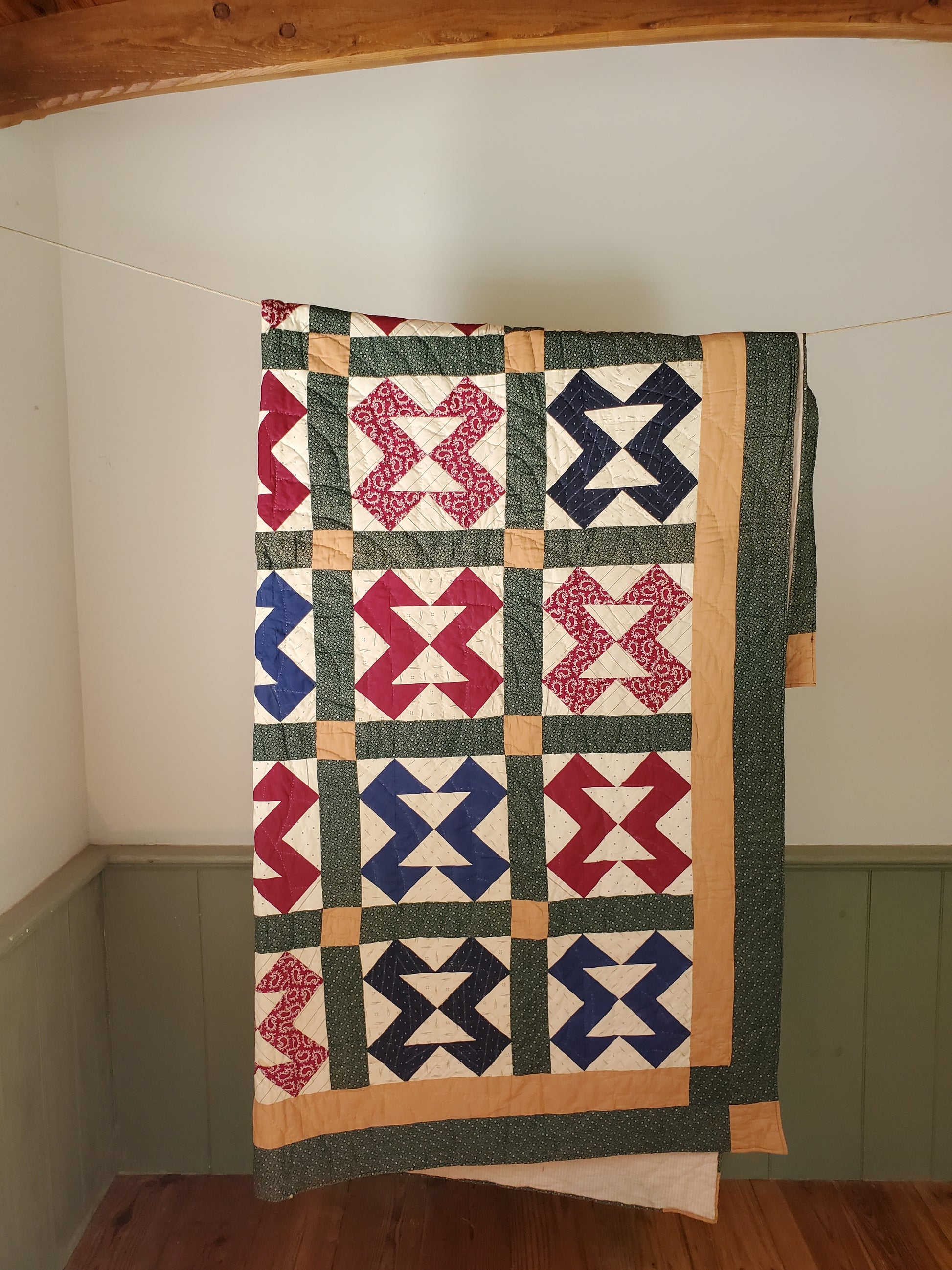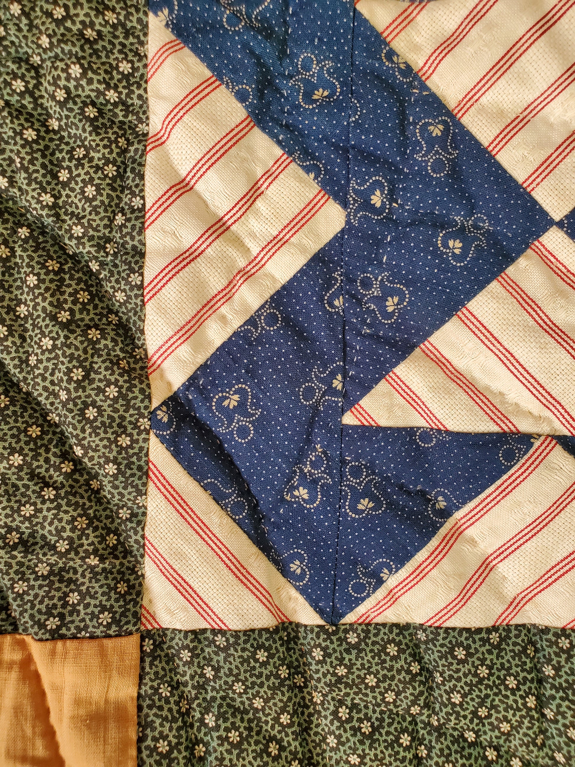 A beautiful, handmade, antique quilt which has never been used and is very well kept. It has a sashing of green Daisy and lots of shirting prints within the blocks, both printed and woven. The backing a very soft flannel in a white and pink stripe.