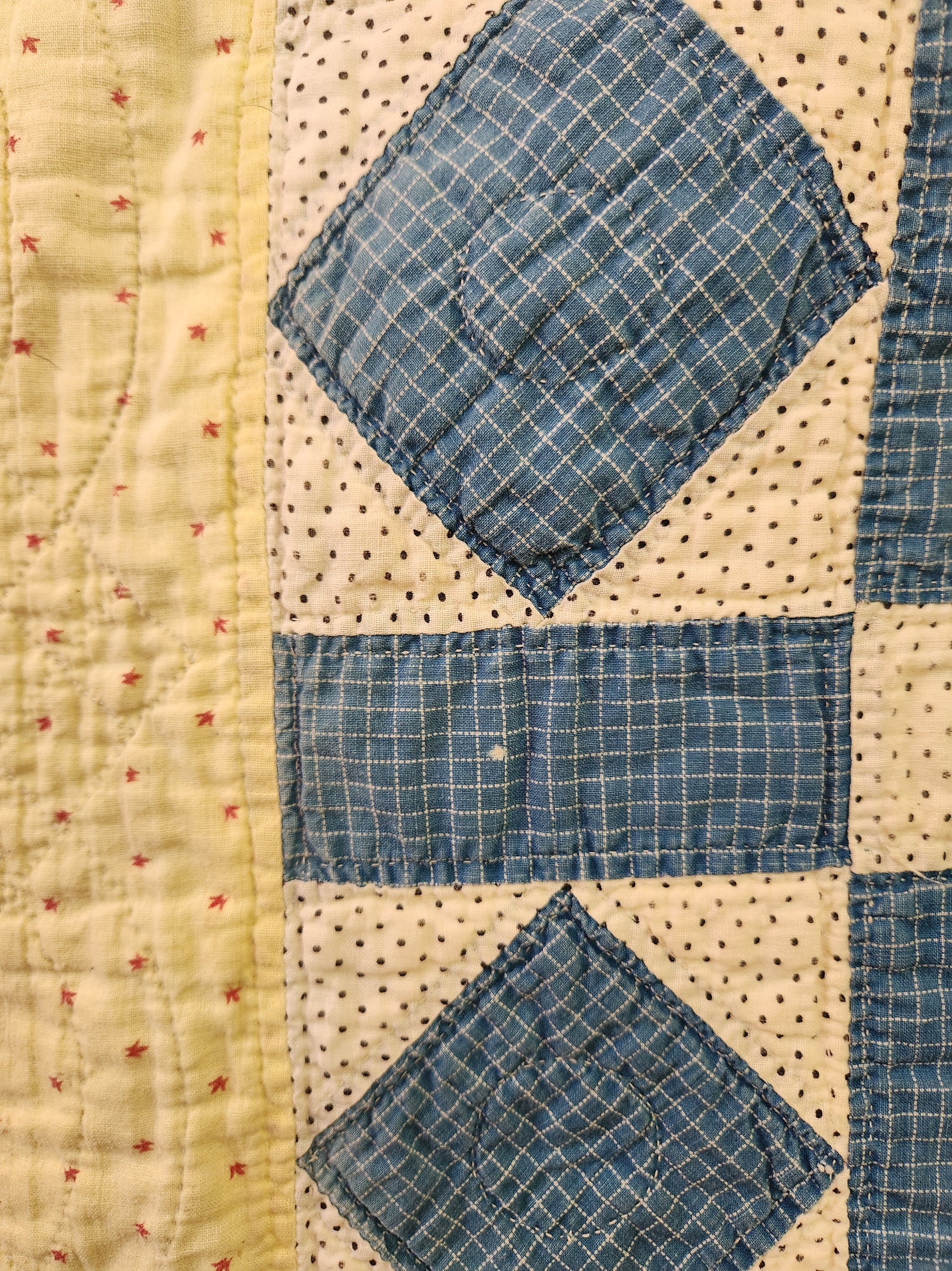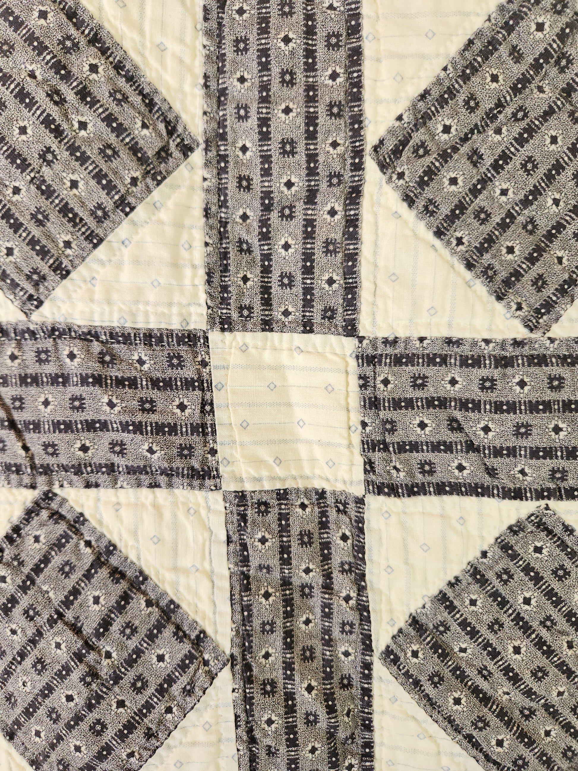 A beautiful, hand pieced, hand quilted patchwork quilt is a pale butter yellow with block pieced with indigos, mourning grays and blacks, various white shirtings etc. The pattern is referred to as "Garden of Eden" or "Economy" block. It has completely hand pieced and hand quilted by an experienced hand. It is soft, drapey and lovely with a white backing.
