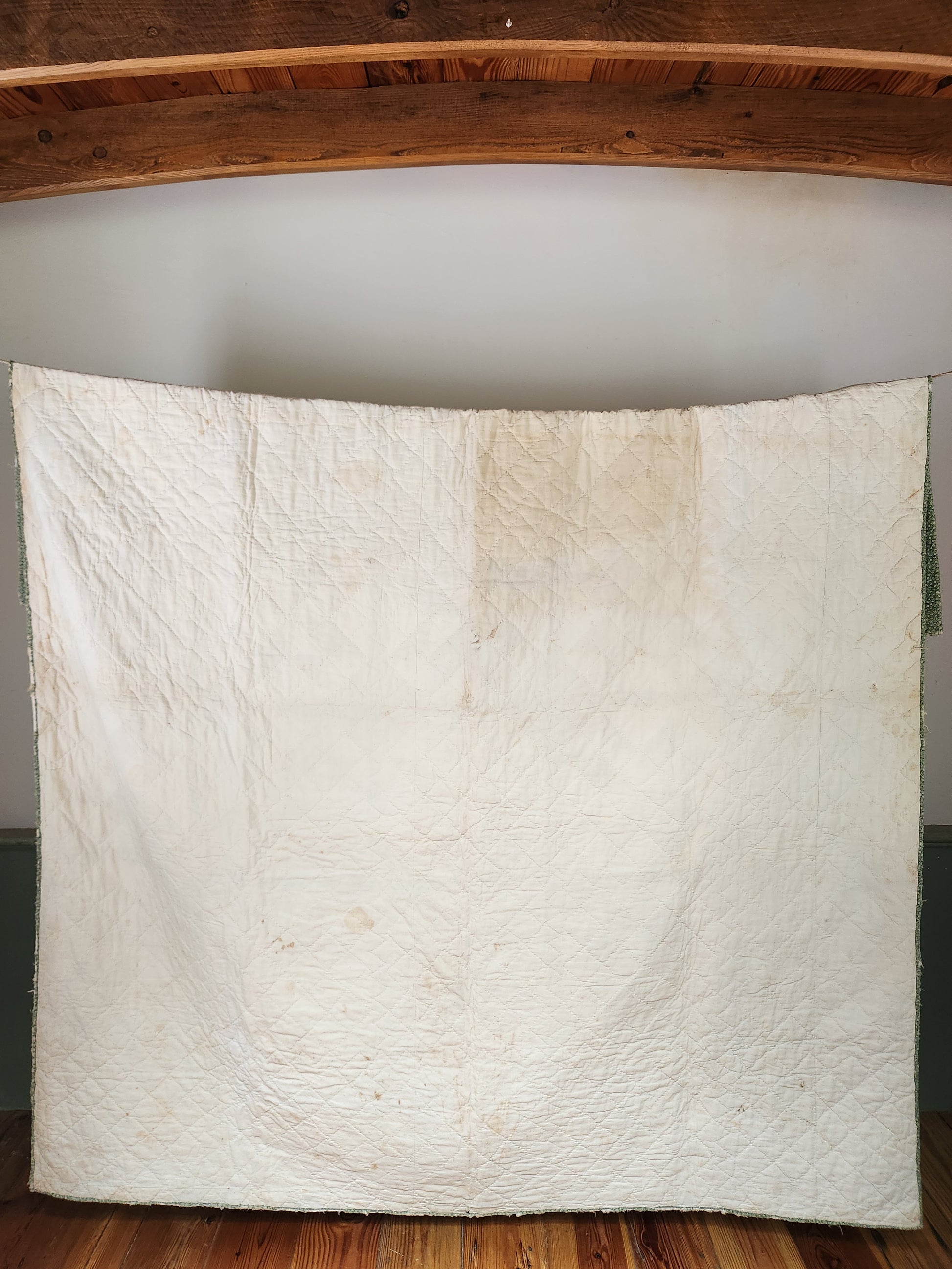 A wonderful, antique patchwork quilt from the mid 19th century full of wear and patina. This quilt is hand pieced and hand quilted. There is wear the binding and several areas of the ditsy green sashing. It is yellowed with age with many marks and blips on the front and back.