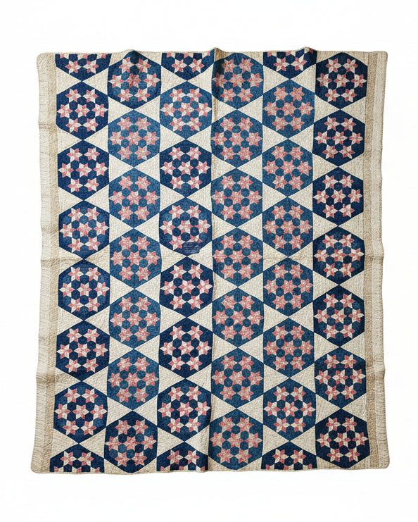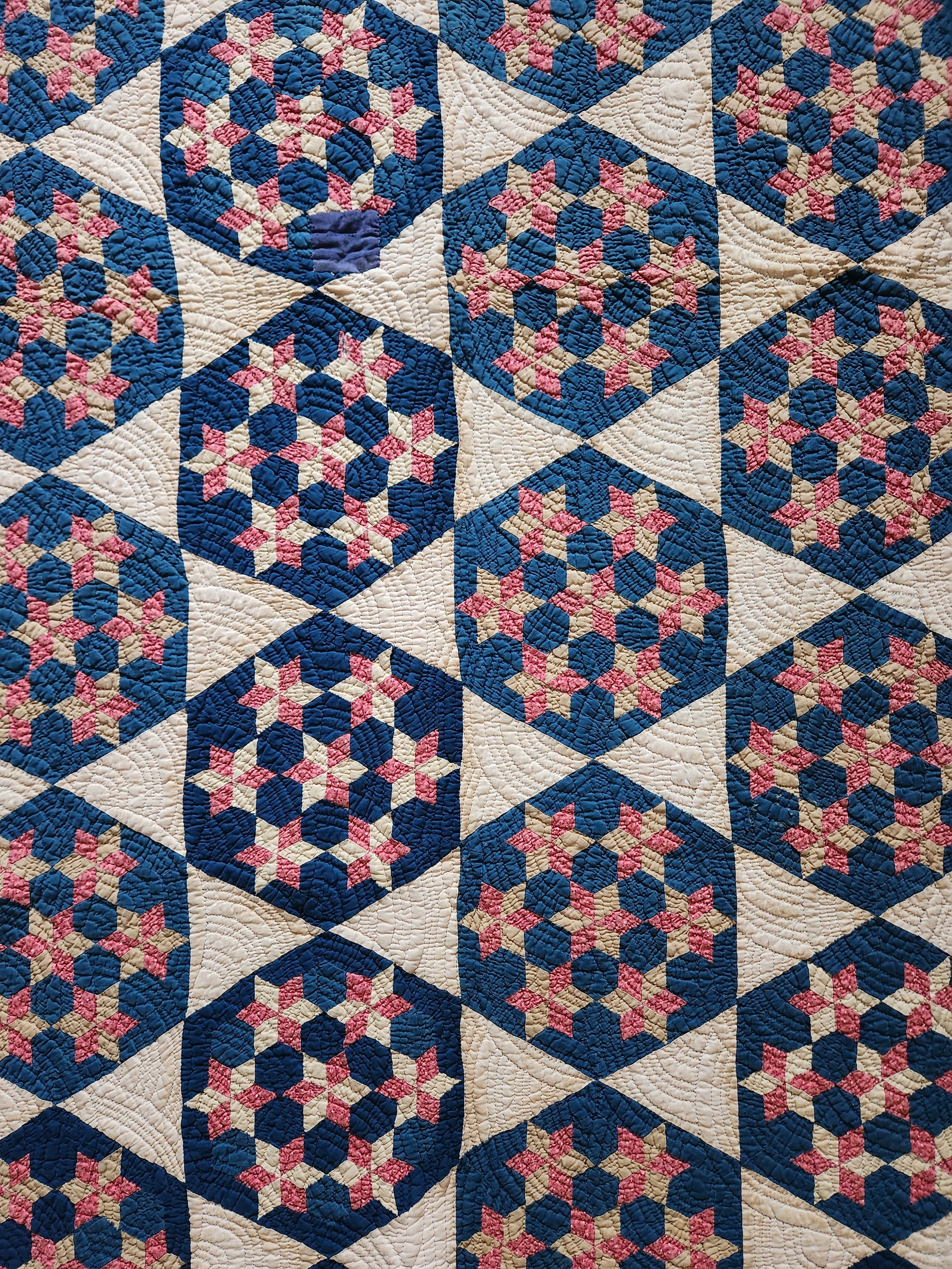 Late 19th Century patchwork quilt in a sought-after pattern called “Seven Sisters” represented by the seven little five-point stars inside the pieced hexagons. This is completely hand stitched, with black cotton thread used for the quilting. It is densely hand quilted giving it a soft, bouncy feel.