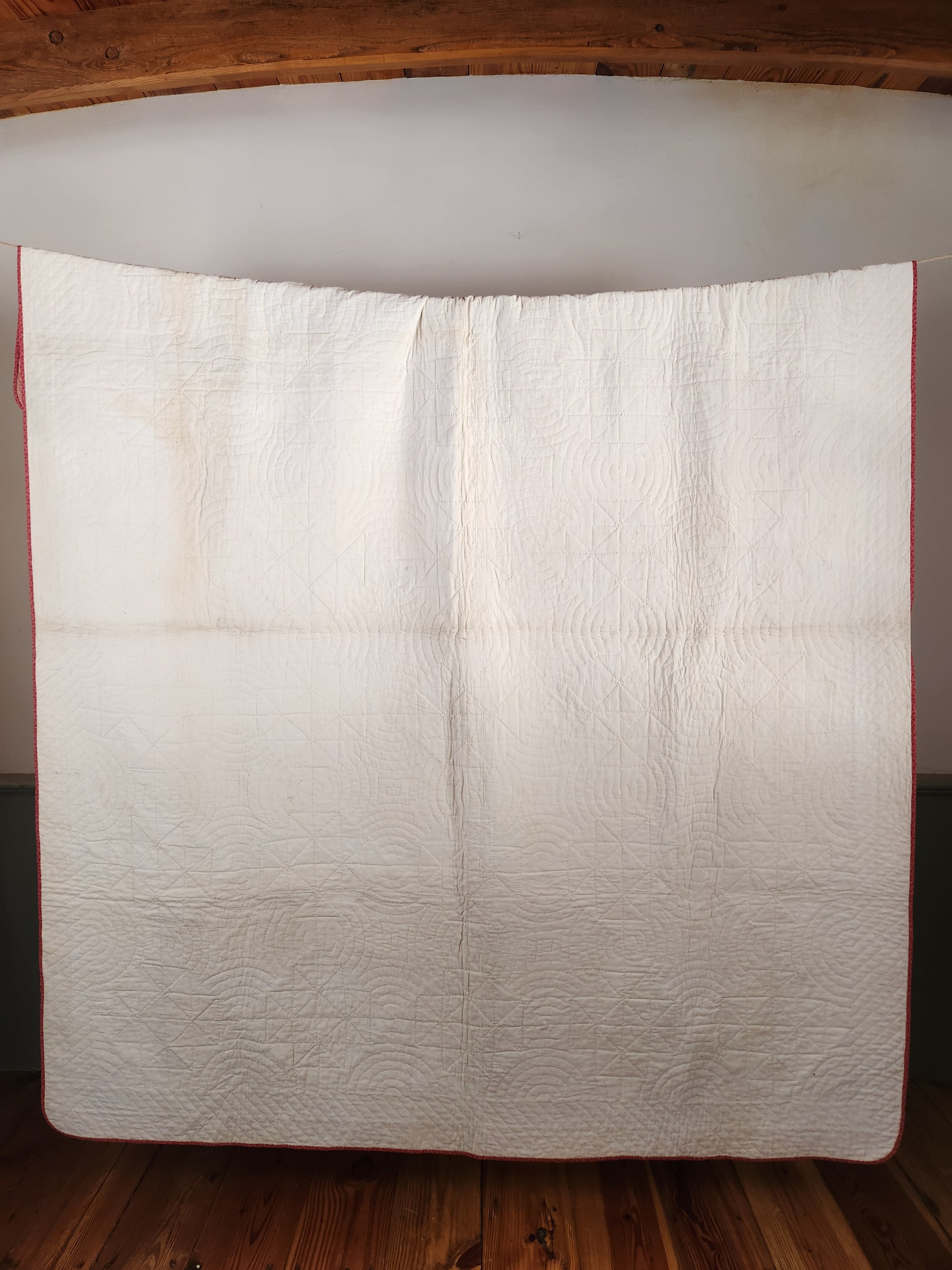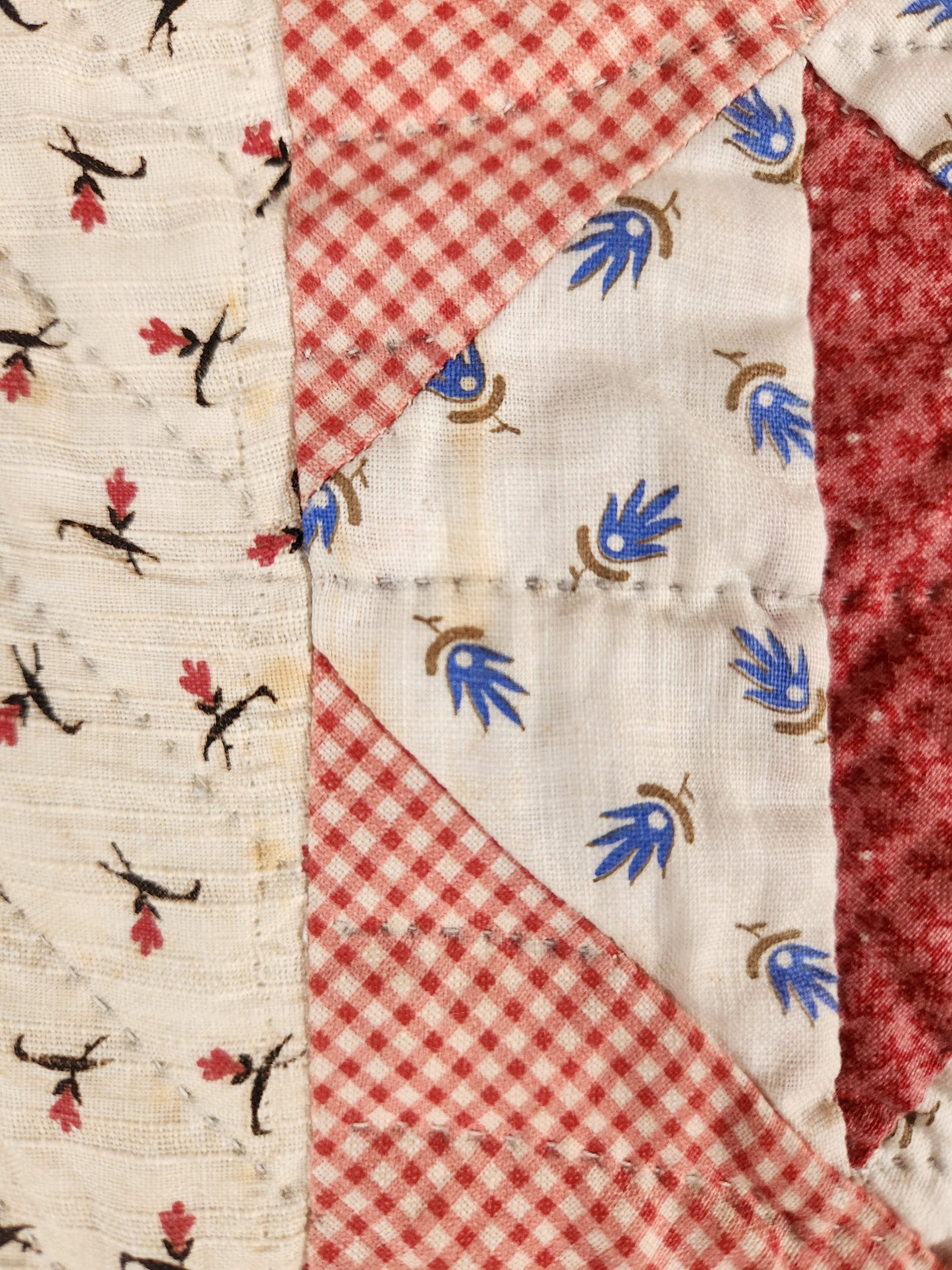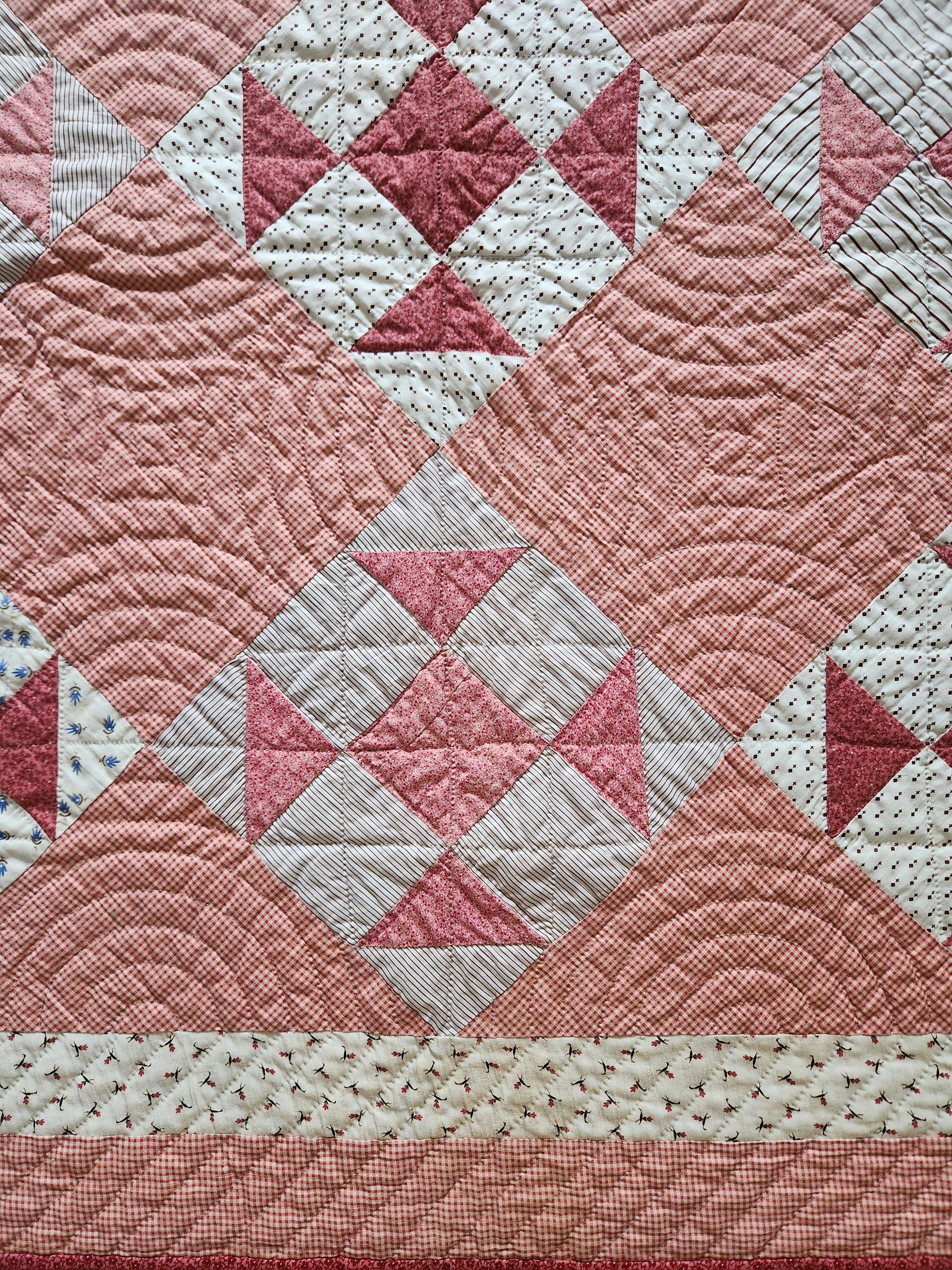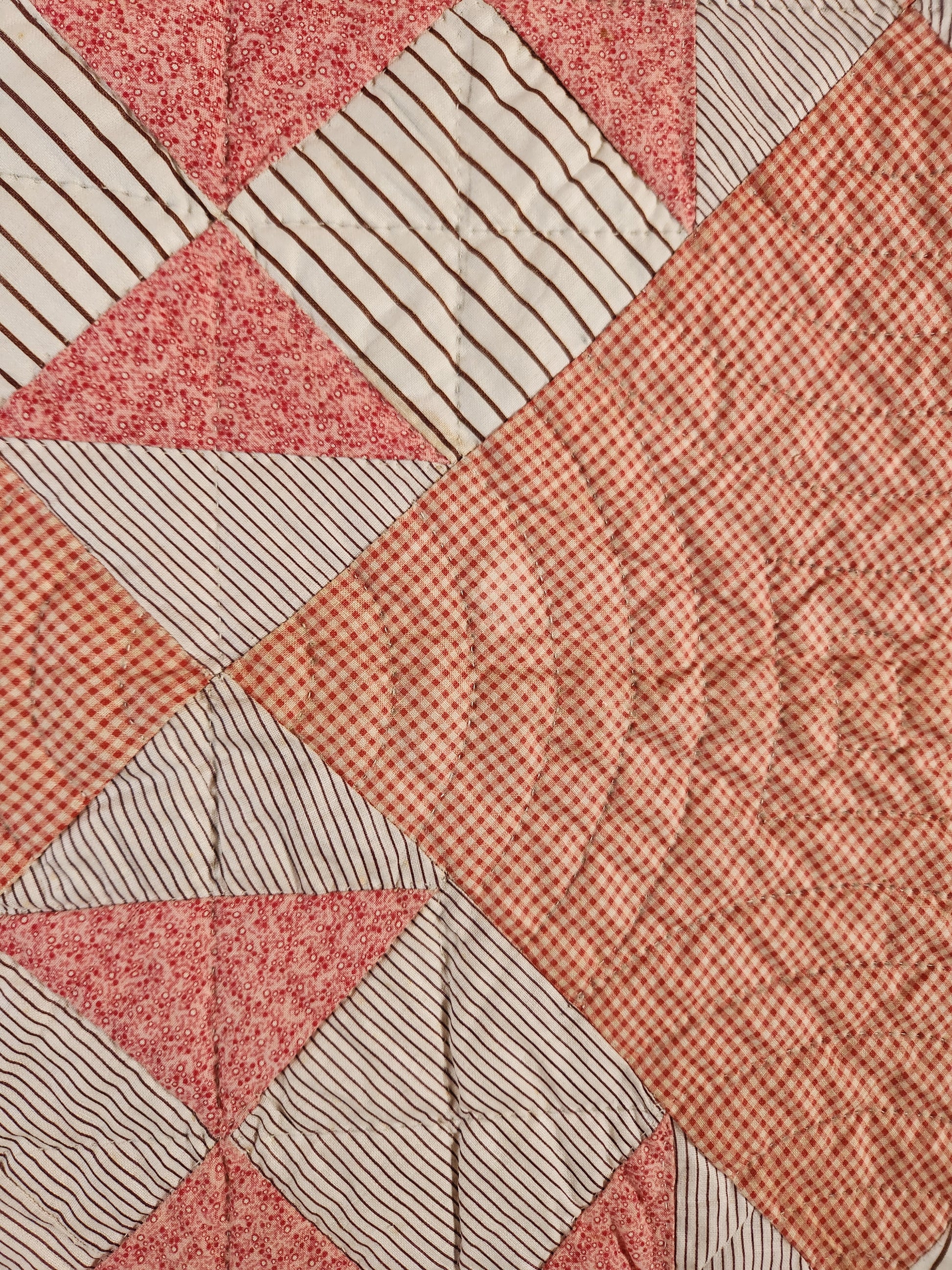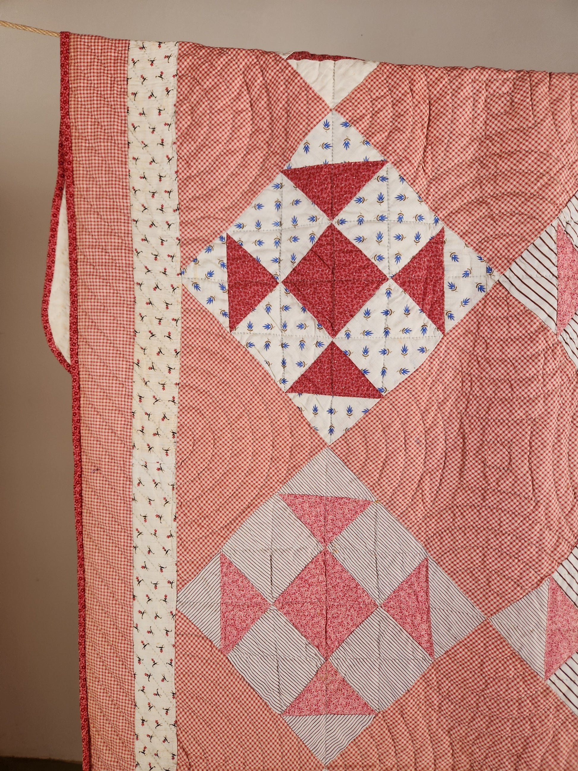 Collector'squality, (Pink gingham!) and expertly made, this late 19th century patchwork quilt has been carefully hand pieced and hand quilted. Its in beautiful condition, never used, with a bright crisp floral binding. It has some wonderful patterns including one block with a lovely printed lace.