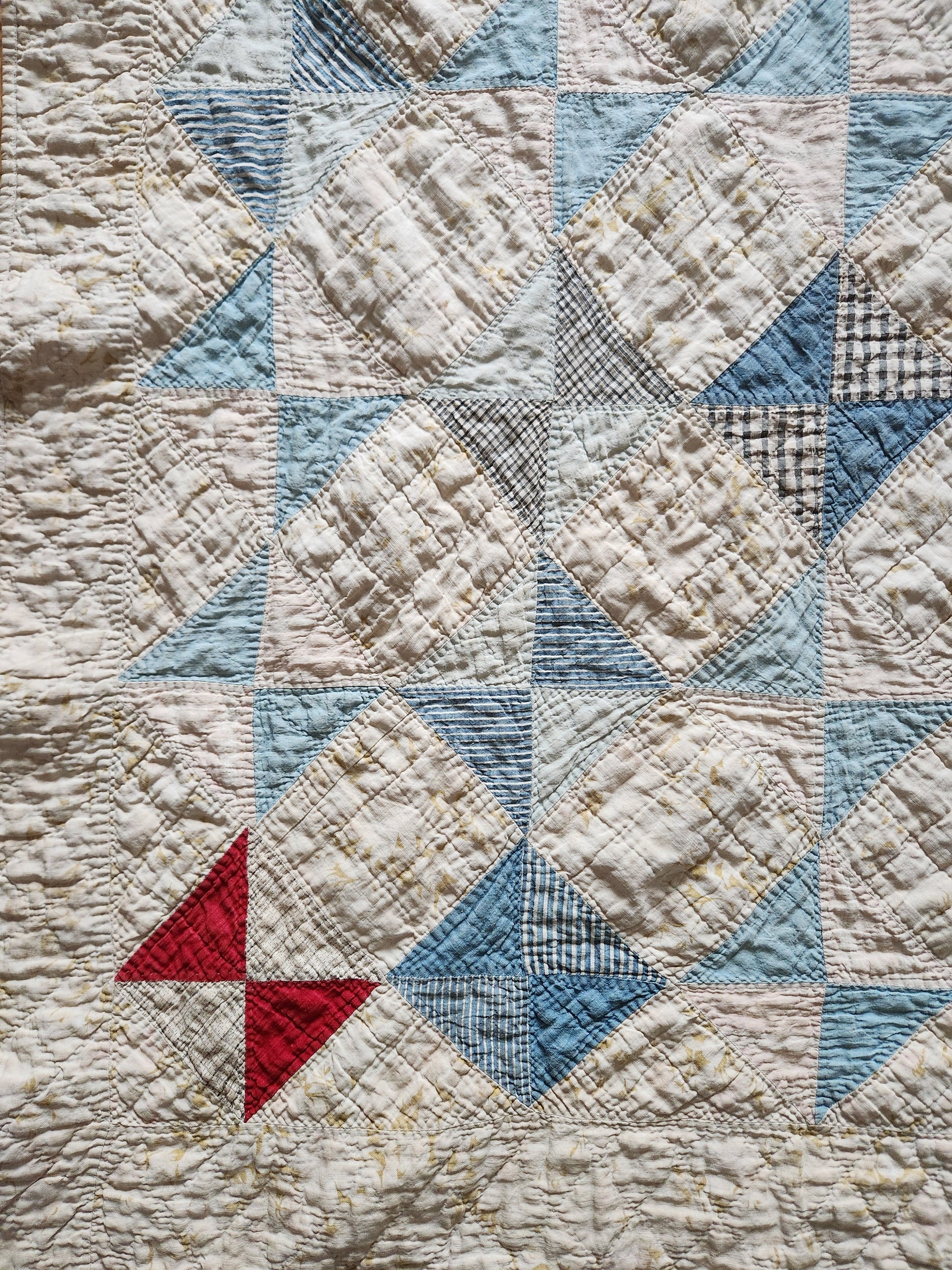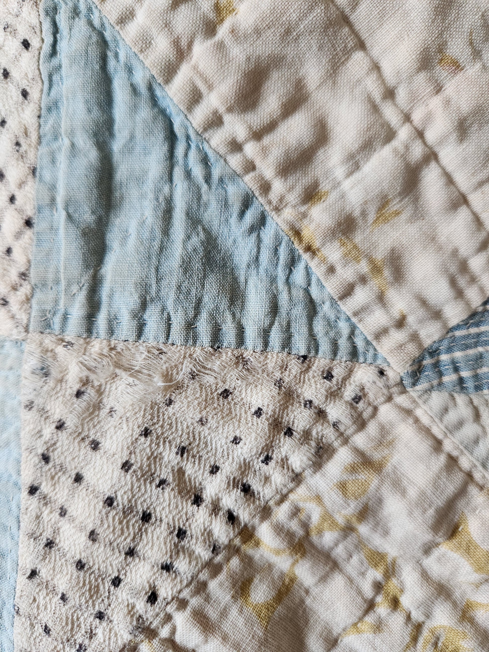Hand pieced and hand quilted. Beautiful pale cottons with a pop of red in the half triangles use for the corner blocks. A mix of pale yellow floral cotton and shirting scraps. A wonderful, classic patchwork quilt.