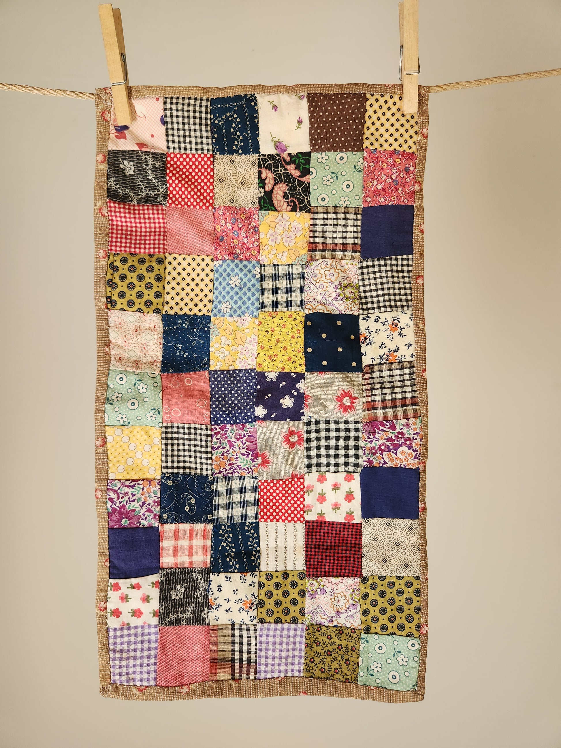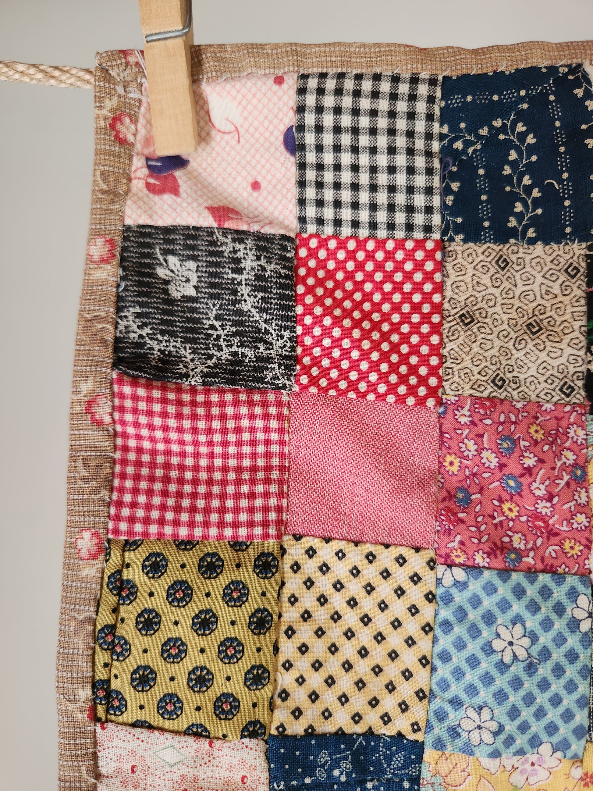 A wonderful little doll quilt, likely made to fit a doll’s bed. Hand pieced and unquilted. The patchwork is lovely and bright, the backing a brown and red floral calico.