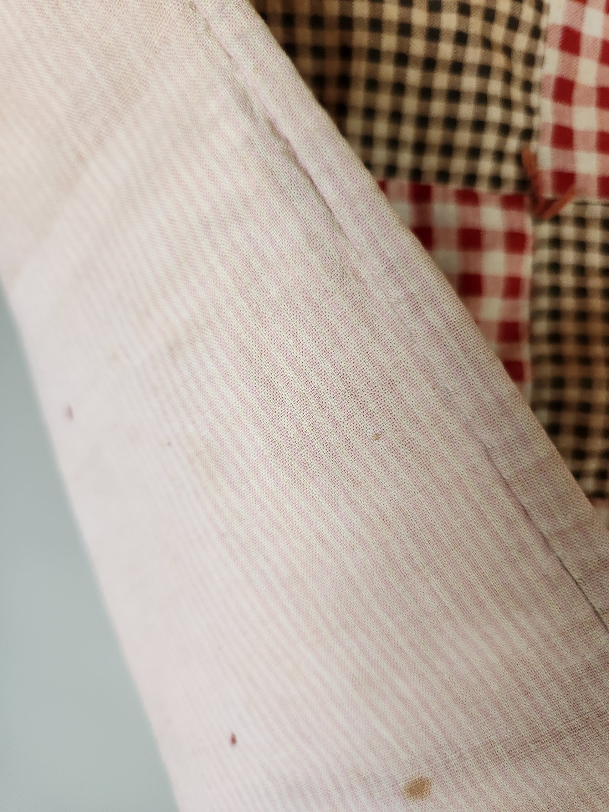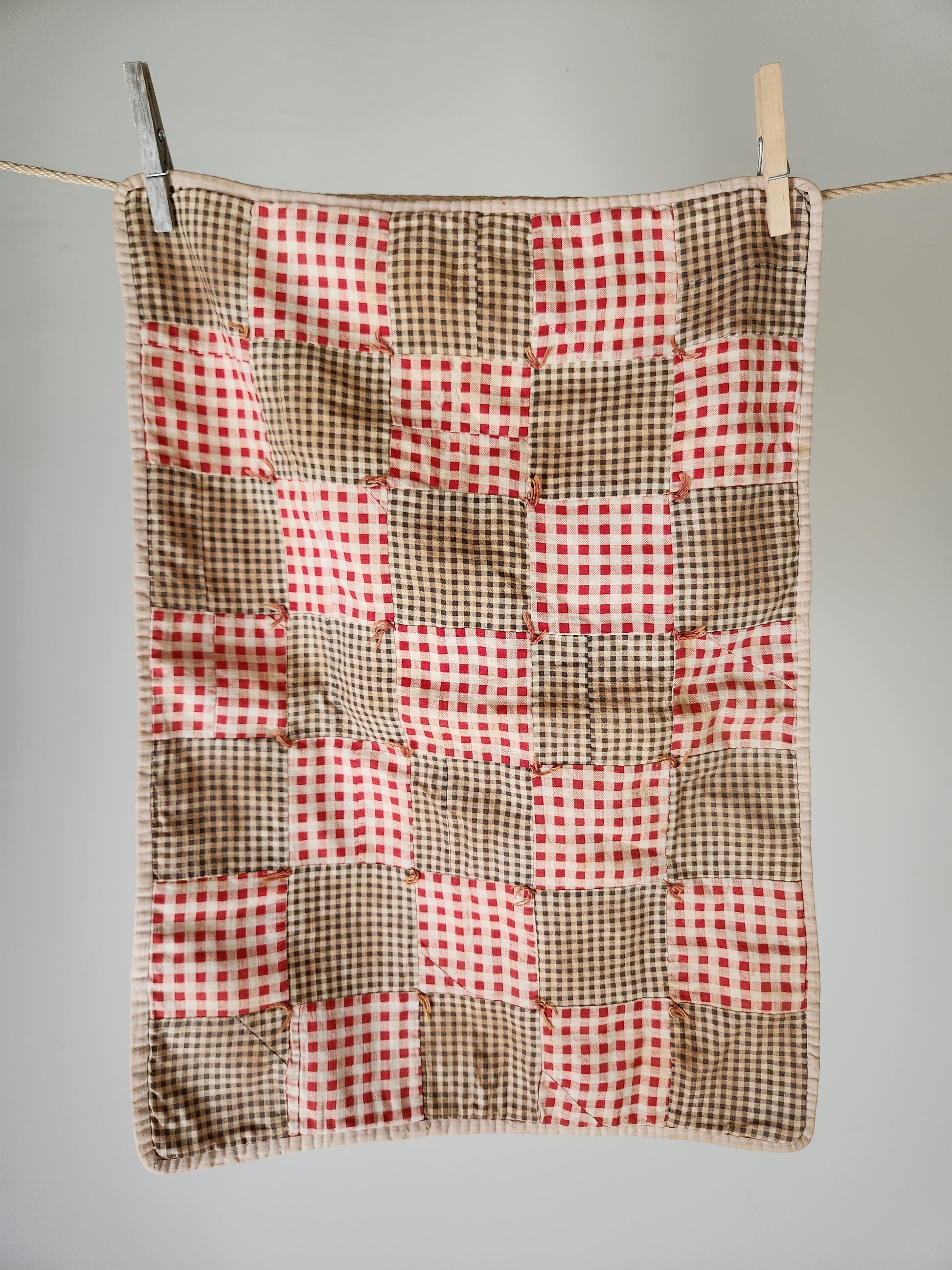 A sweet little patchwork doll’s quilt in printed gingham with small hand ties. The backing is a pink and white micro-stripe.