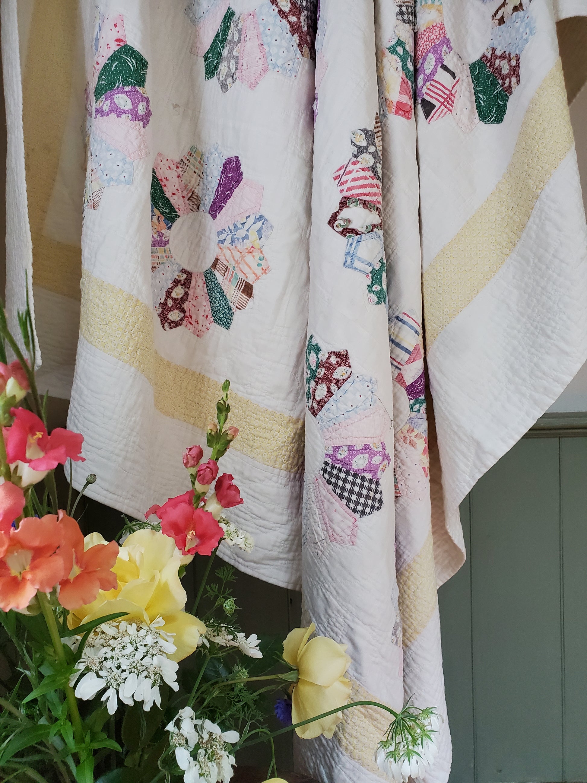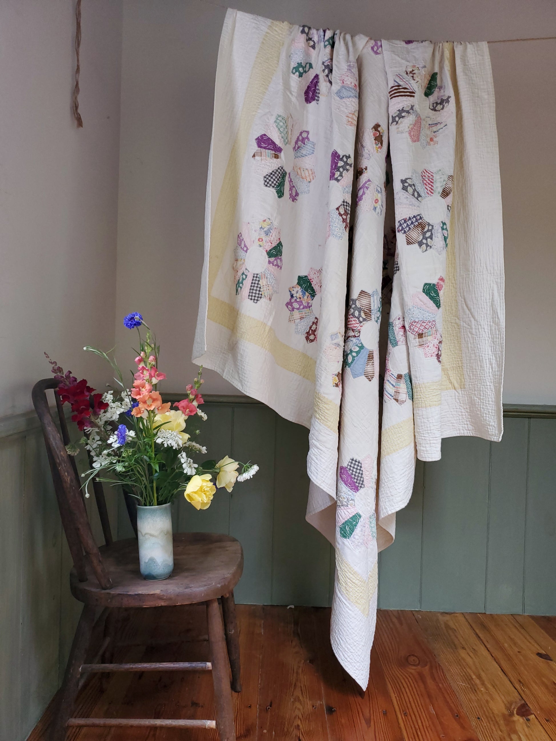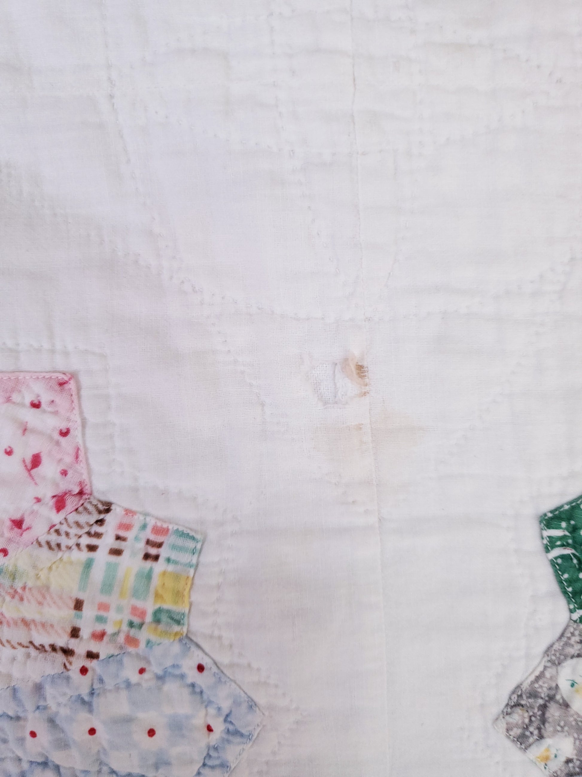 A cheerful early 20th century quilt, circa 1930 with machine applique on the flowers/plates and lovely hand quilting. The border is a bright, butter yellow in a rings print and the flowers/plates contain many dress and/or feed sack prints of the era. There are few patches with thinning and some with fabric loss, but overall it is in good condition. Note the surface tears to the white ground on the front in a few places. The binding has held up well and the white backing has some scattered marks.