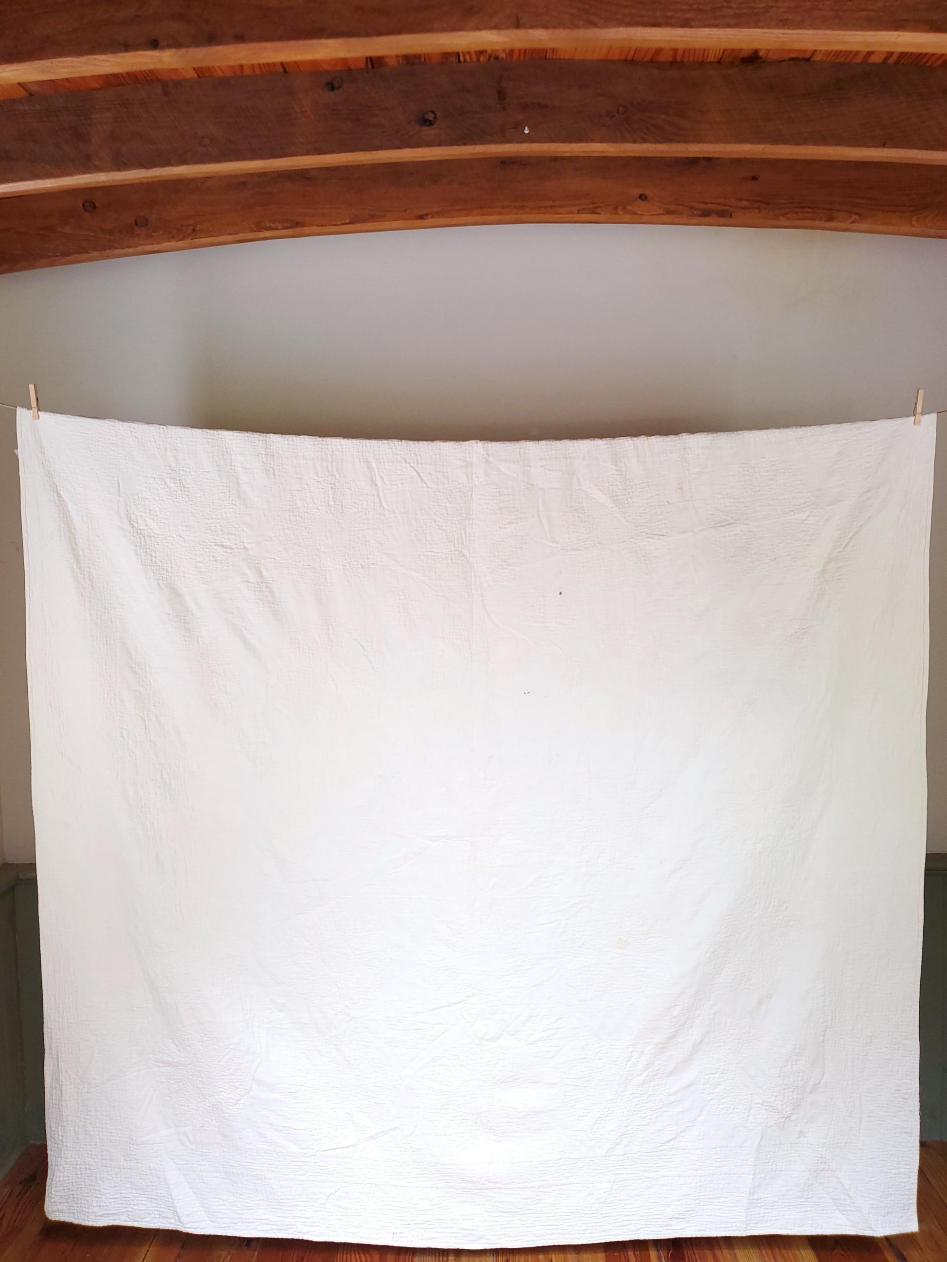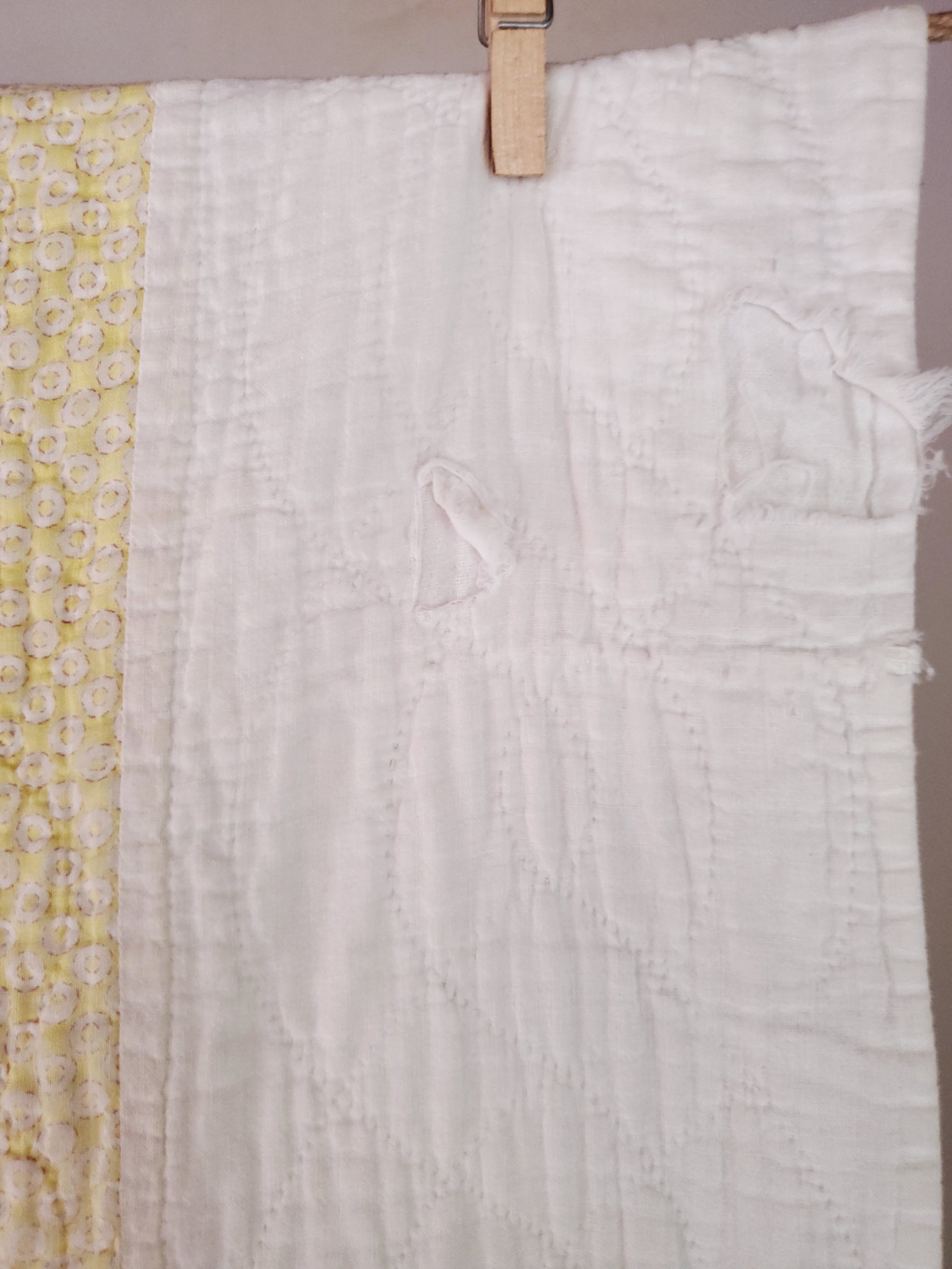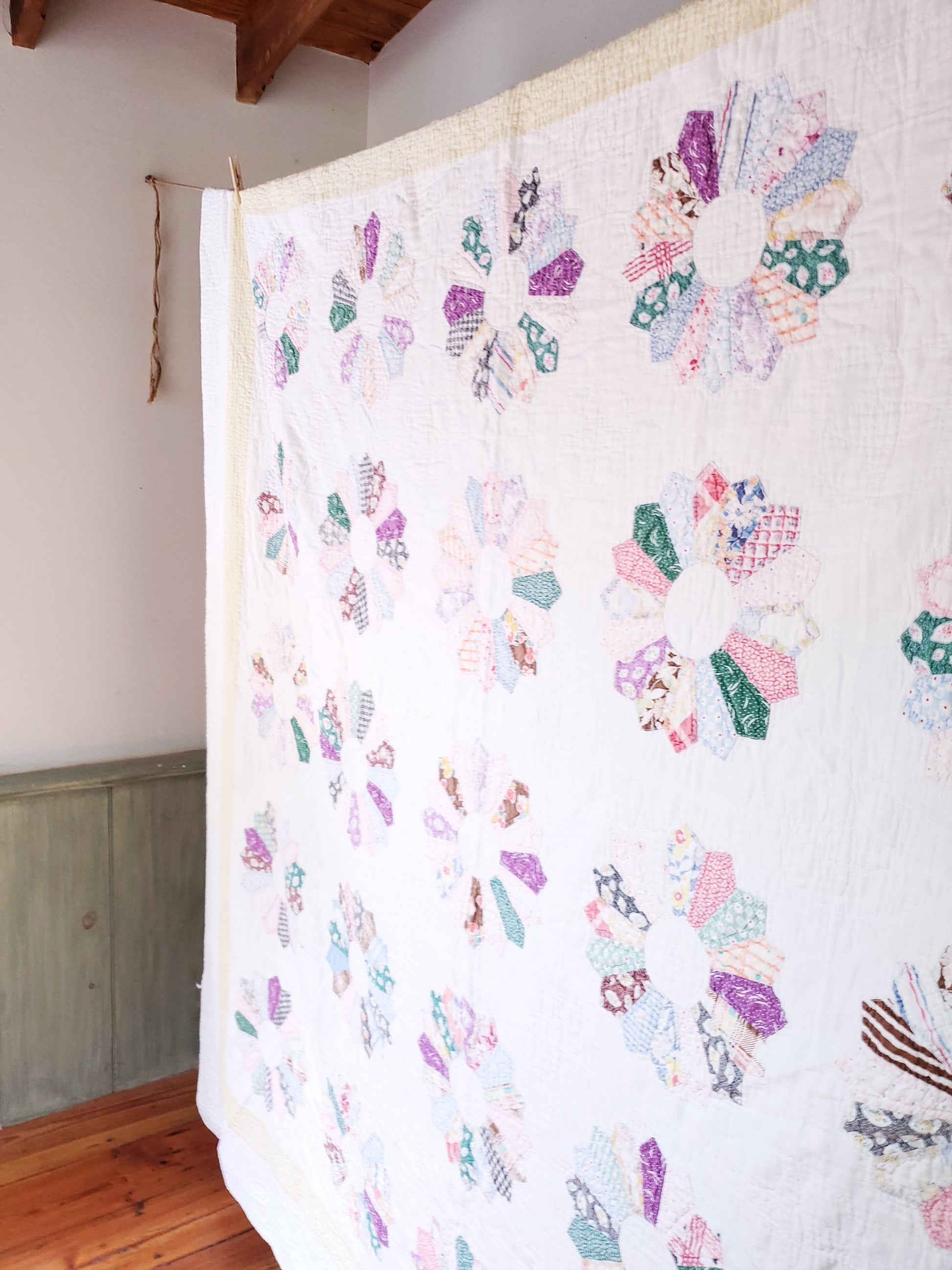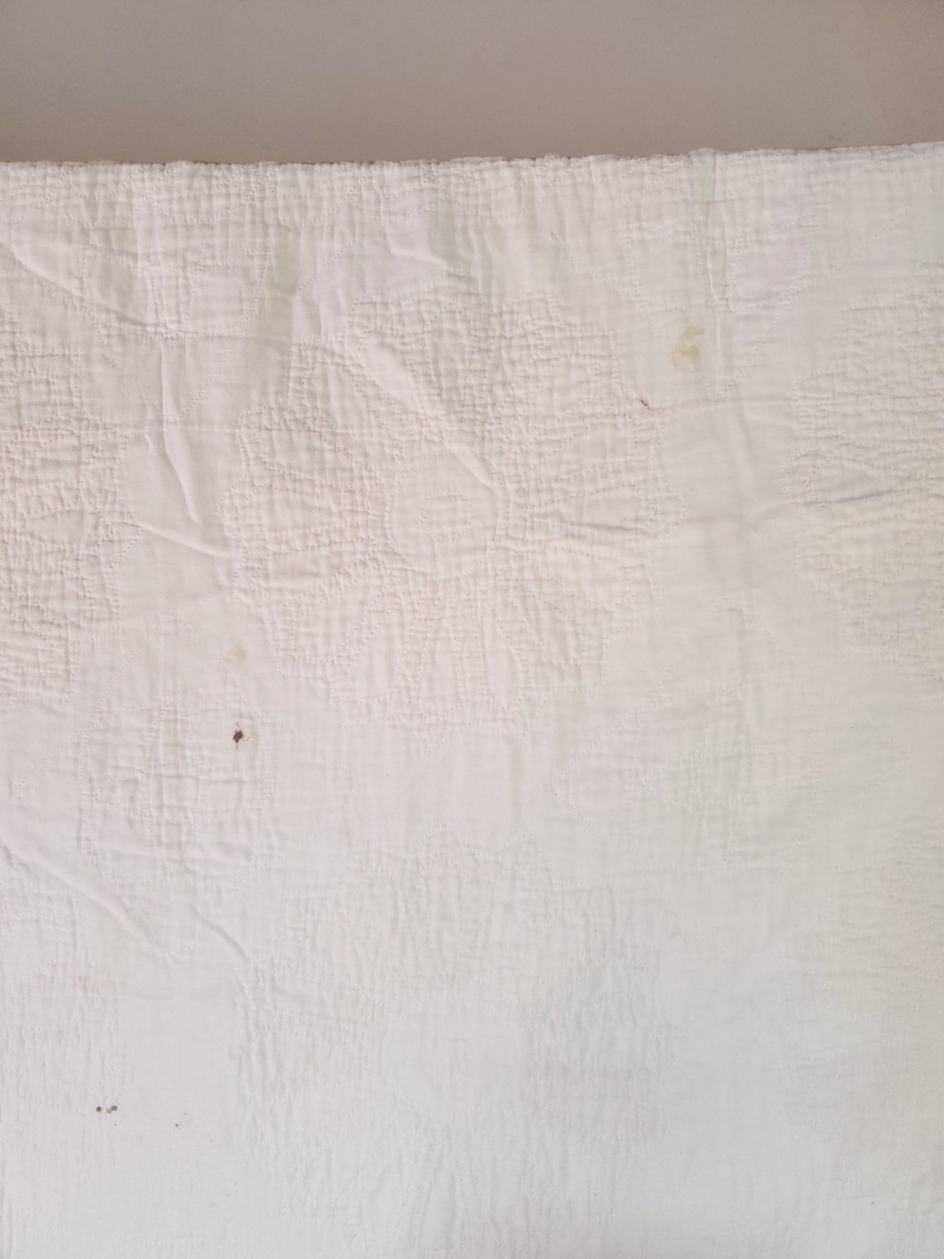 A cheerful early 20th century quilt, circa 1930 with machine applique on the flowers/plates and lovely hand quilting. The border is a bright, butter yellow in a rings print and the flowers/plates contain many dress and/or feed sack prints of the era. There are few patches with thinning and some with fabric loss, but overall it is in good condition. Note the surface tears to the white ground on the front in a few places. The binding has held up well and the white backing has some scattered marks.