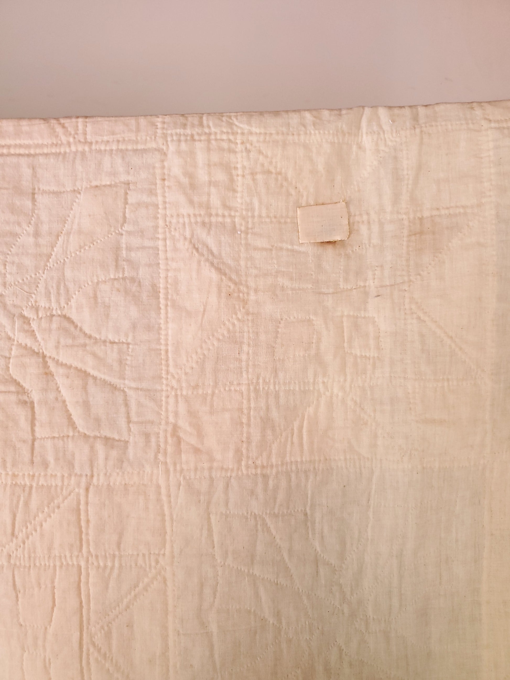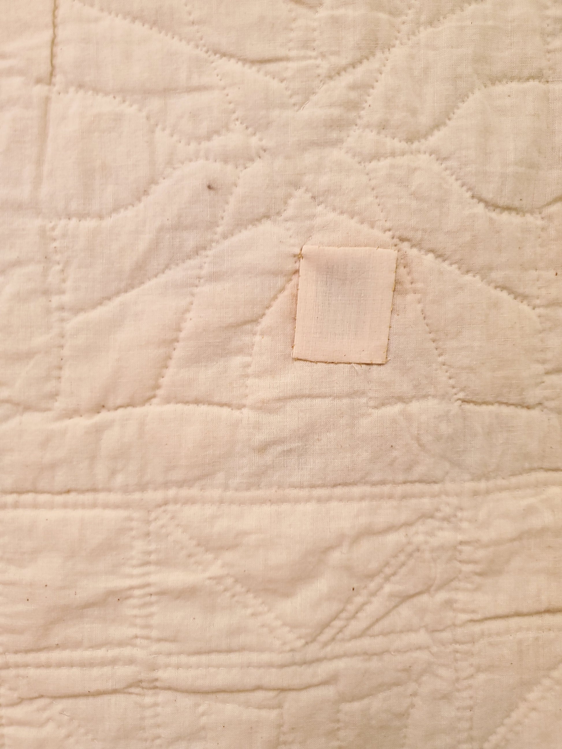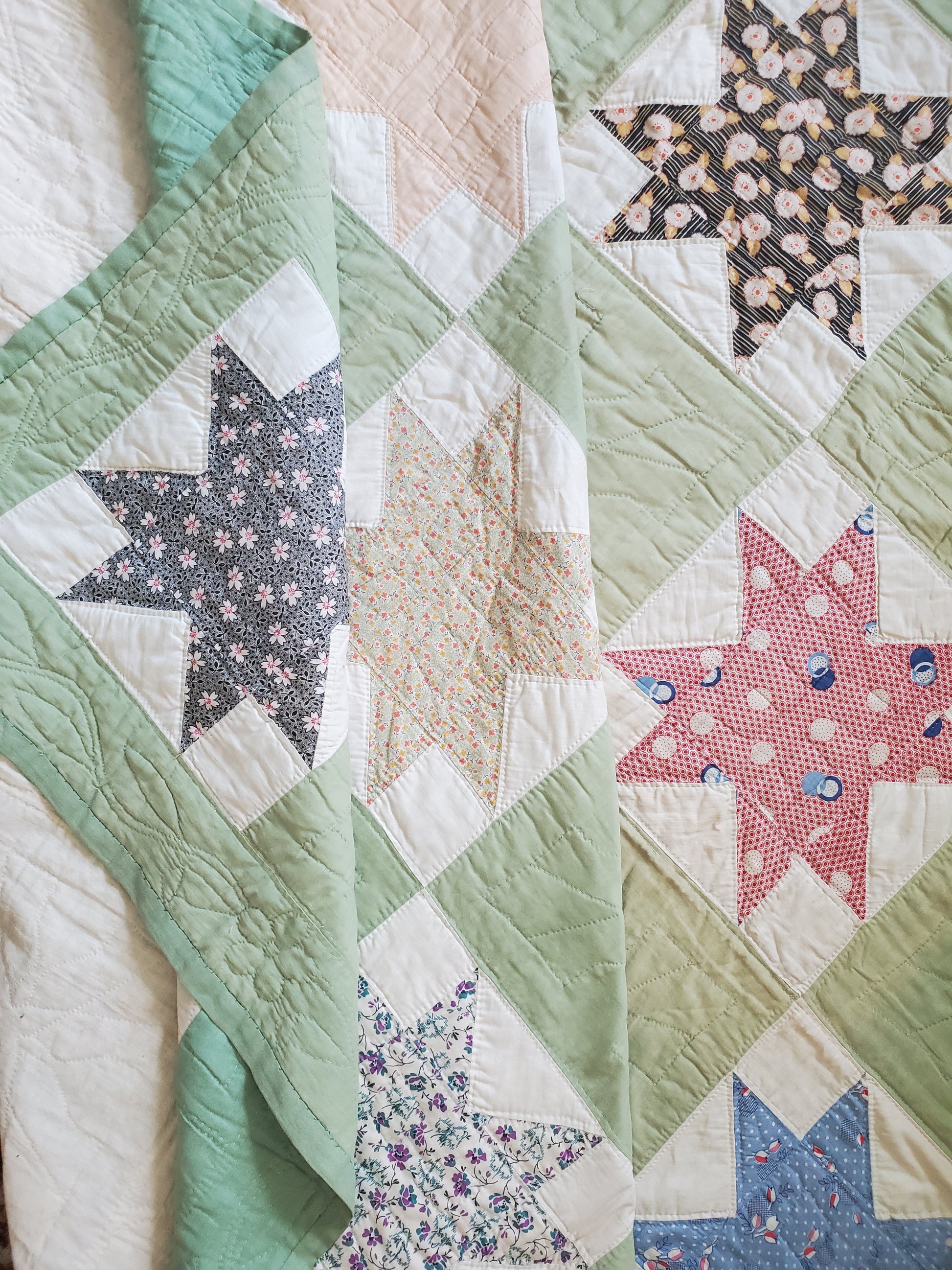 A wonderful, large, hand pieced star quilt from the 1930s. It is completely hand stitched with nicely executed hand quilting. It has two small mends, patches, on the front and back and one brown printed star with a little split and some water mark. There is some light fading to the green in areas from light exposure. Otherwise it is in great condition and is a wonderful size for a bed.
