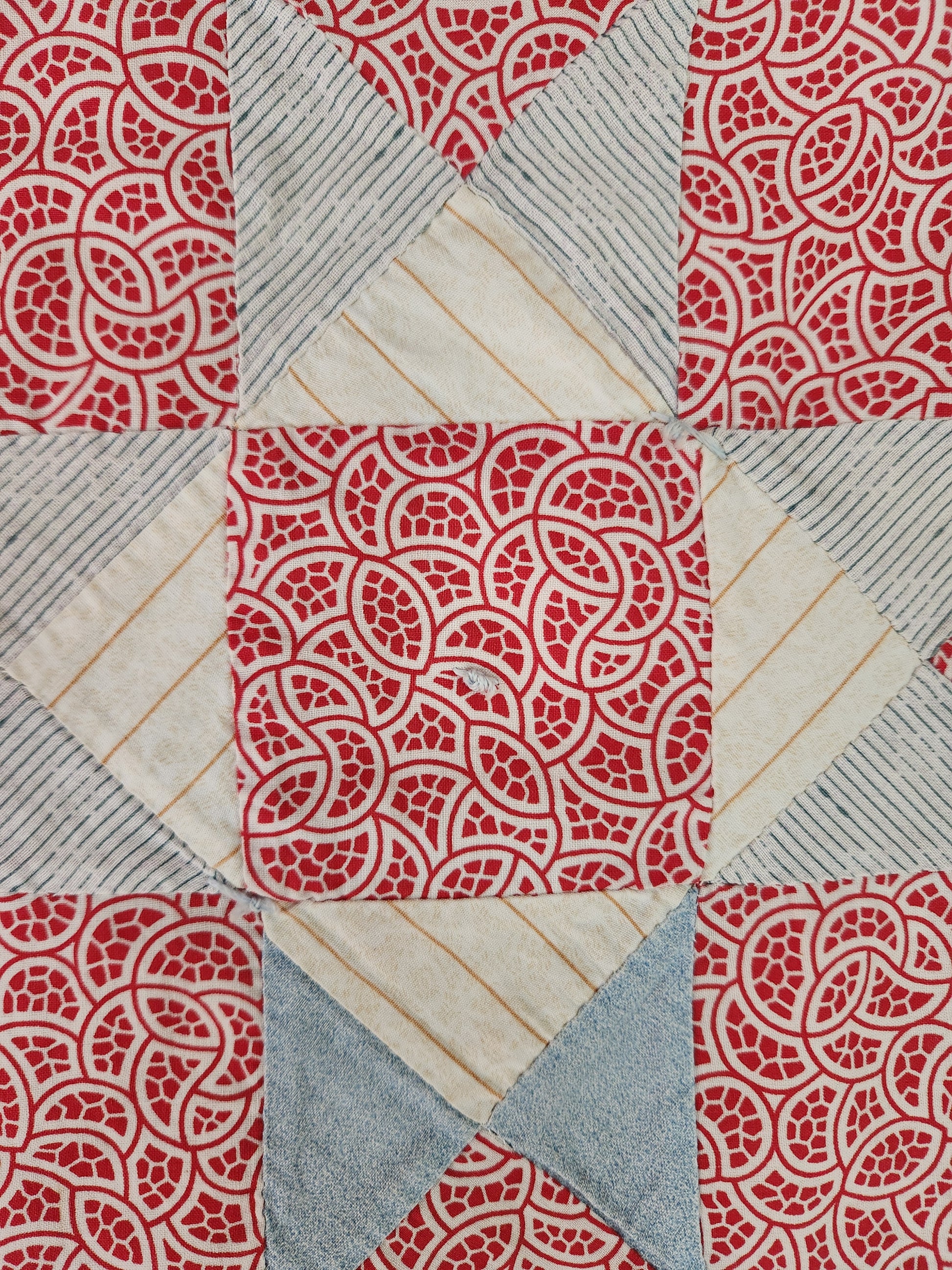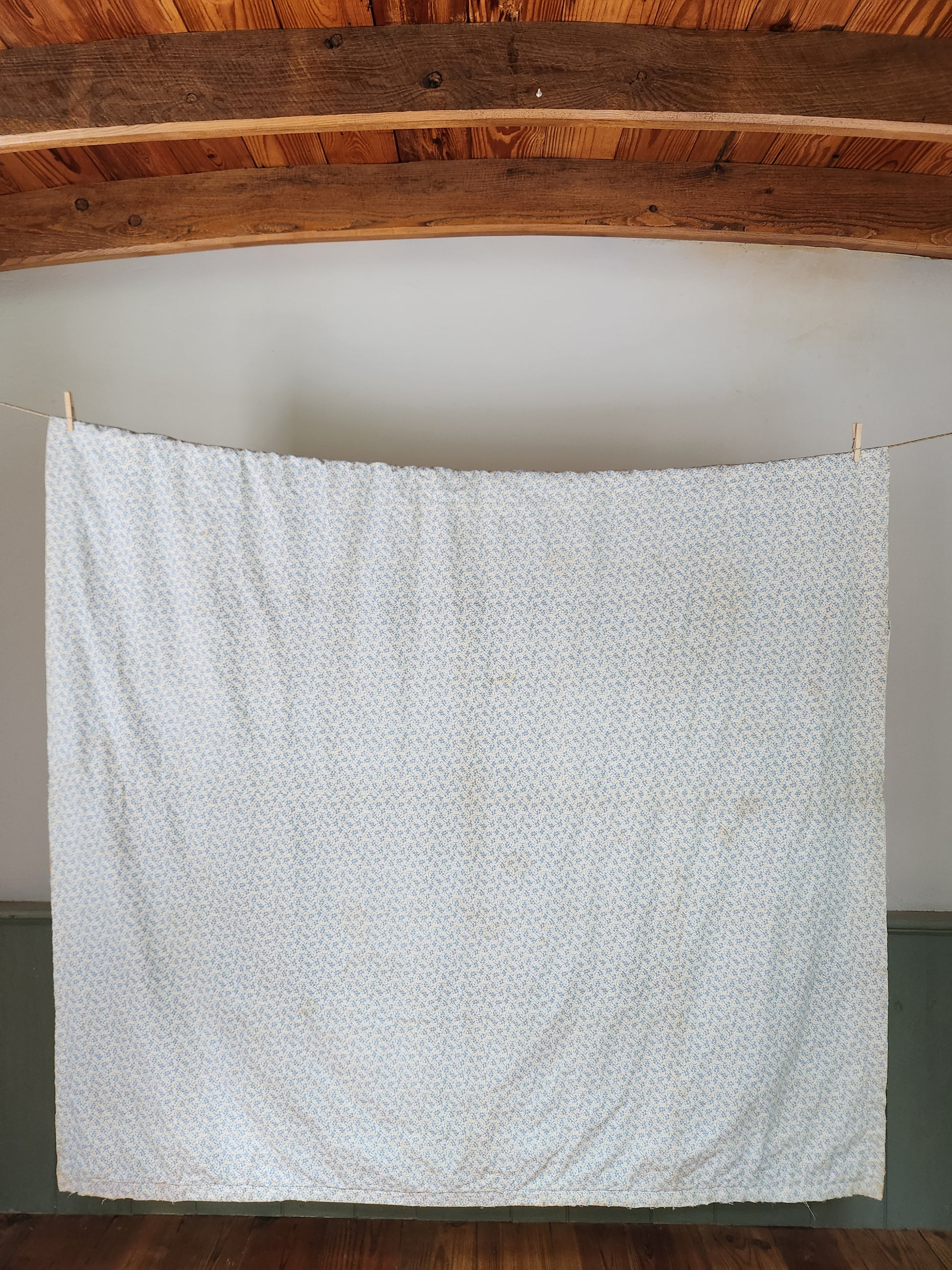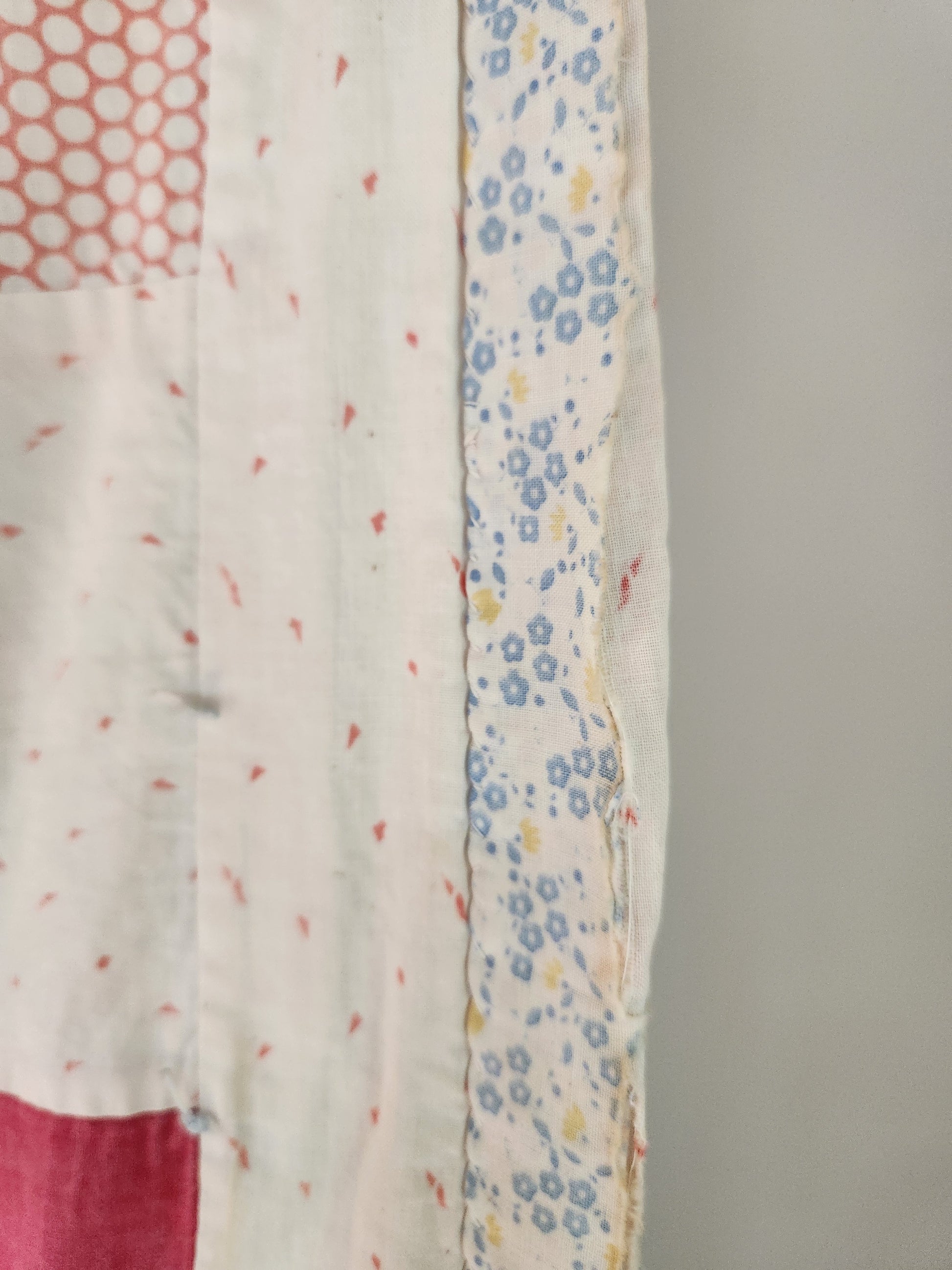 Small hand ties finish off this darling, patchwork star quilt with its sweet floral backing. It is hand pieced and made up of various shirting scraps and other small bits.