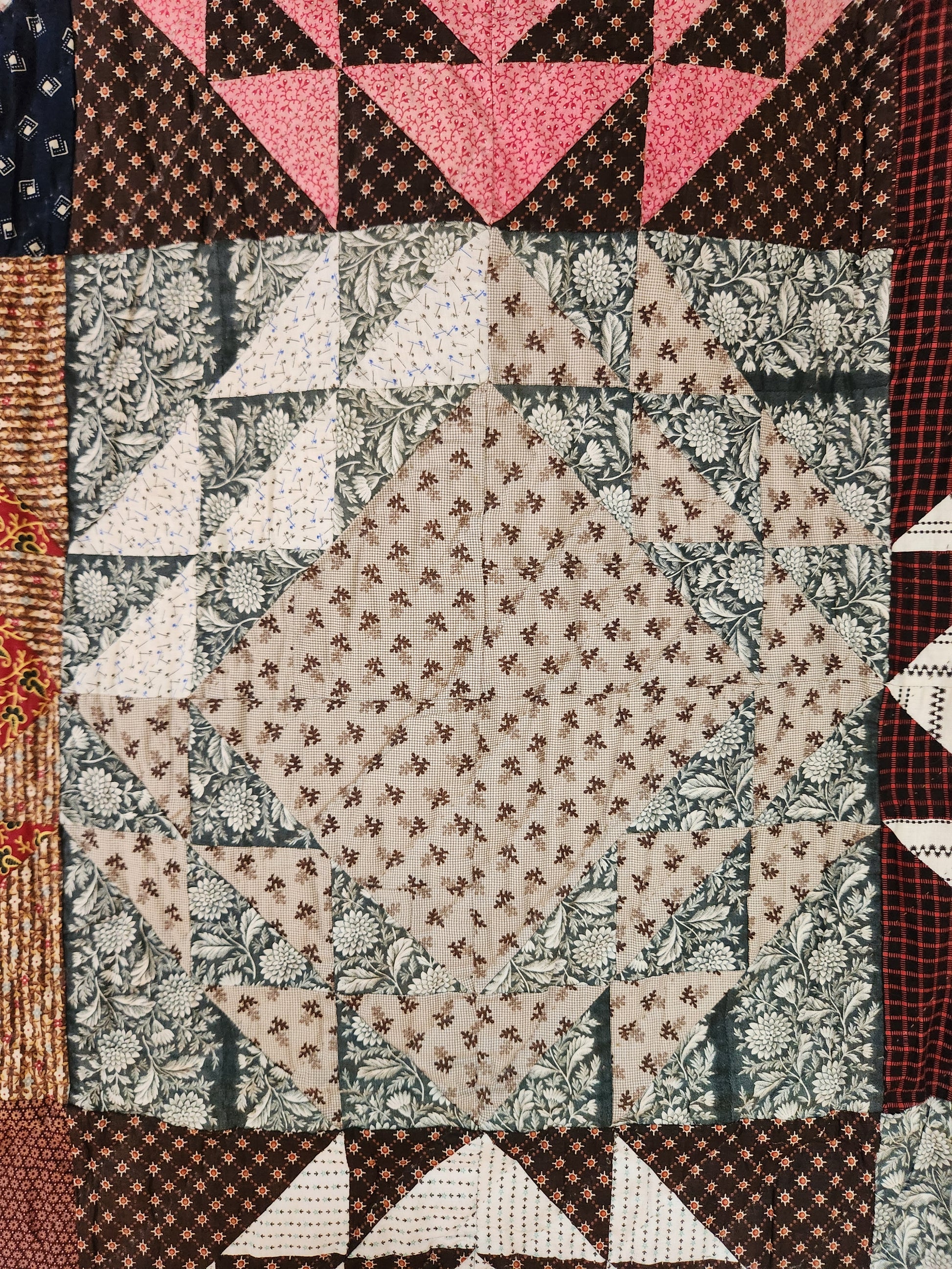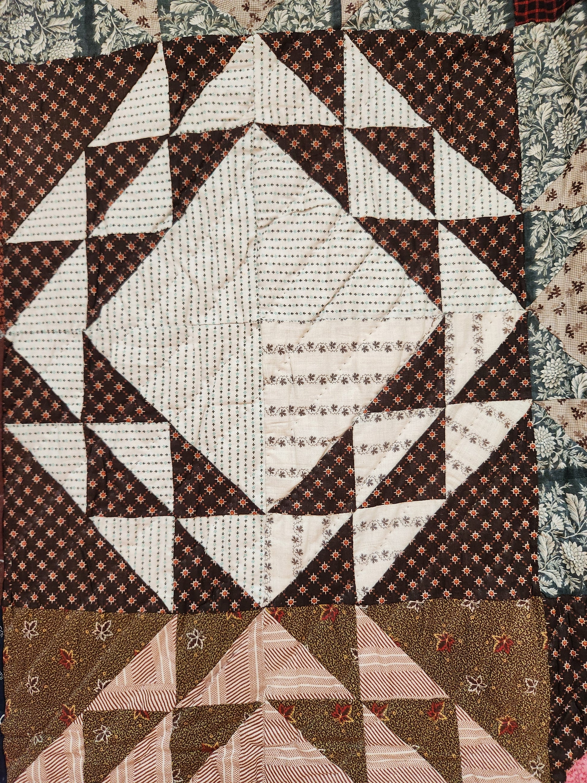 A gorgeous, hand pieced, hand quilted quilt in perfect condition (see note below about backing). The oversized blocks are beautiful, composed of a really lovely mix of shirting and other fabrics, some glazed cottons... great prints.