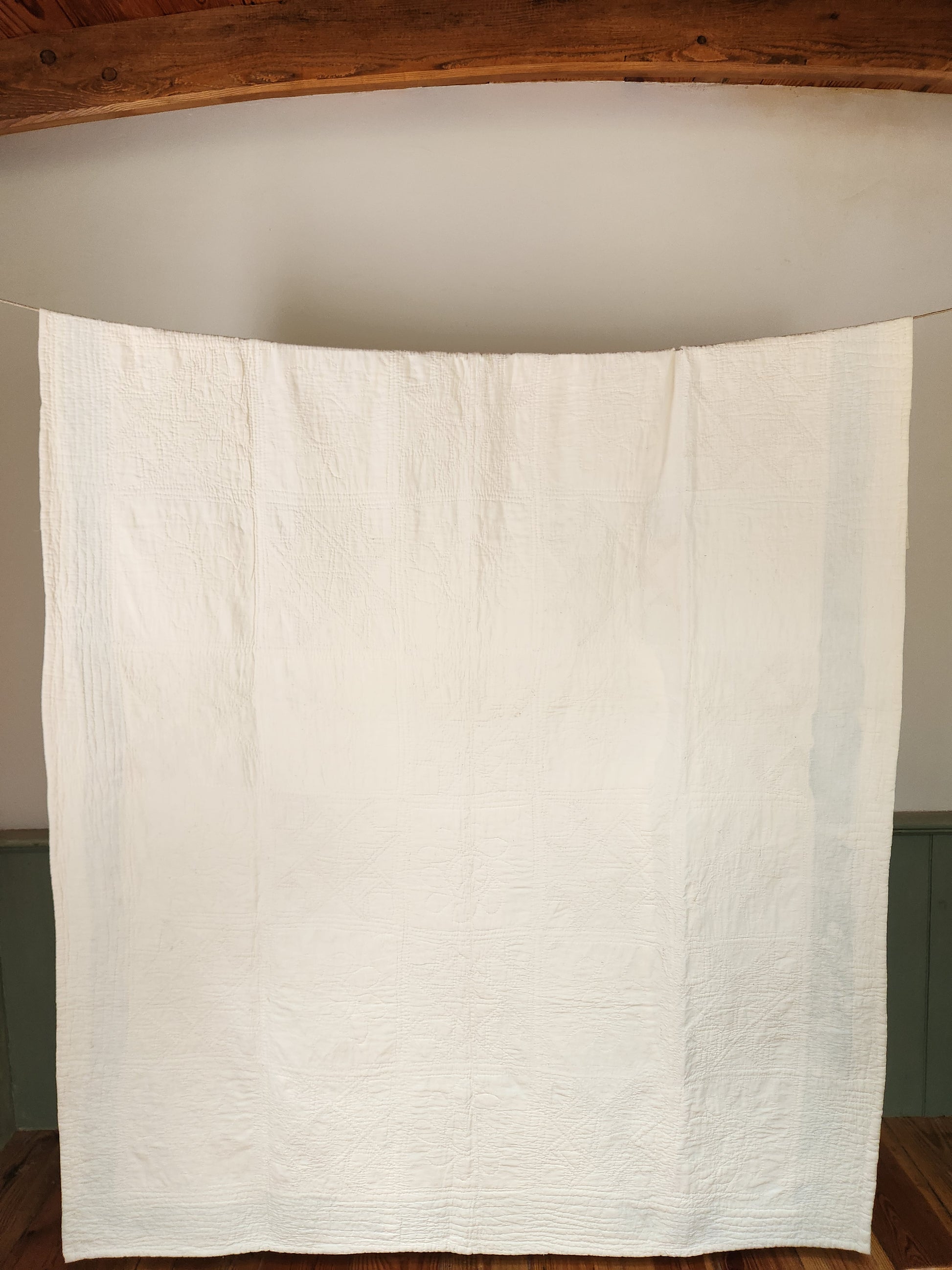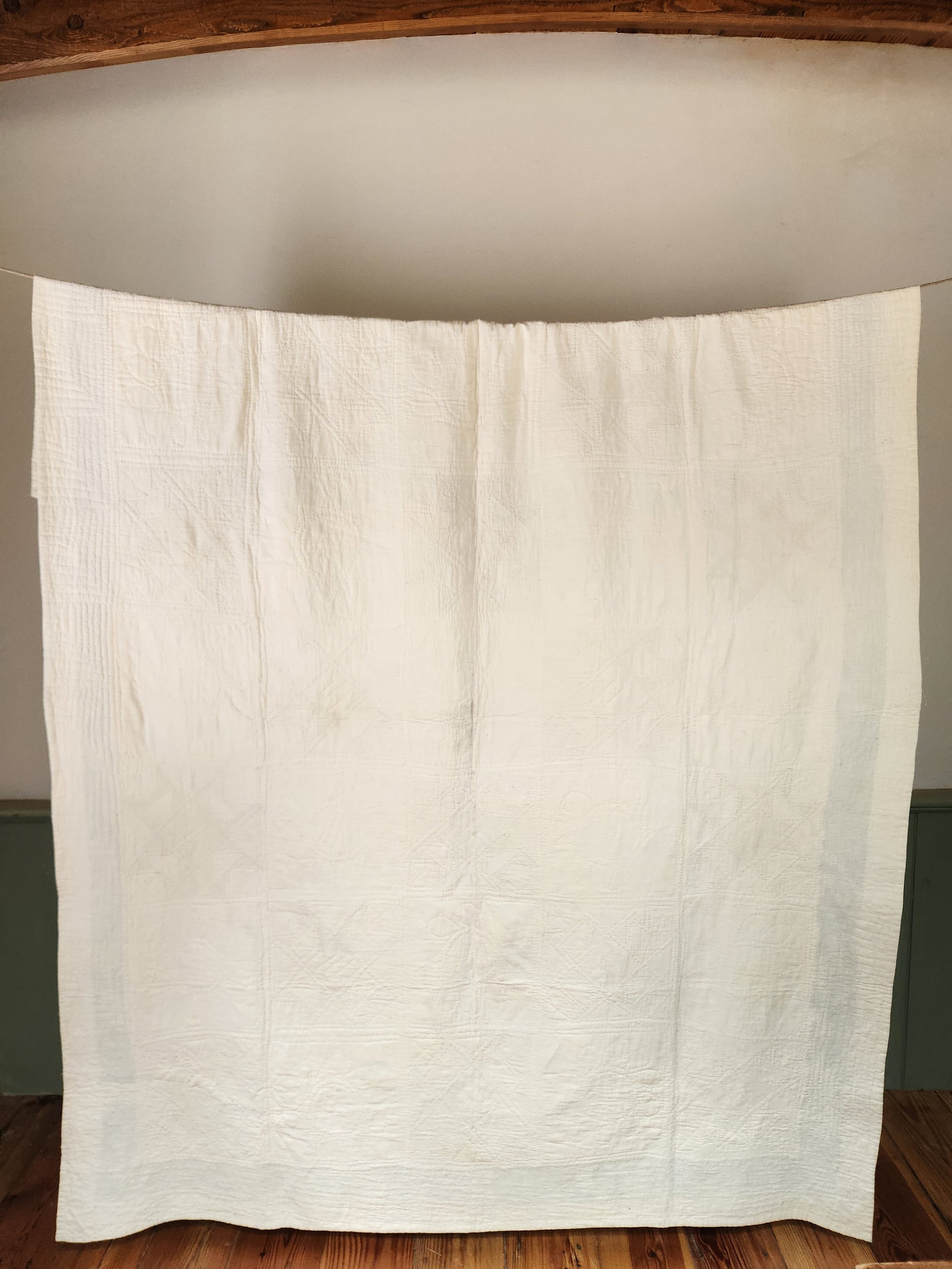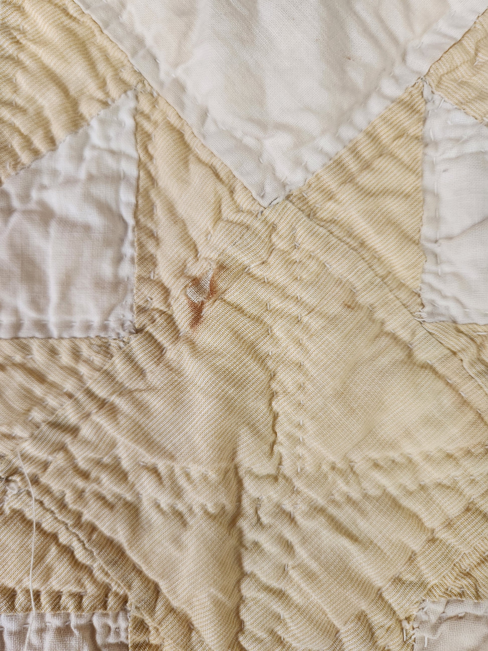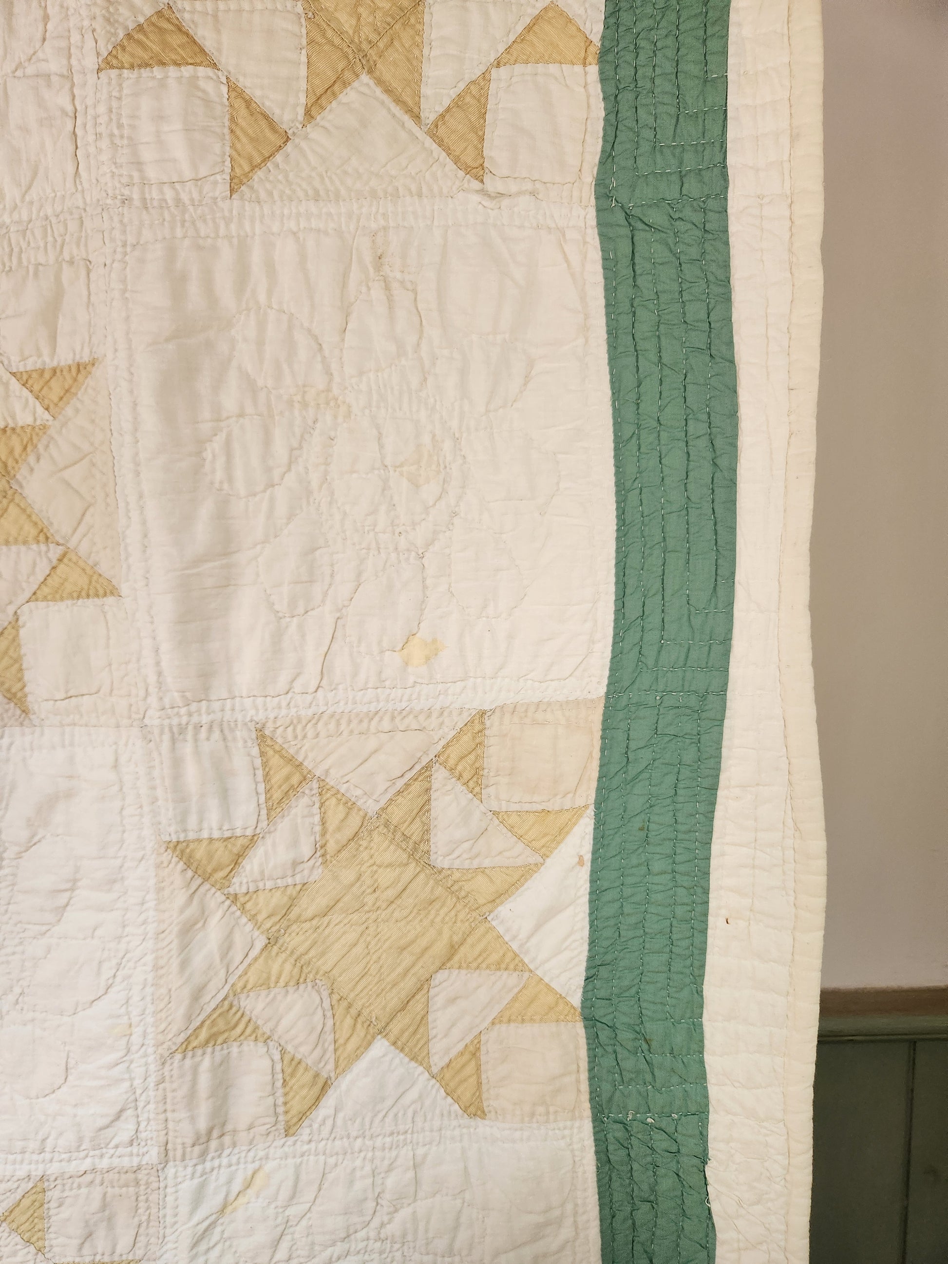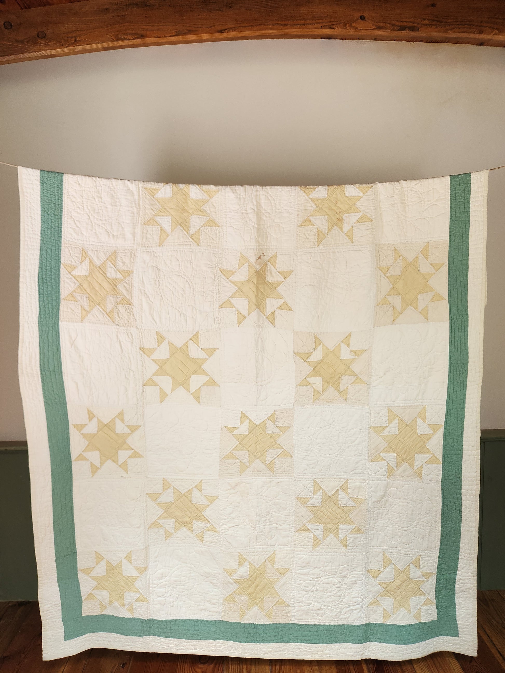 A wonderful *set of two*hand pieced quilts with hand quilting throughout. The stars are a pale yellow and white, fine stripe and the border a light, Nile Green.