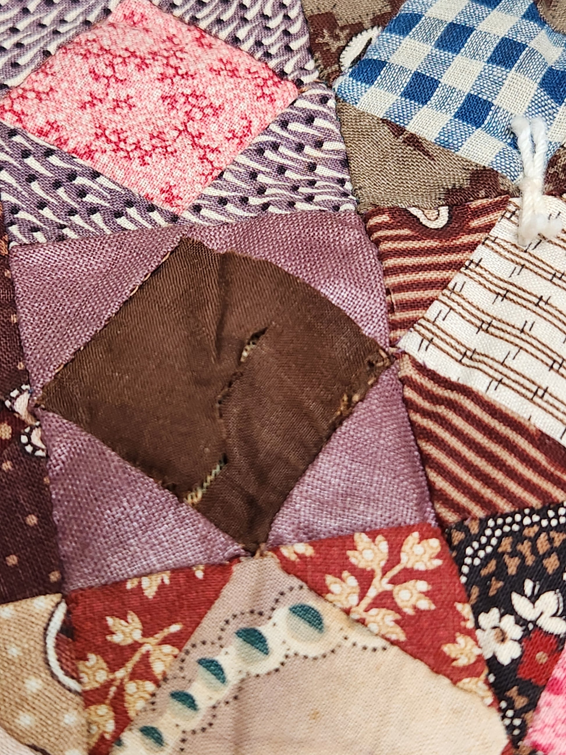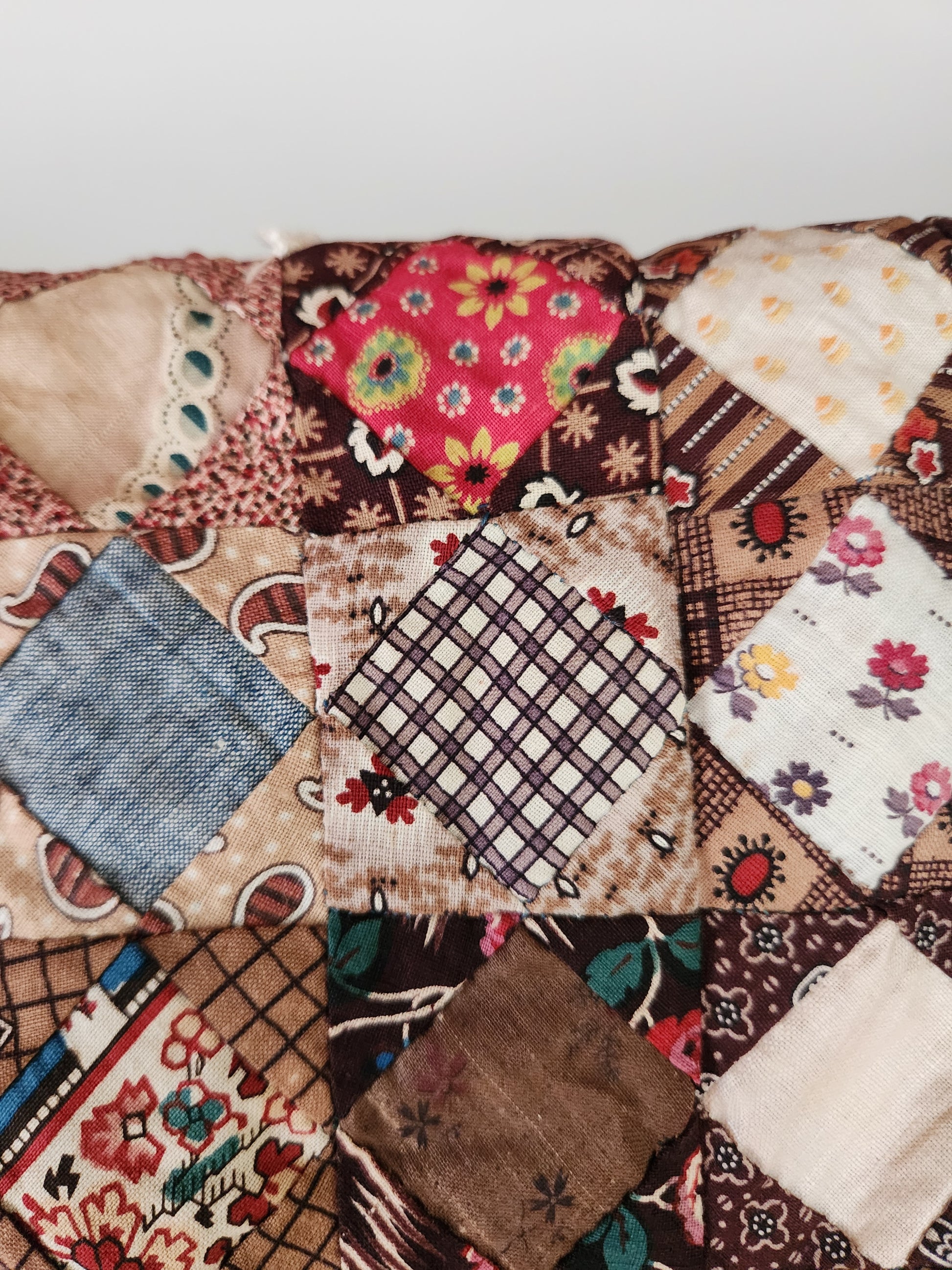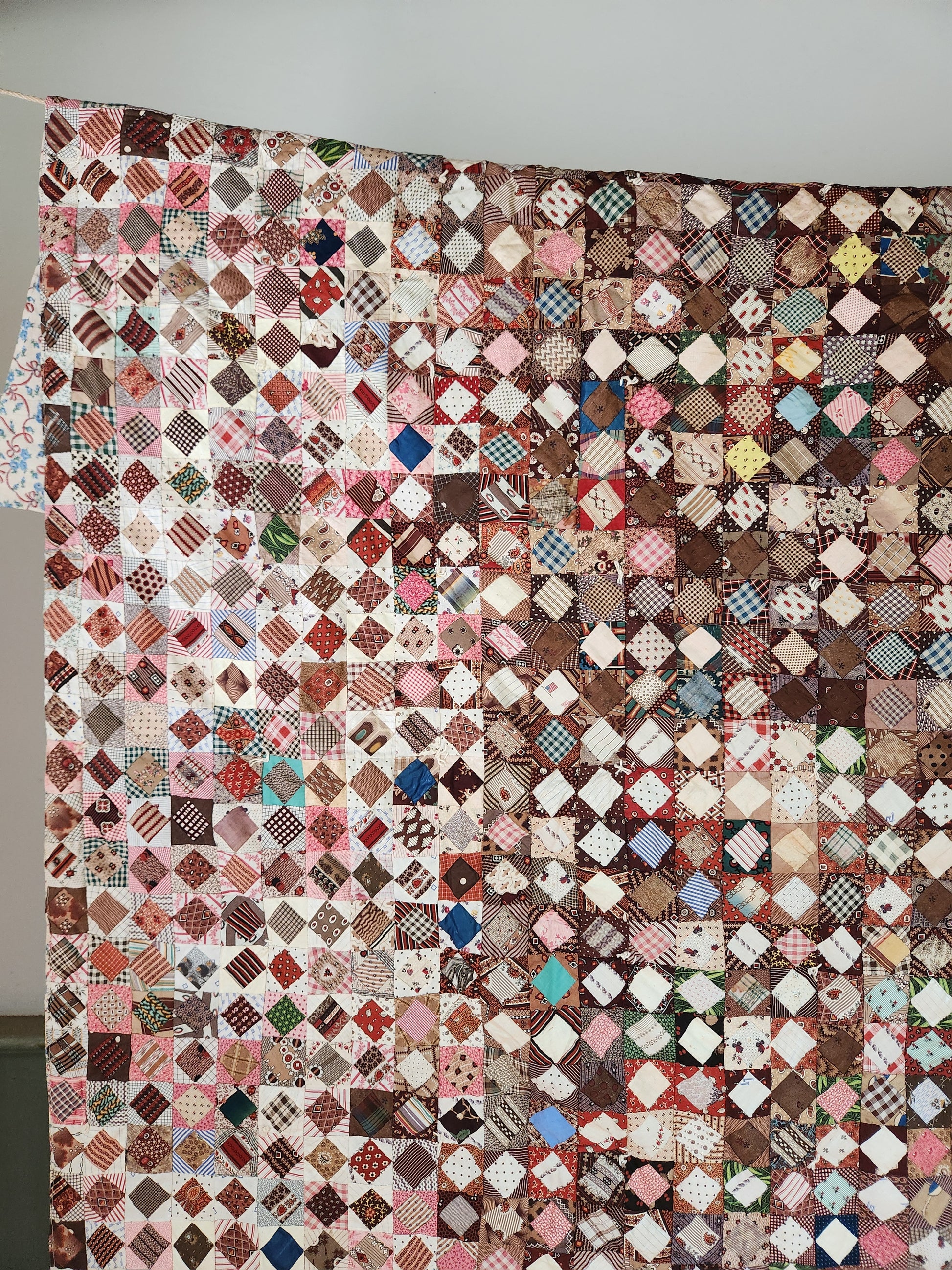 This is a quirky quilt with a few surprises. First, it was completed circa 1940 but boasts an INCREDIBLE, hand pieced quilt top circa 1880/1890 full of hundreds and hundreds of tiny blocks. It is a true study in 19th century fabrics. Secondly, there is another quilt inside of it. It was finished in the mid 20th century with a ribbon print backing which is visible on the front as well on two adjacent sides. The whole quilt is hand tied with white yarn.