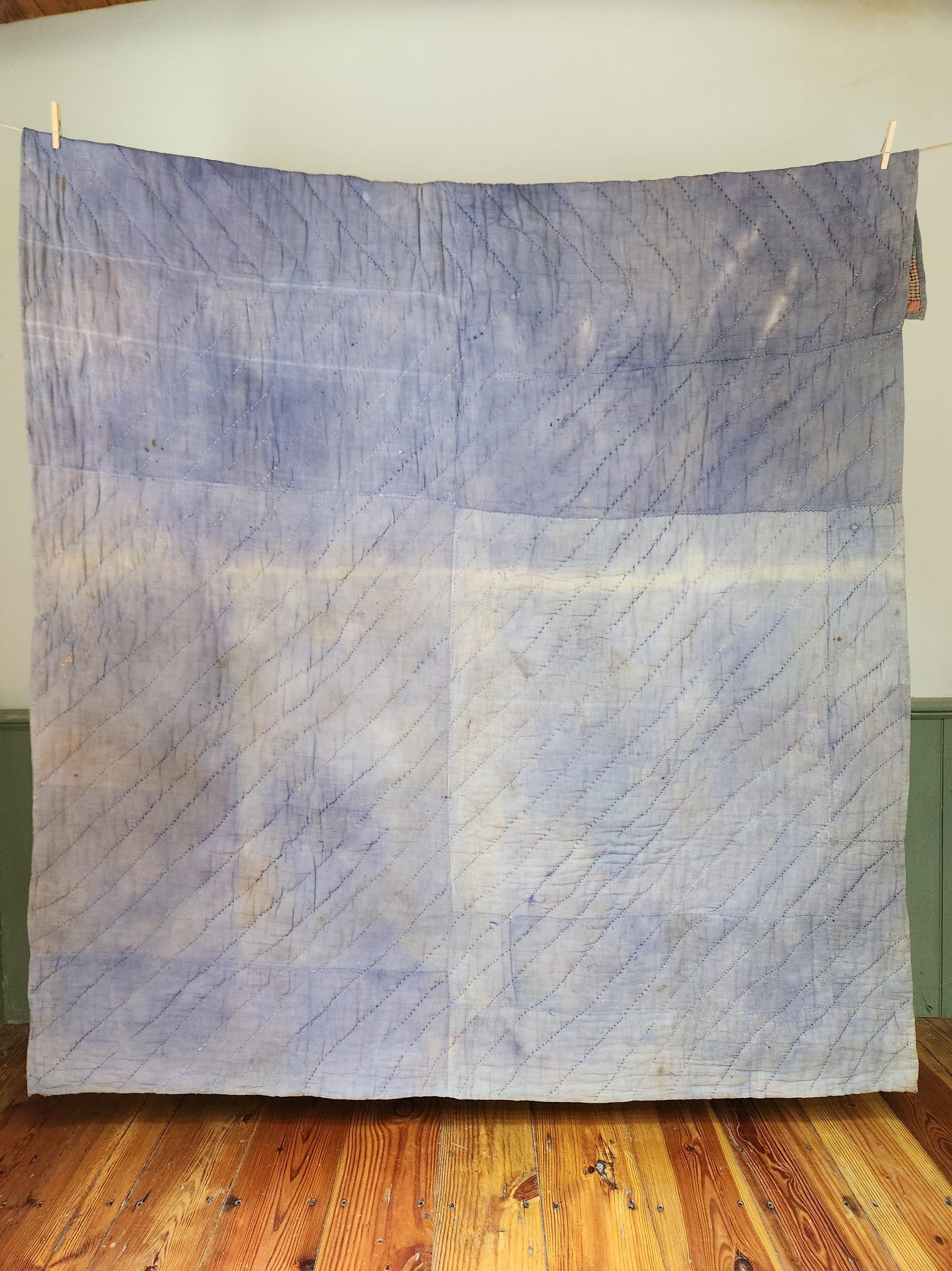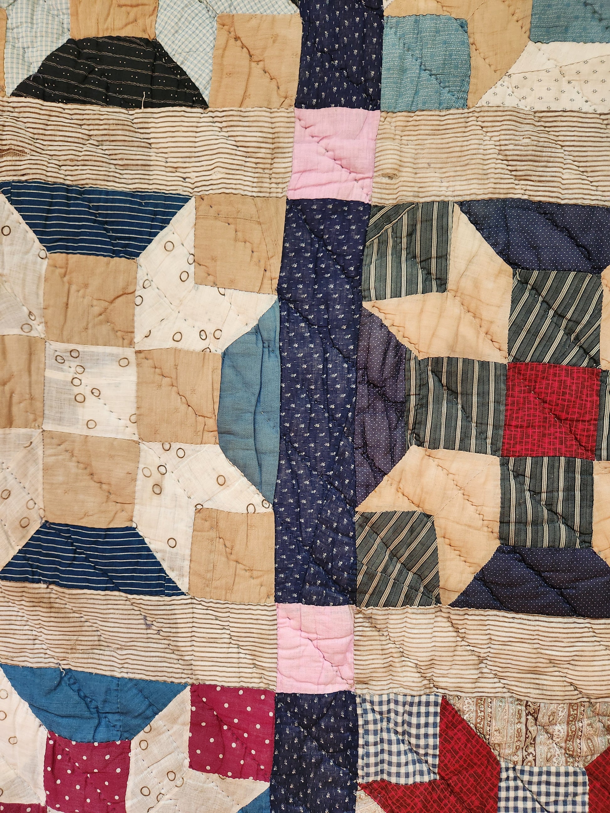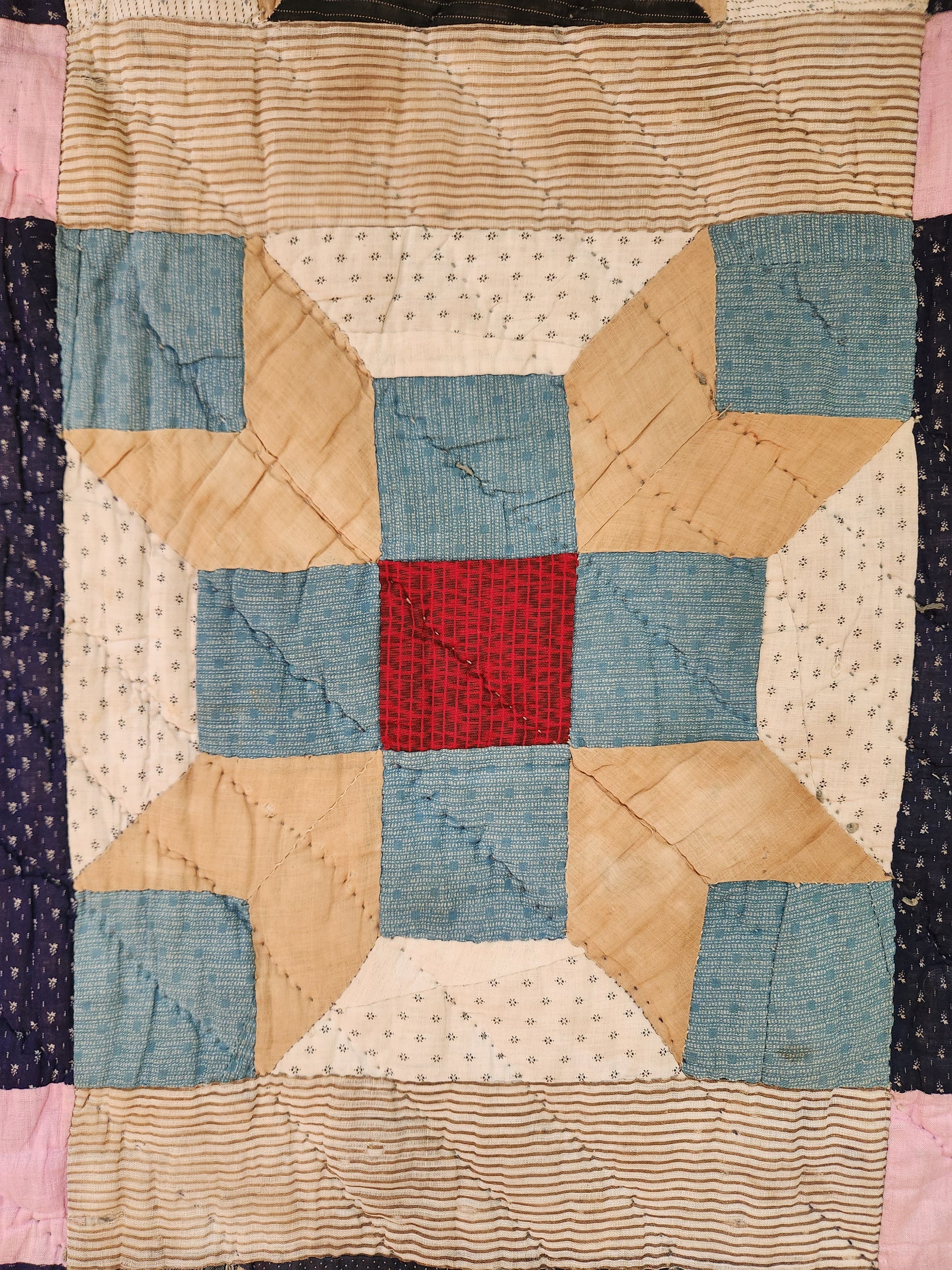 Hand pieced and hand quilted, this was most certainly a use-quilt. It has a home-dyed, feed sack cloth backing (faded now). It is unwashed to preserve the striped border and sashing which is thinning. Displays well.