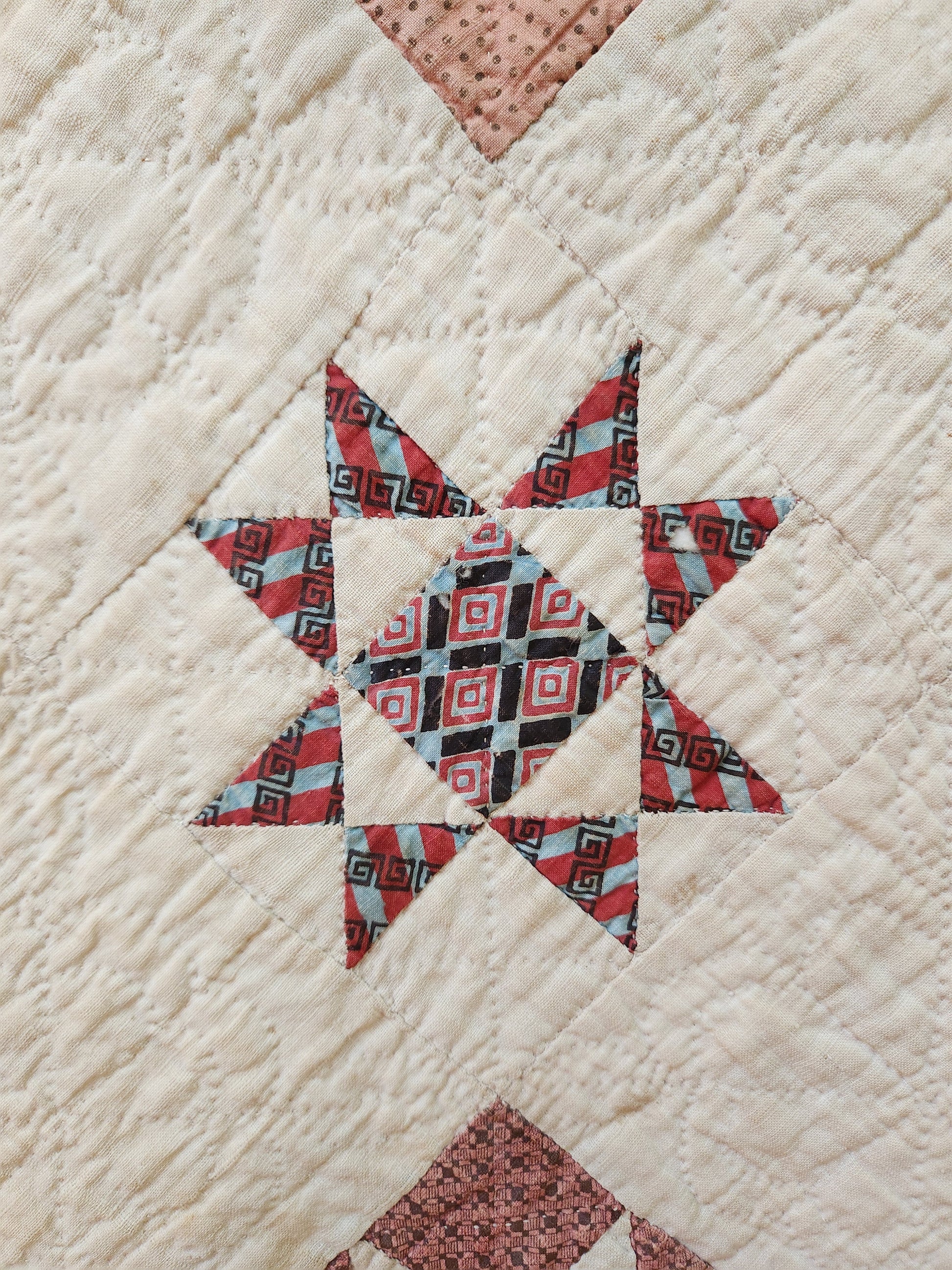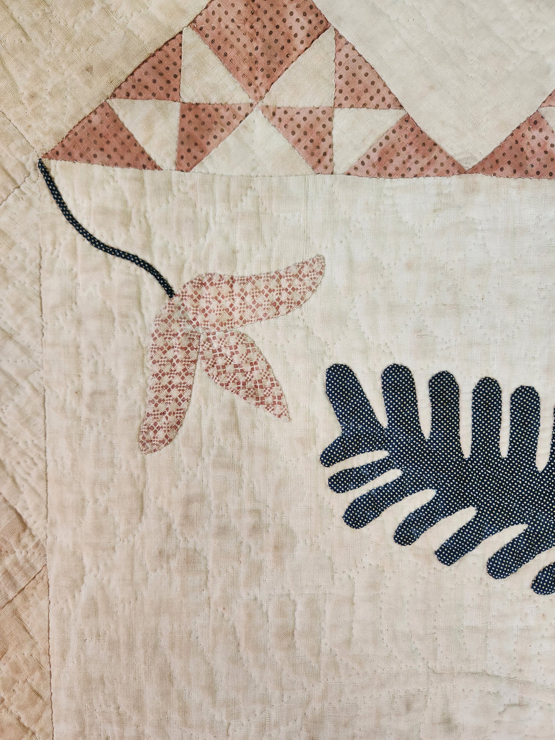 A fabulous, early Princess Feather Quilt in a New England style with rounded bottom corners to accommodate a bed with posts. This quilt, sourced in Connecticut, has lovely and unique composition with the appliqued princess feathers at the center and applique tulips, with the thinnest of stems, in the four corners of the center medallion. Surrounding the center are star blocks, pieced with early 19th century prints (some fabulous early block prints etc).