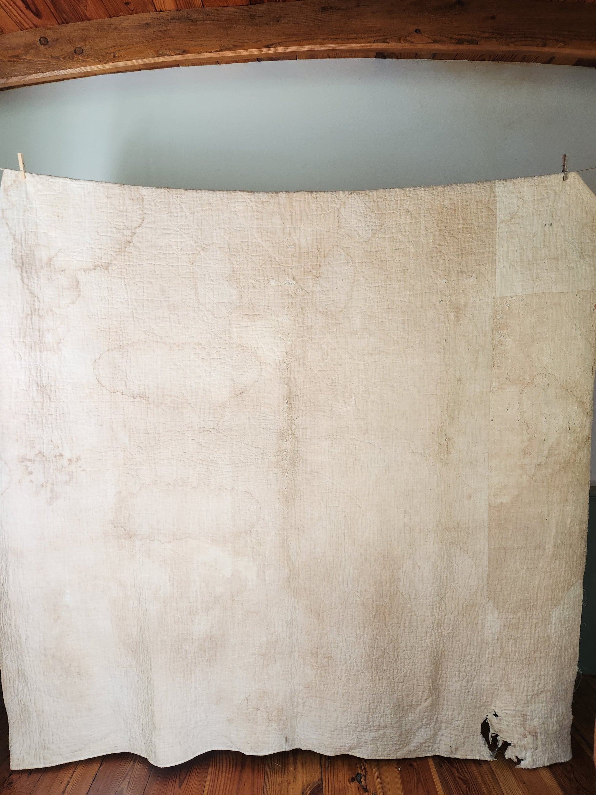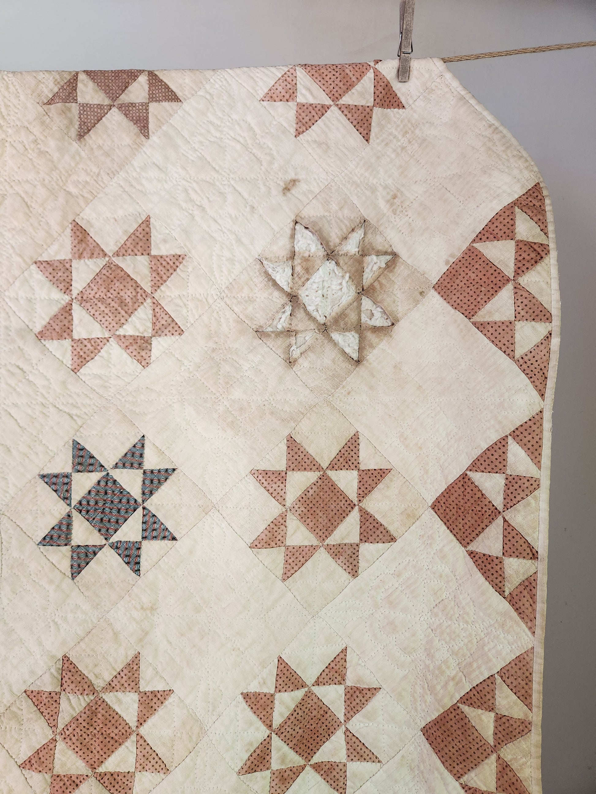 Condition: There is great wear, from use, to the backing with the batting showing especially along the edges and fold lines. General discoloration and yellowing from age/use, good patina. There are several blocks where the brown have been lost and also left discoloration in the surrounding fabric, with the worst one located at the top edge where you will note it has torn. This incredible quilt is well worth restoration efforts or can be enjoyed as is per your preference.