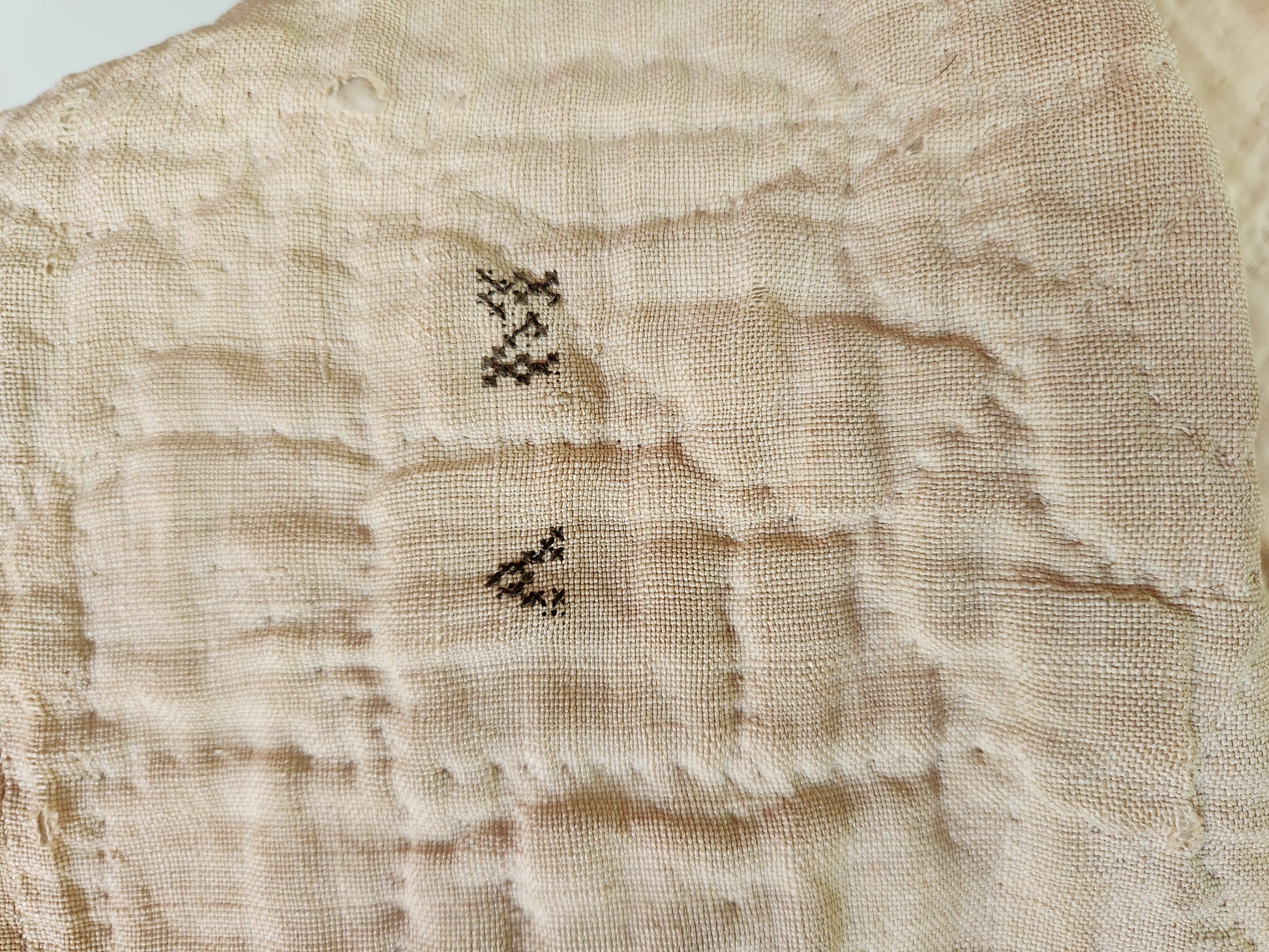 The backing is done in woven linen in several different sections pieced together. The binding is done in a hand woven tape and there are two separate sets of cross stitched initials on opposite back corners, one blue and the other brown.