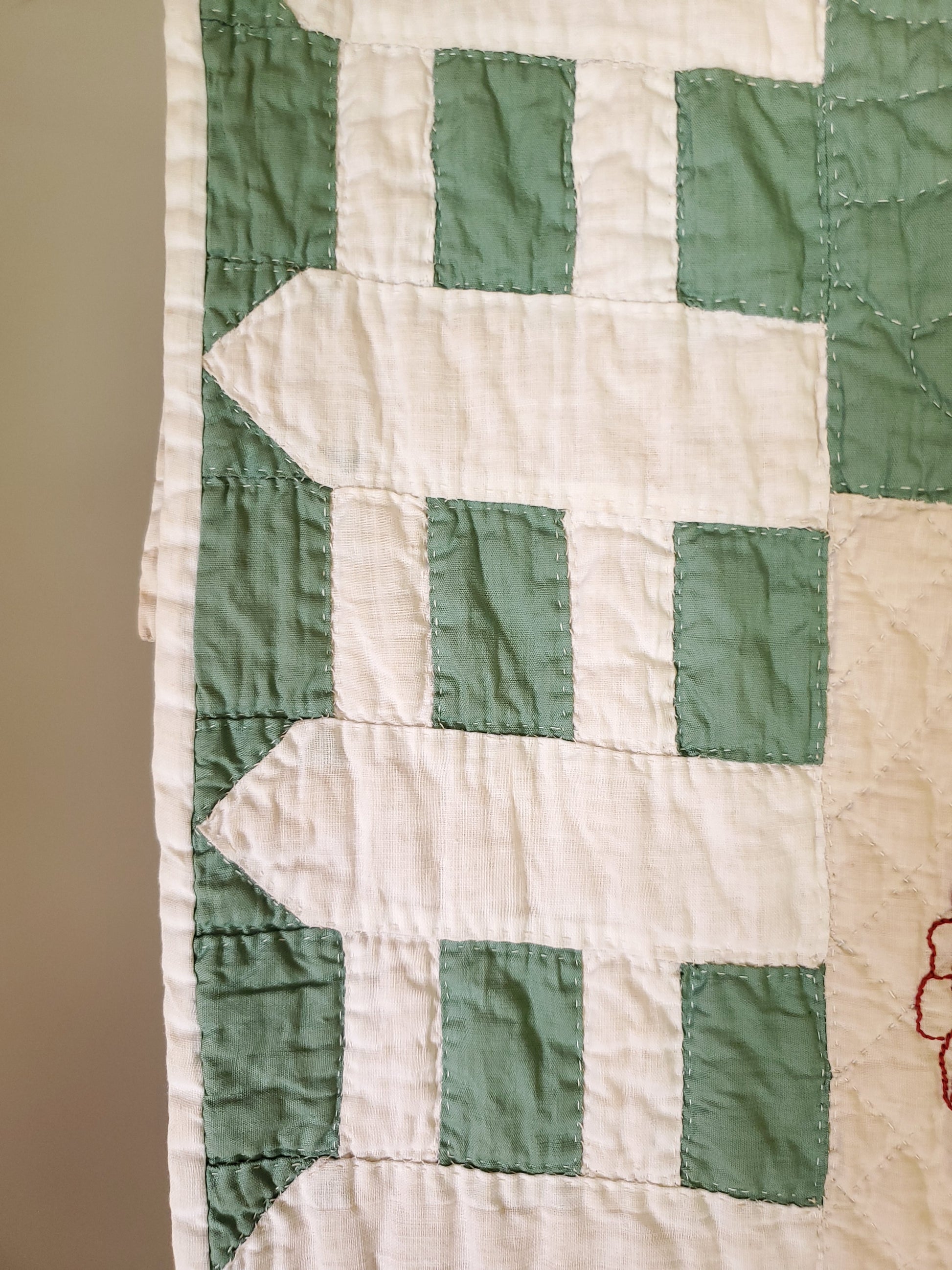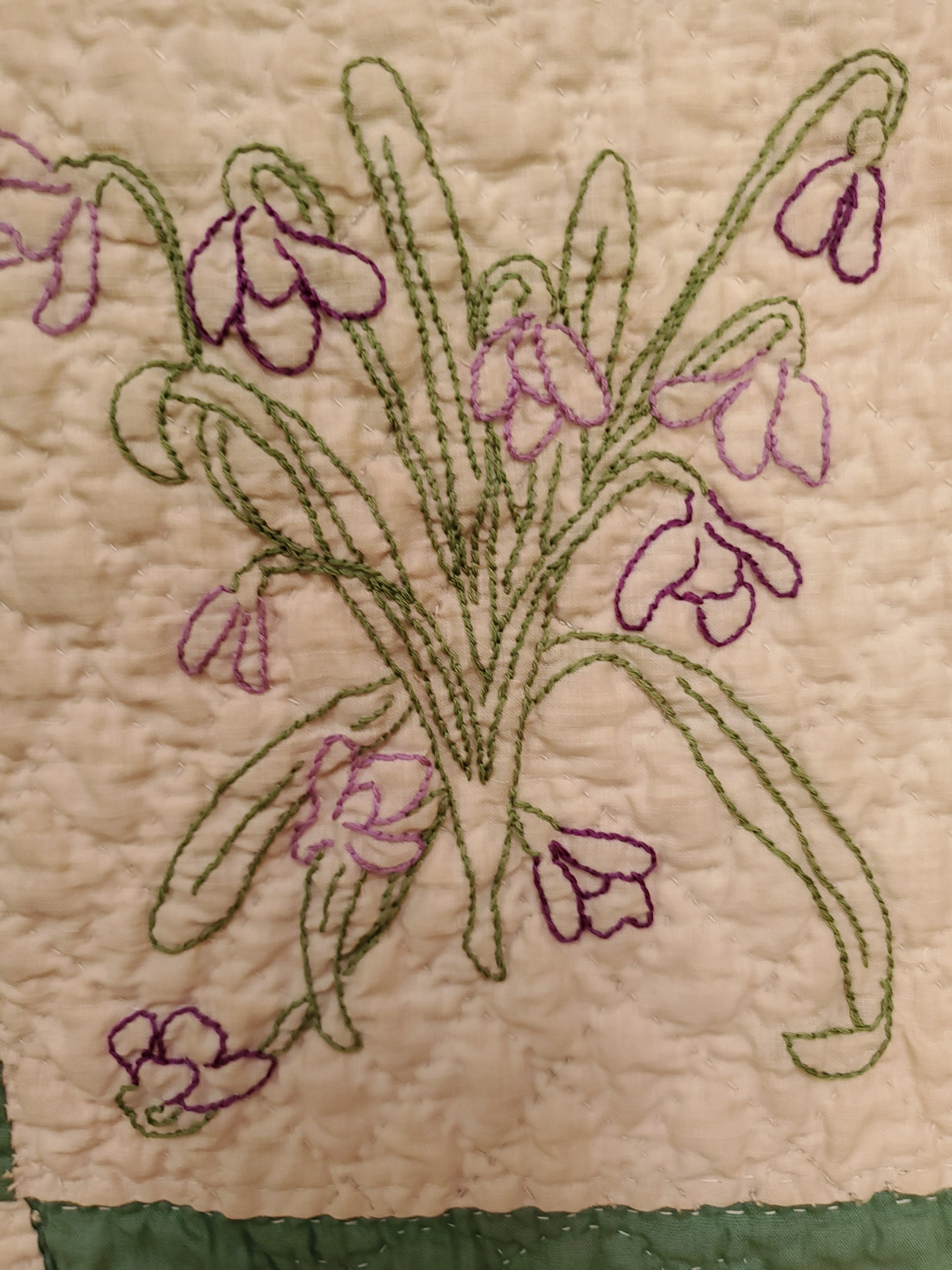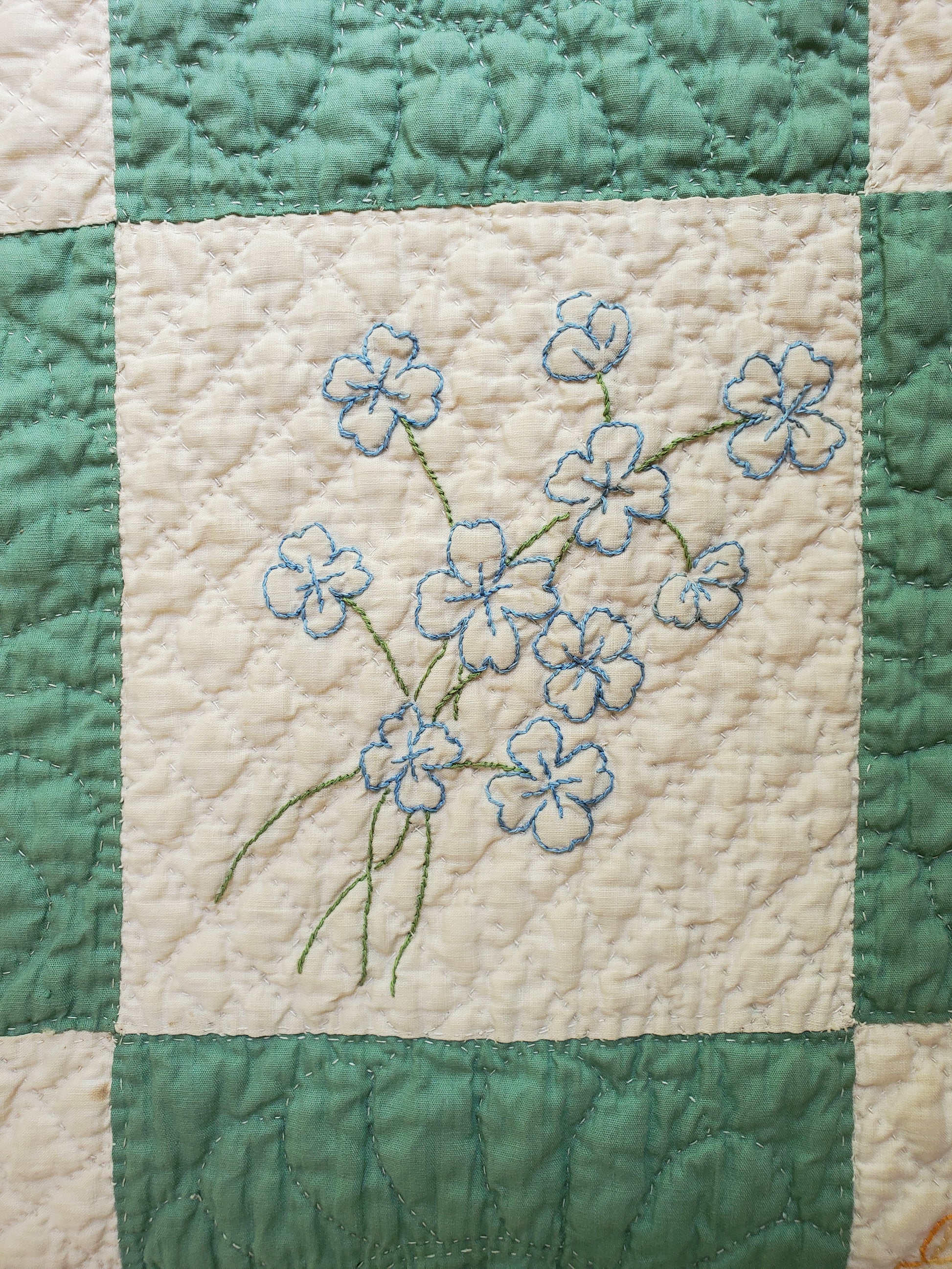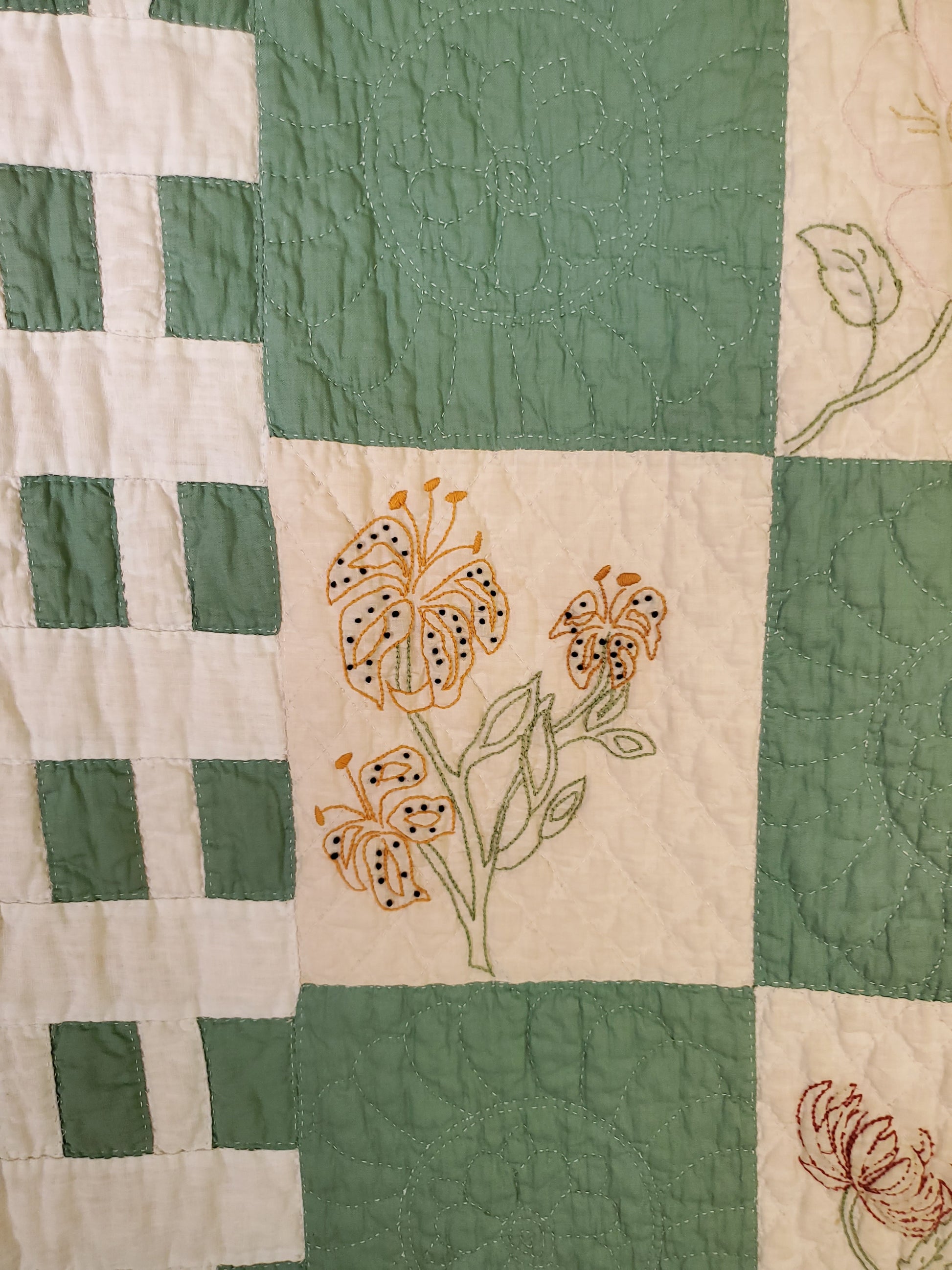 Ruby McKim is a very well known quilt pattern designer of the early to mid 20th century. As an artist who enjoyed drawing from a young age, many of her designs are recognizable in that they include embroidered blocks resembling line "drawings" like these flowers.