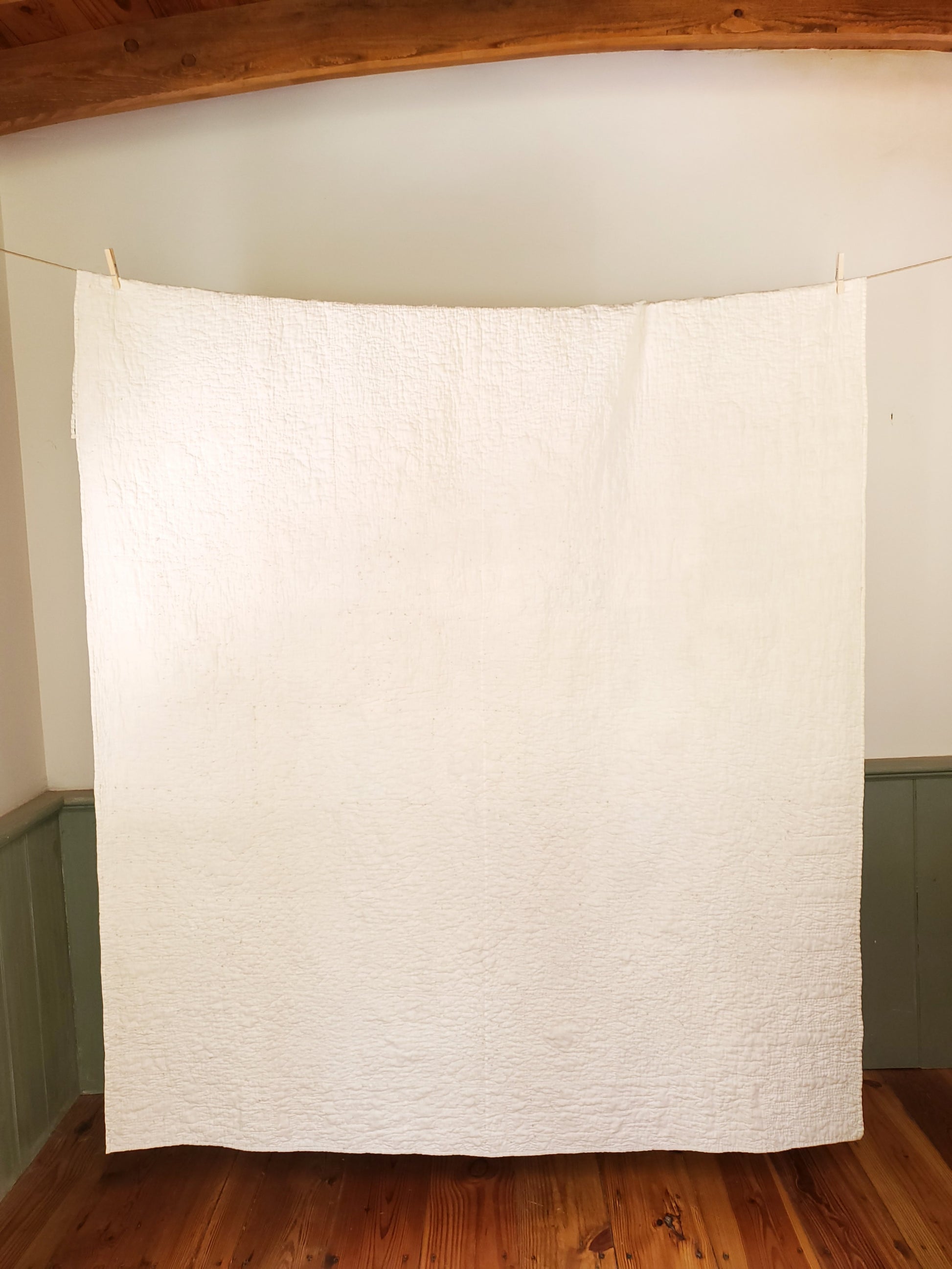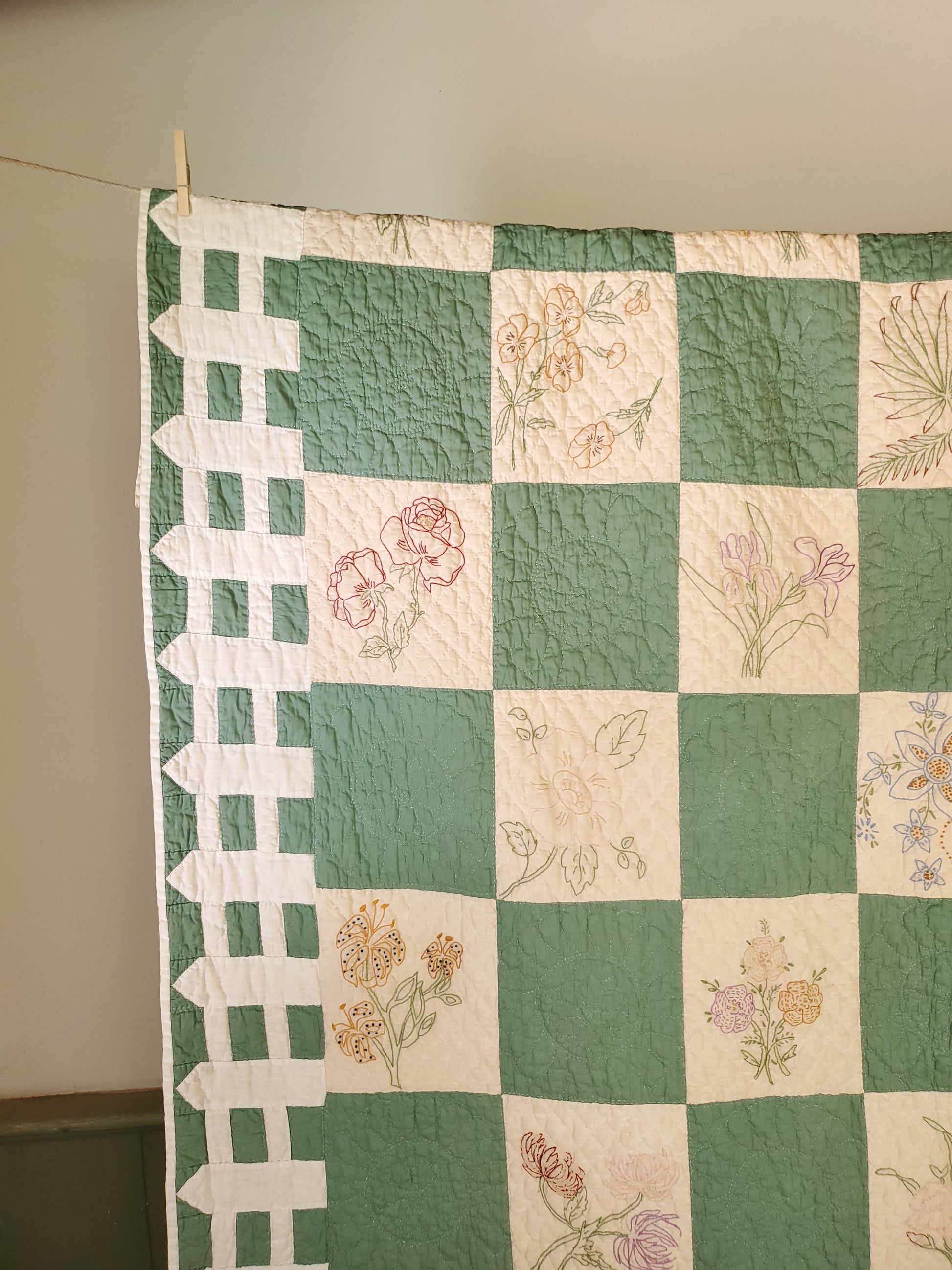 Collector's quality, freshly washed for the first time. Has a great, soft "quilt crinkle". Some minor toning to the fabric used in the embroidered blocks. Hand stitched and hand quilted. The quilter did not hide their knots and those knots are visible on the backing. The flowers are in very good condition with one red chrysanthemum showing thread loss.