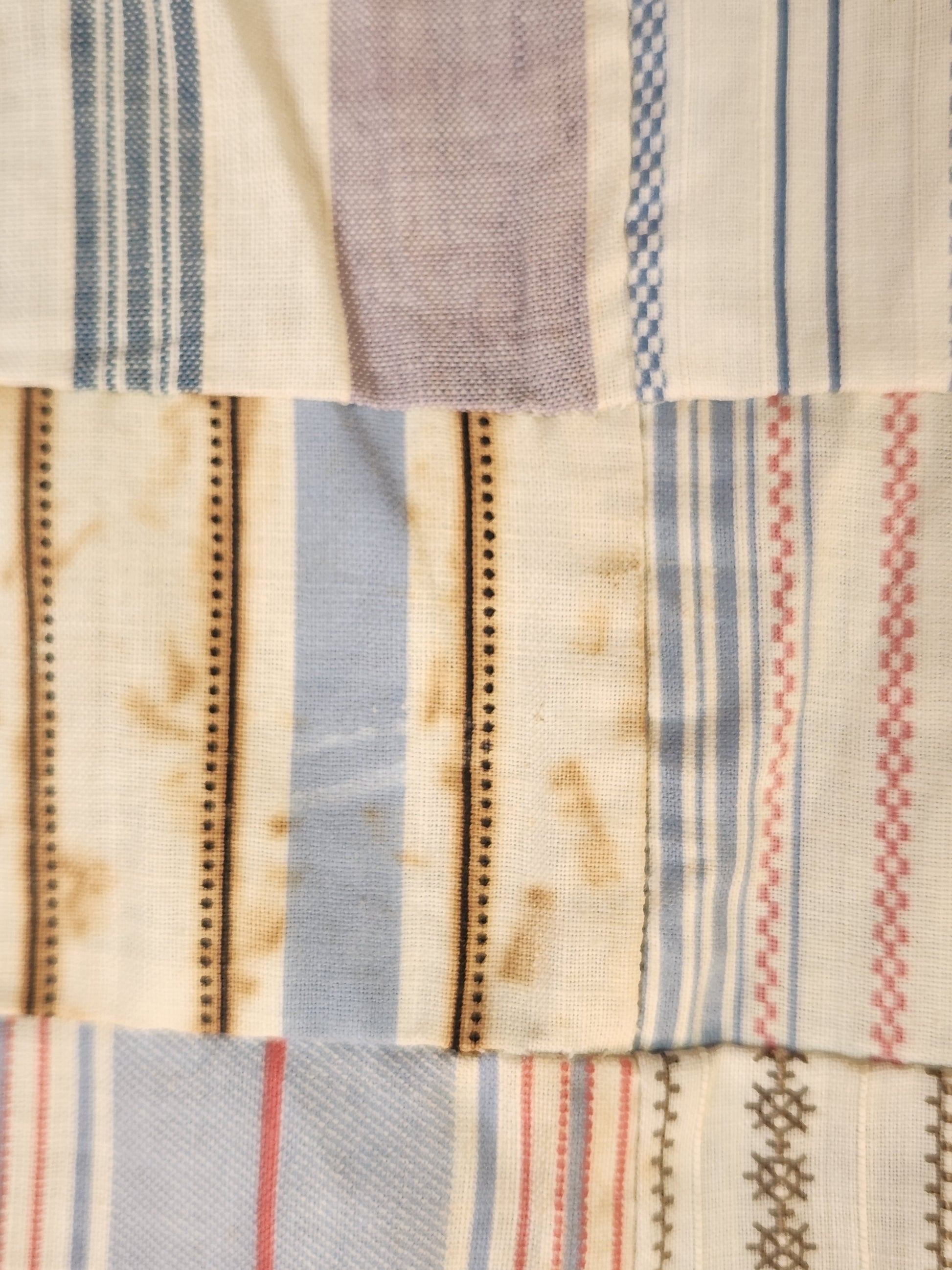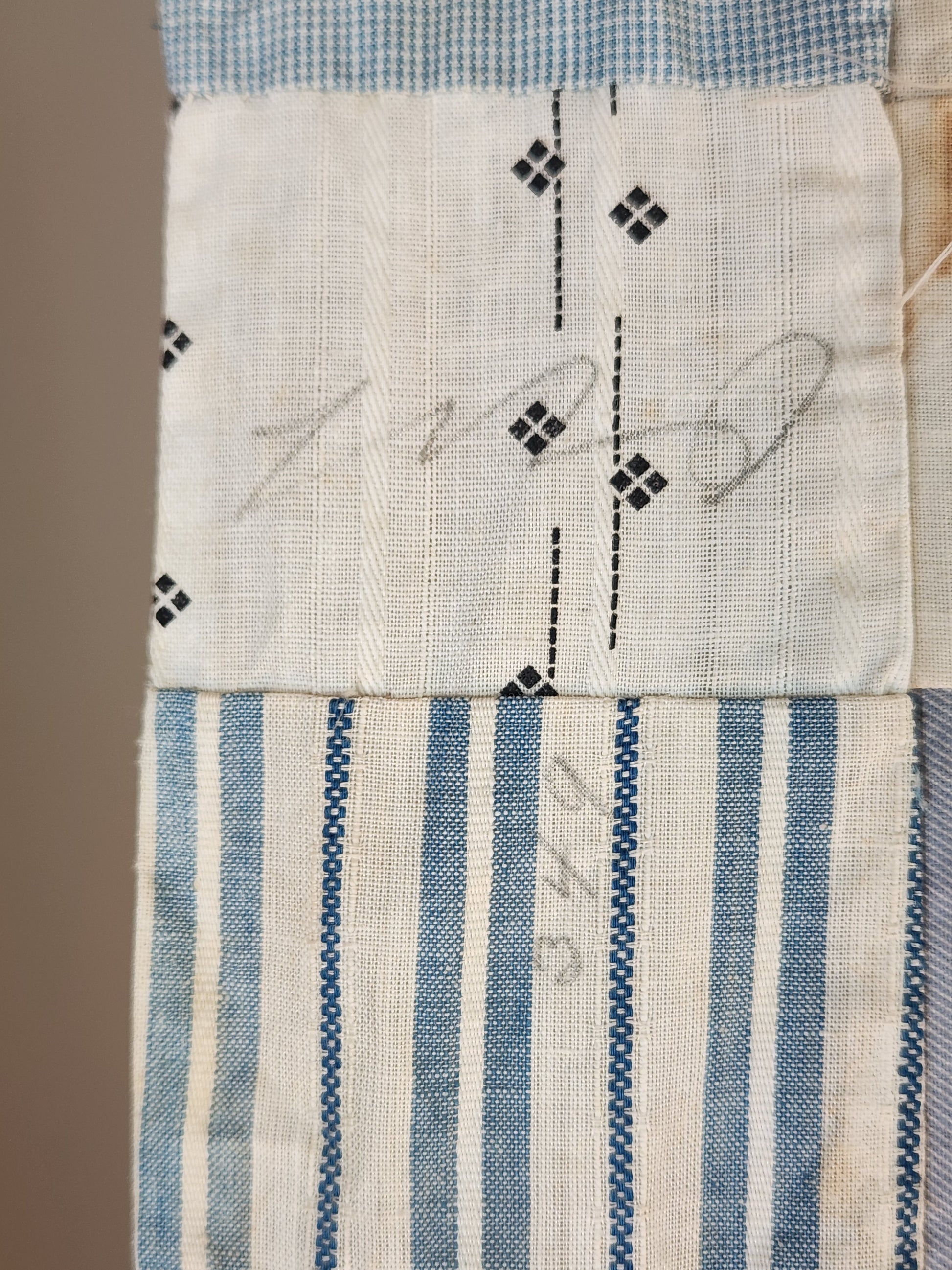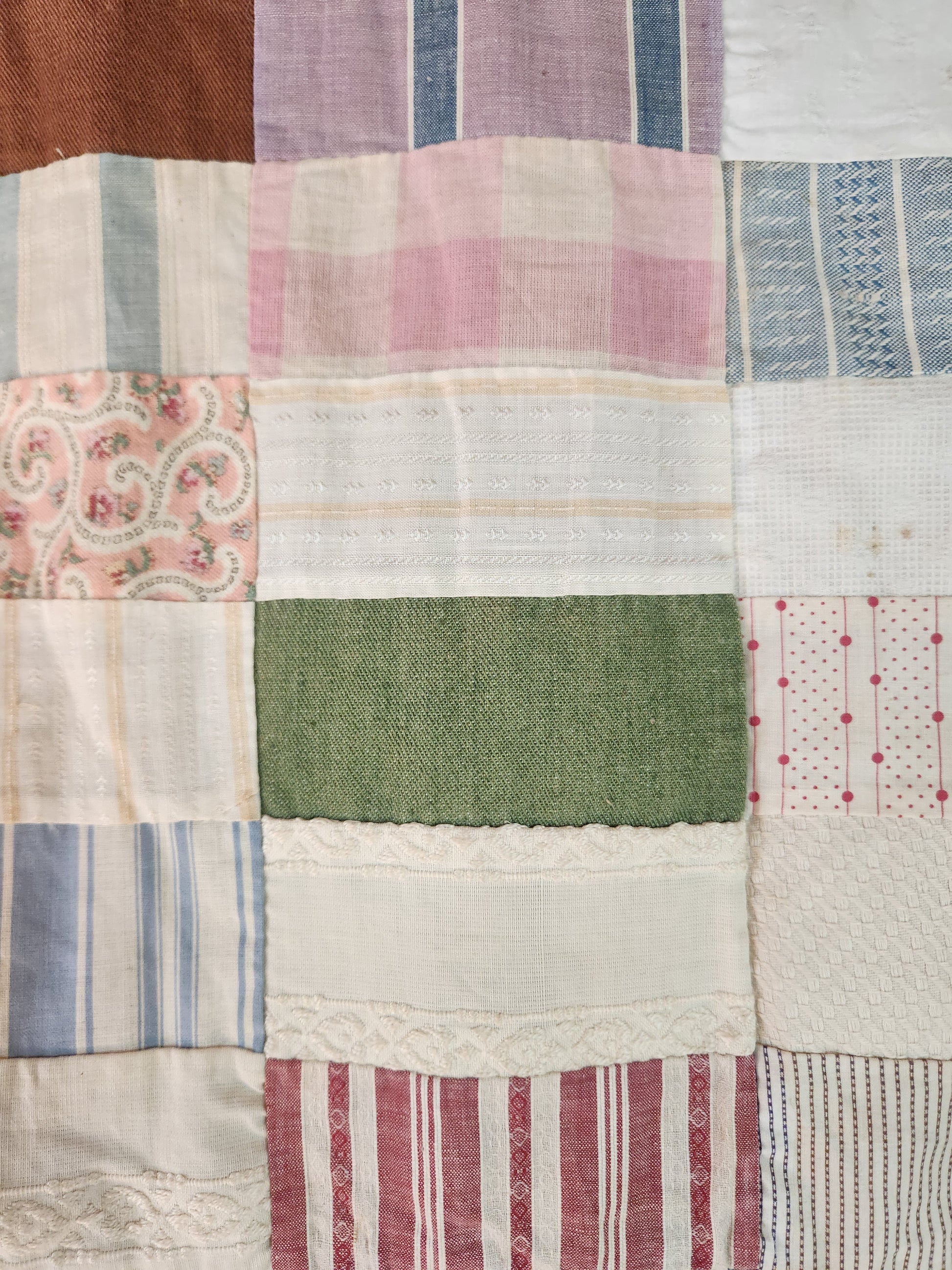 What a fabulous quilt top, full of character and charm, from the early 1900s. Most of the fabrics used were pulled from fabric manufacturer’s sample books with remnants of the paper they has been glued to for display on the backs. The blocks are all different sizes with many “make-do” areas. They used larger sample scraps and also the classic brick size. It is pieced by hand. Many of the lighter prints are marked with pencil with the word “out” ( assuming “out of print” perhaps..) There are tons of great colors and weaves, note the rose and ribbon print, a simulated blue ribbon.