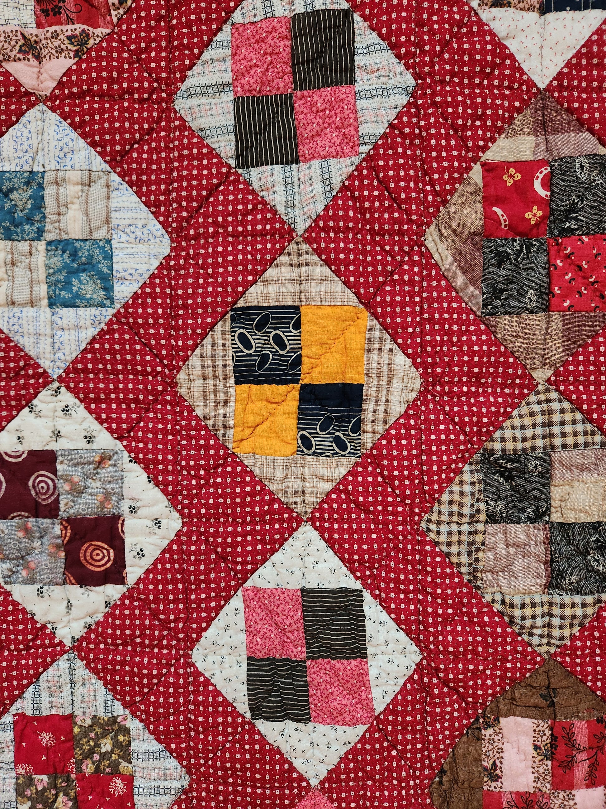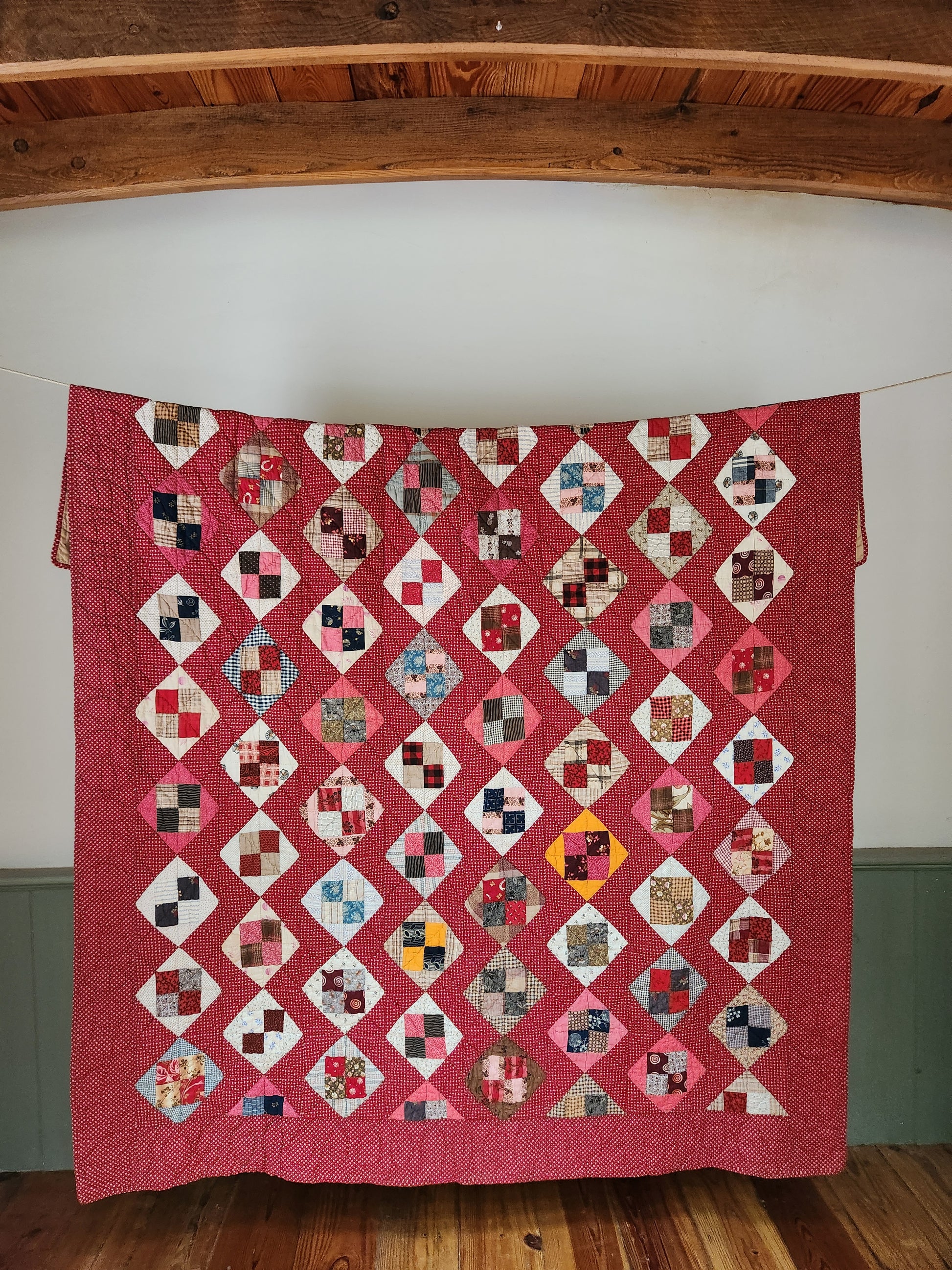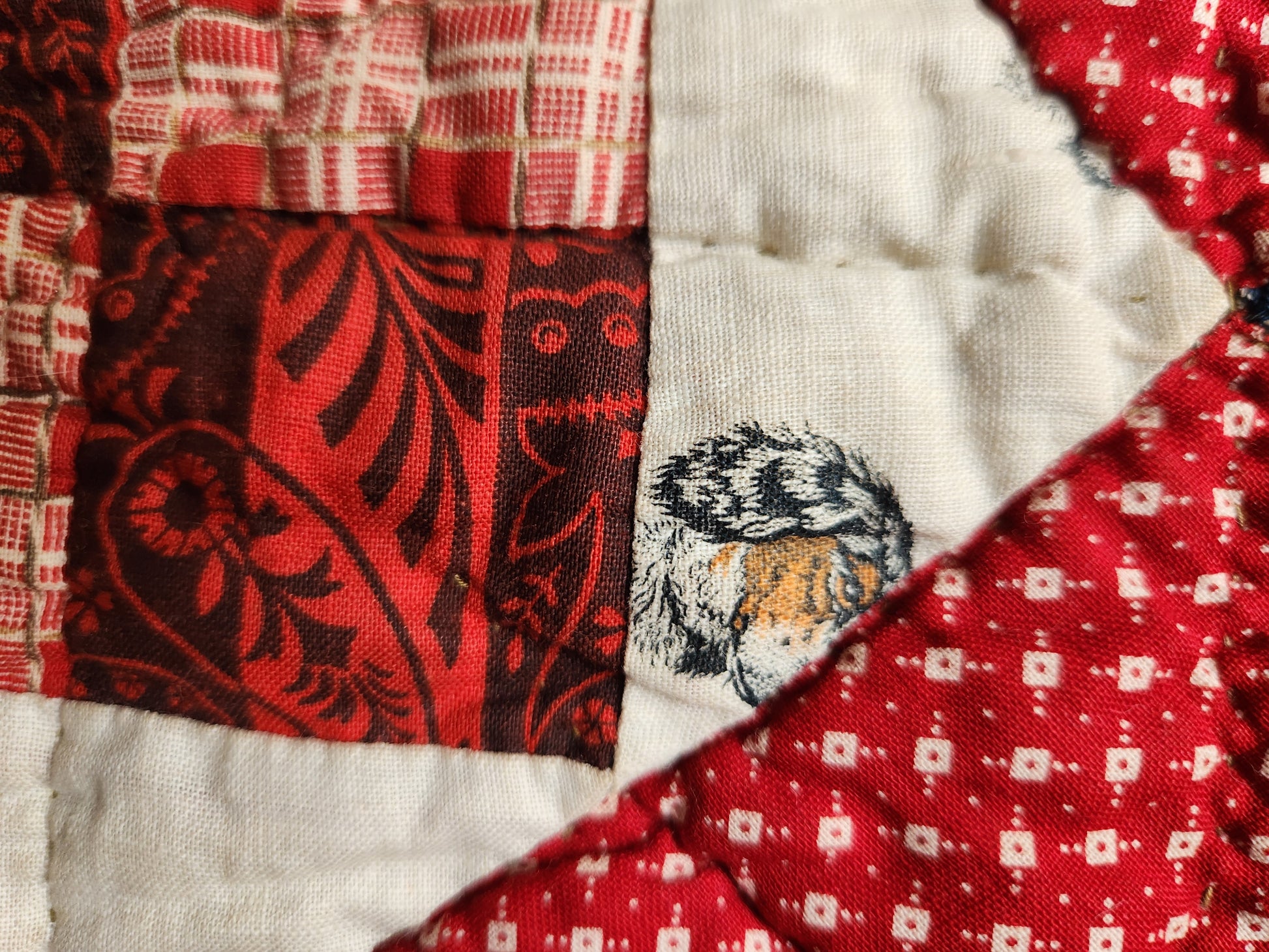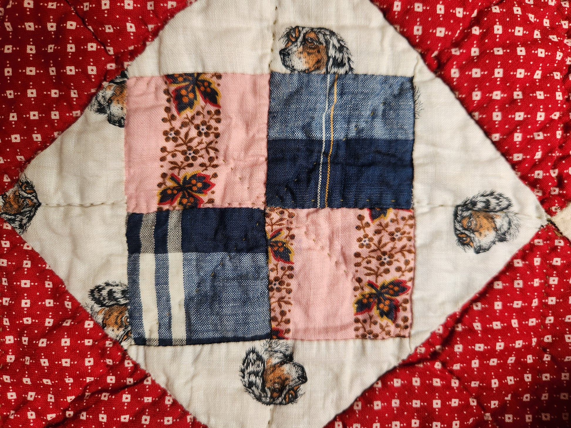 Collector's quality antique quilt from the late 19th century in a four patch block. This gorgeous quilt boasts lots of wonderful scraps including a charming, spaniel conversation print, lucky clover and horse shoe, and some pops of solid chrome orange (cheddar).
