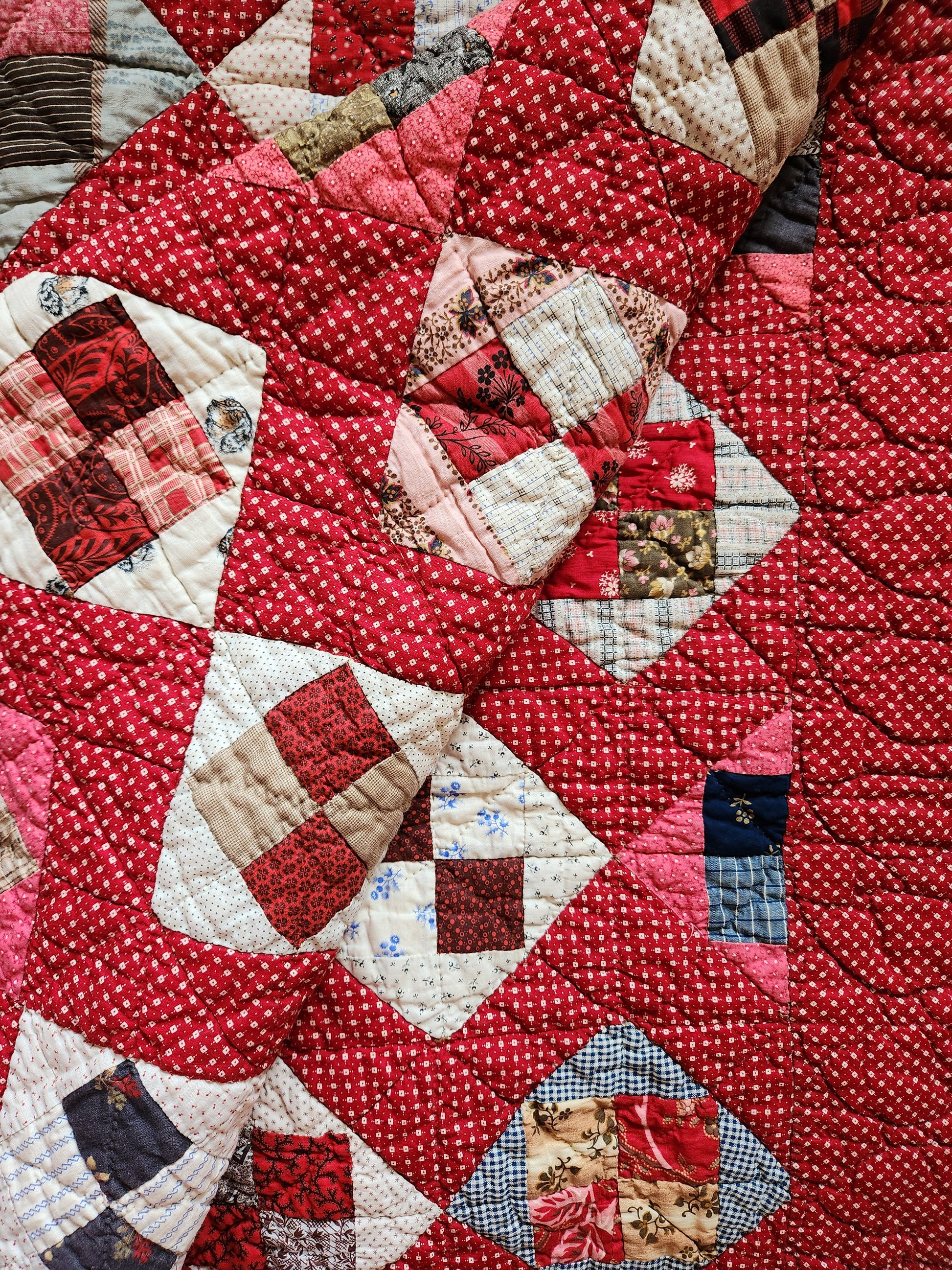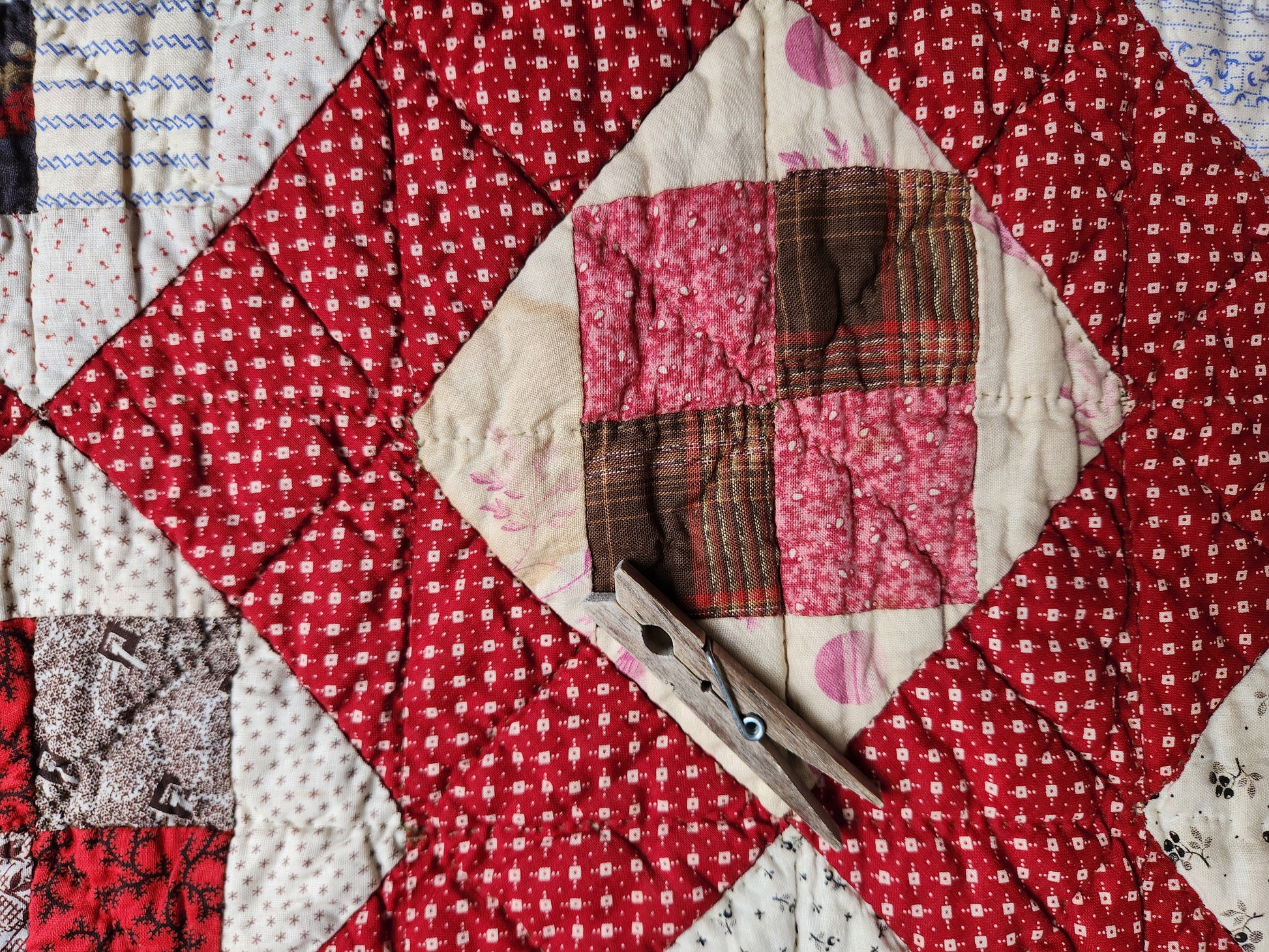 Hand pieced and hand quilted in a brown thread, it is in mint condition with only one small tan mark on one fabric, smaller than a dime, and a larger light tan mark on the purple and white floral (see photos with clothespins for reference).