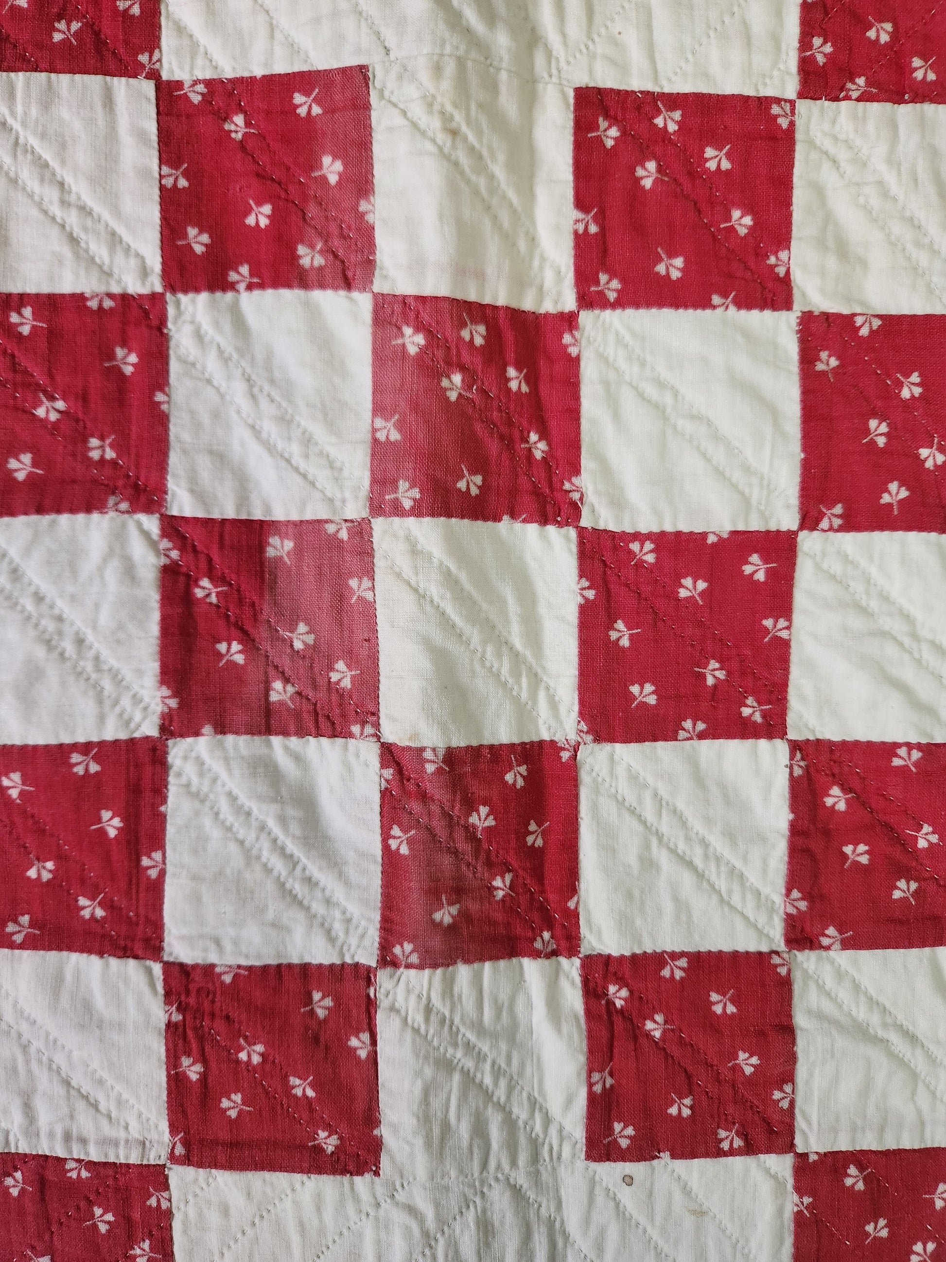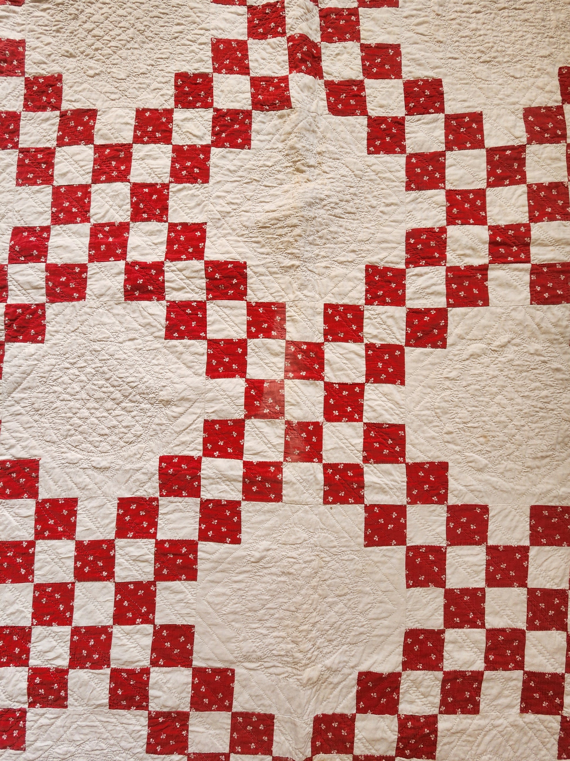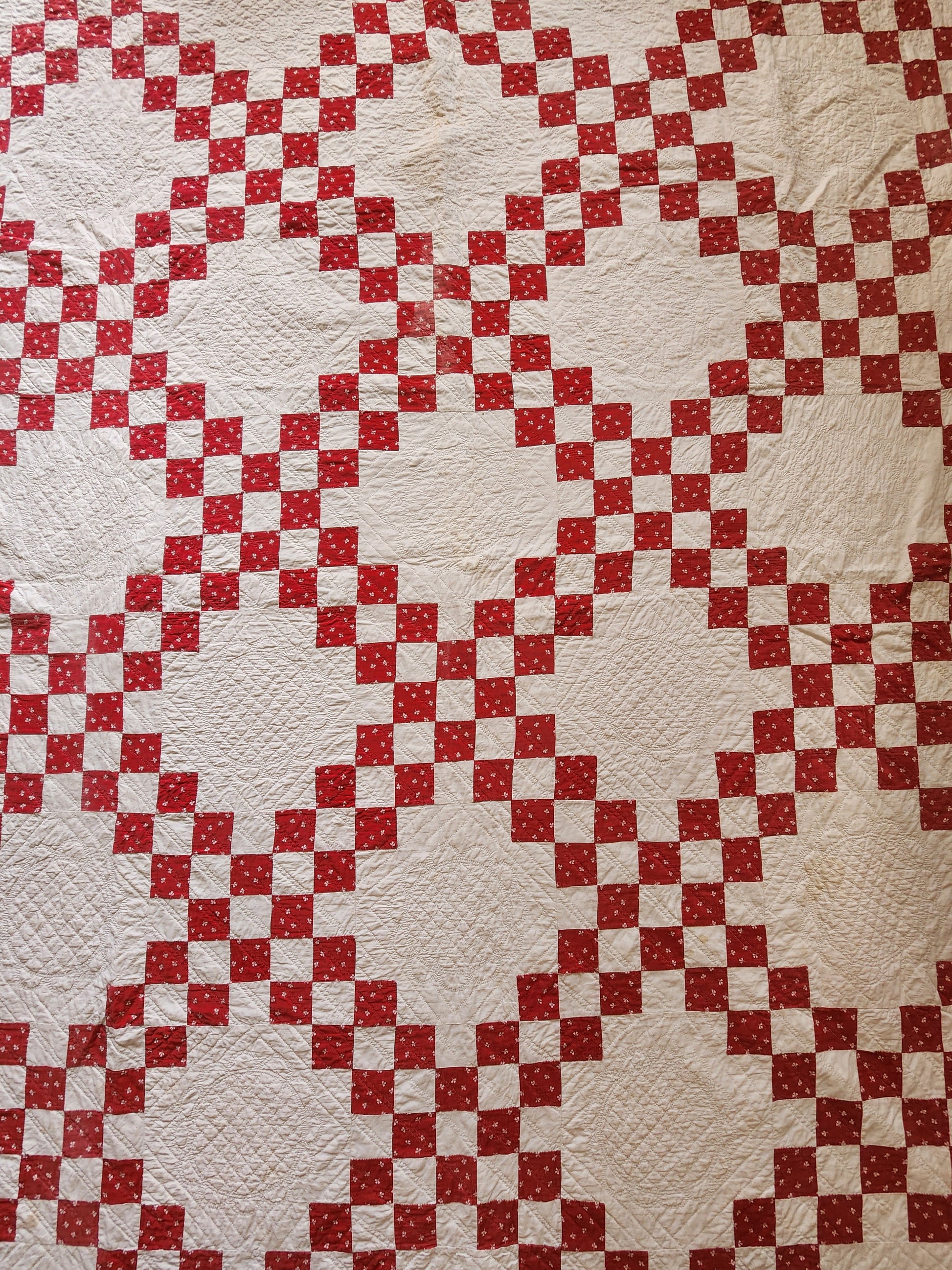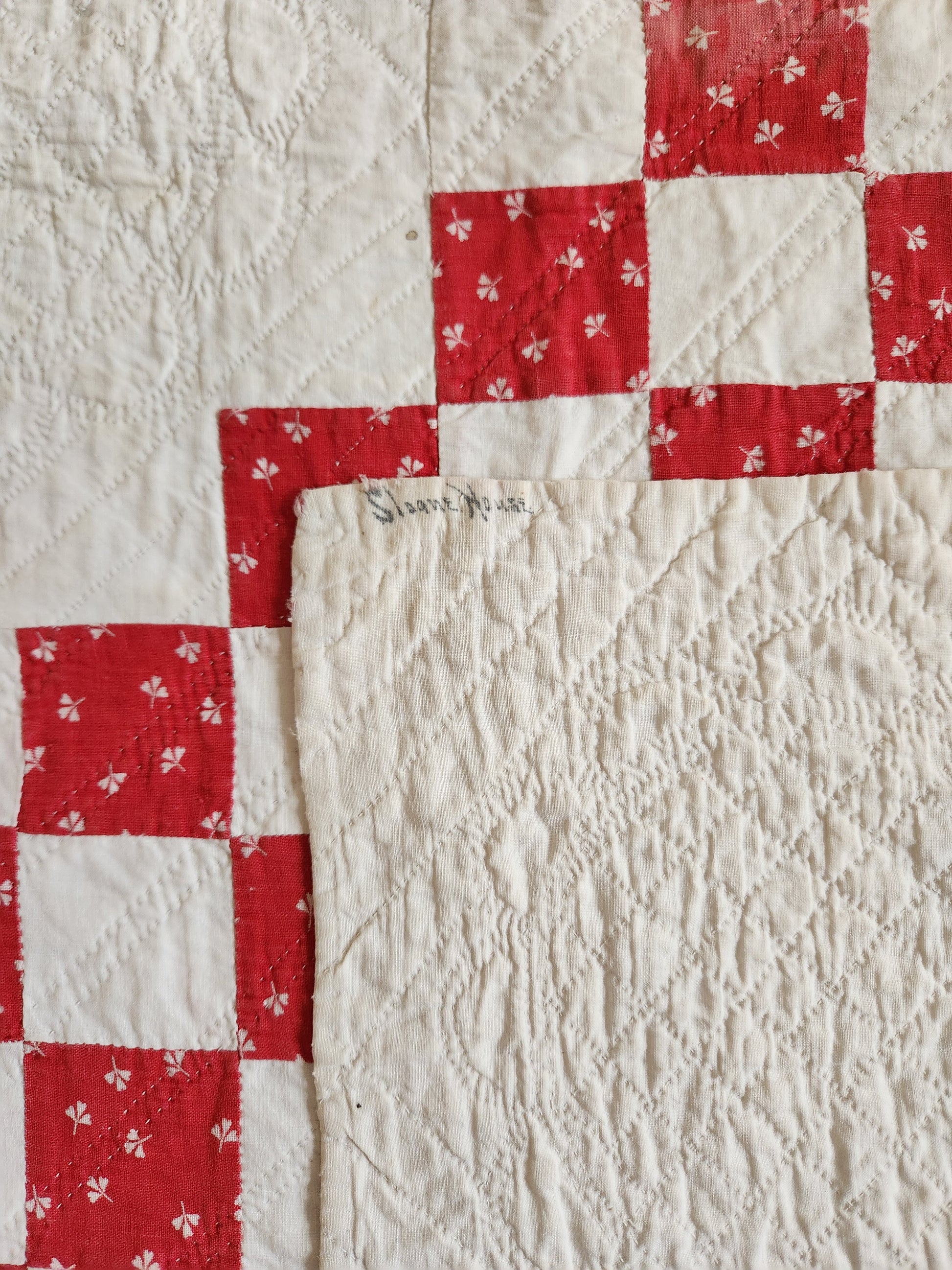 A 19th century red & white Irish chain quilt, freshly washed, from the late 1800s. It is inscribed with ink in the back corner: “Sloane House”. This gorgeous, hand pieced Irish chain is impeccably hand quilted. The white blocks boast skilled stitching which carries throughout the entire piece. There is minimal wear, signs of use showing on the binding with the fray in places along the top edge binding. Displays beautifully.