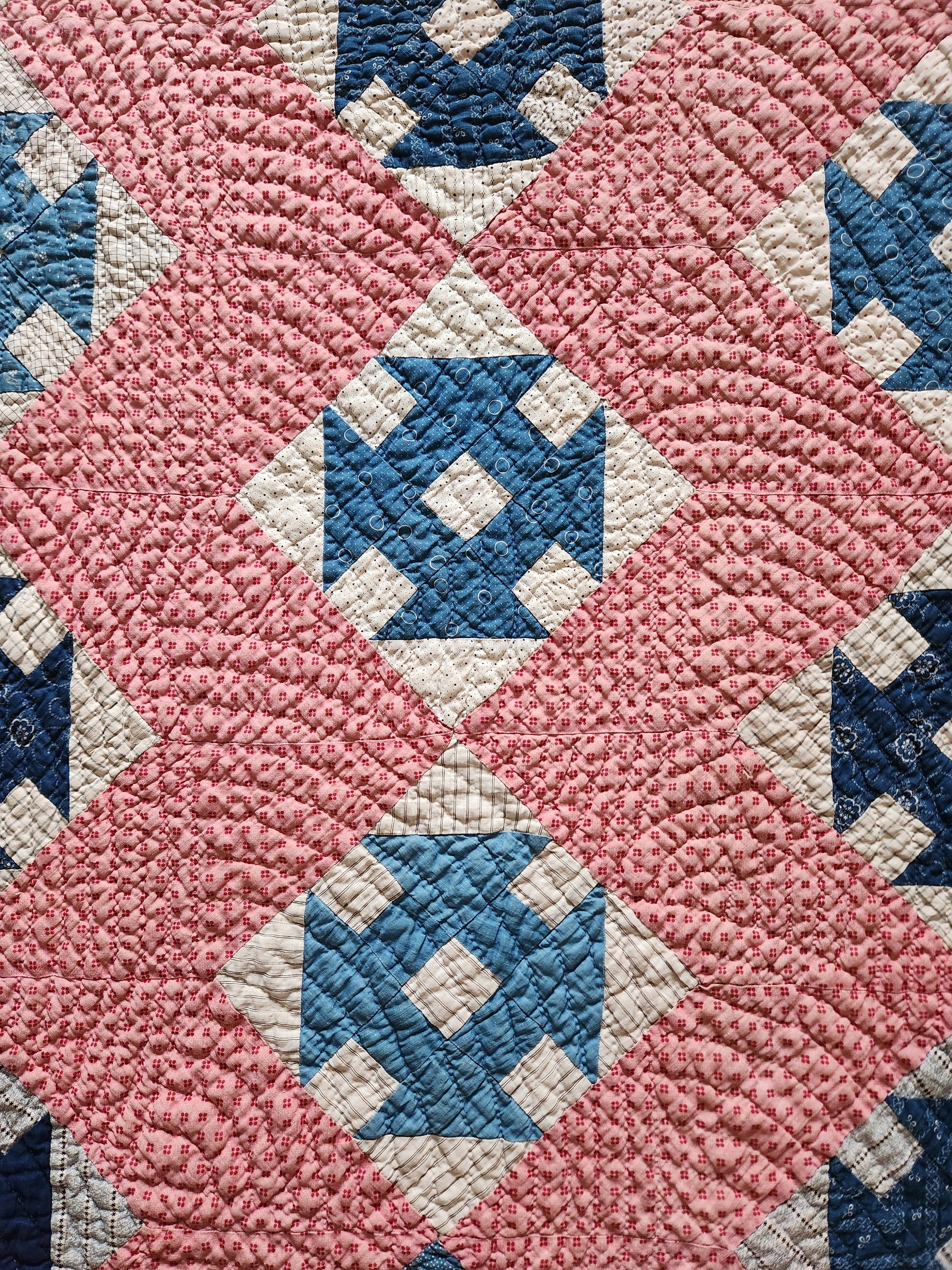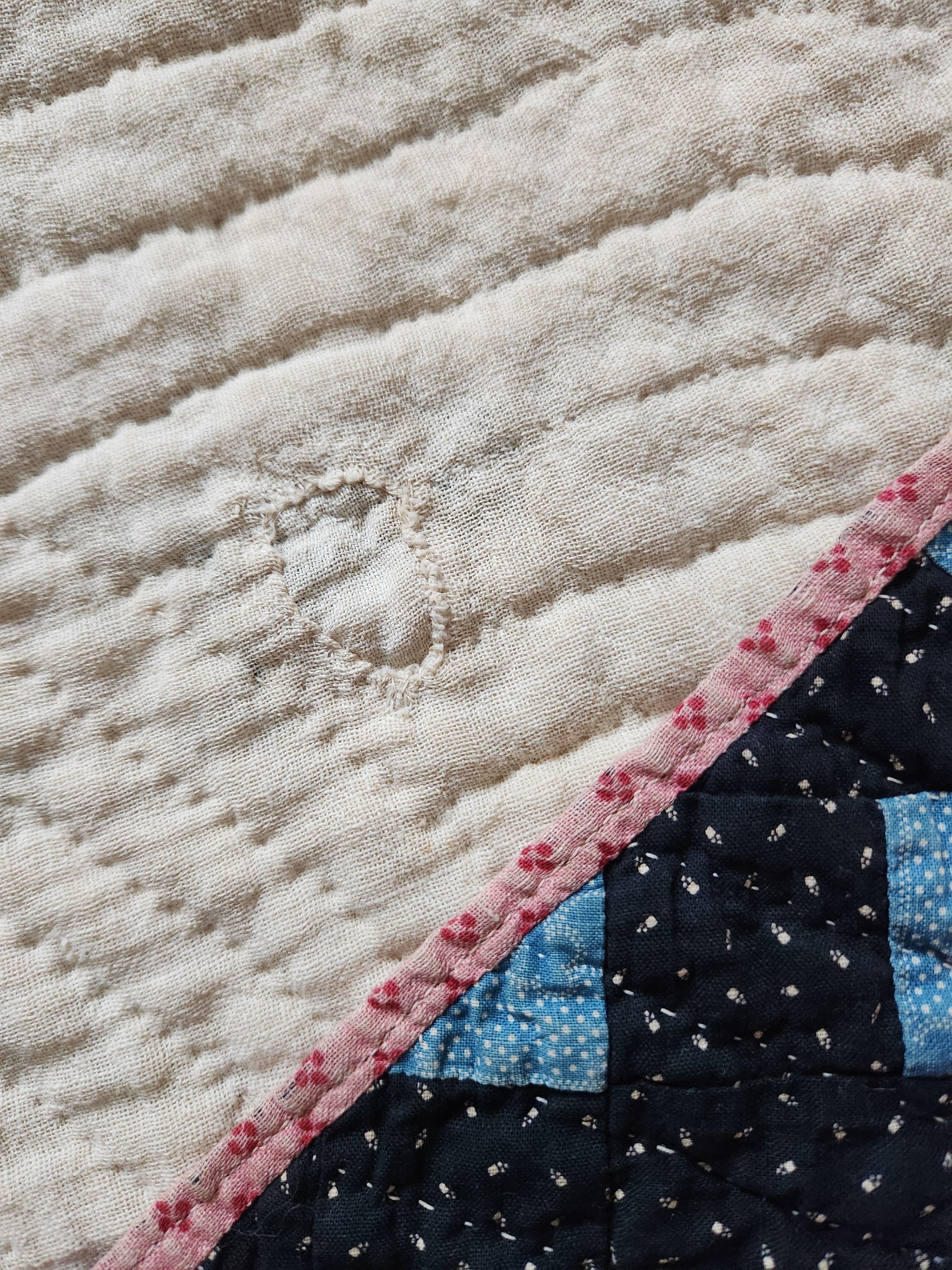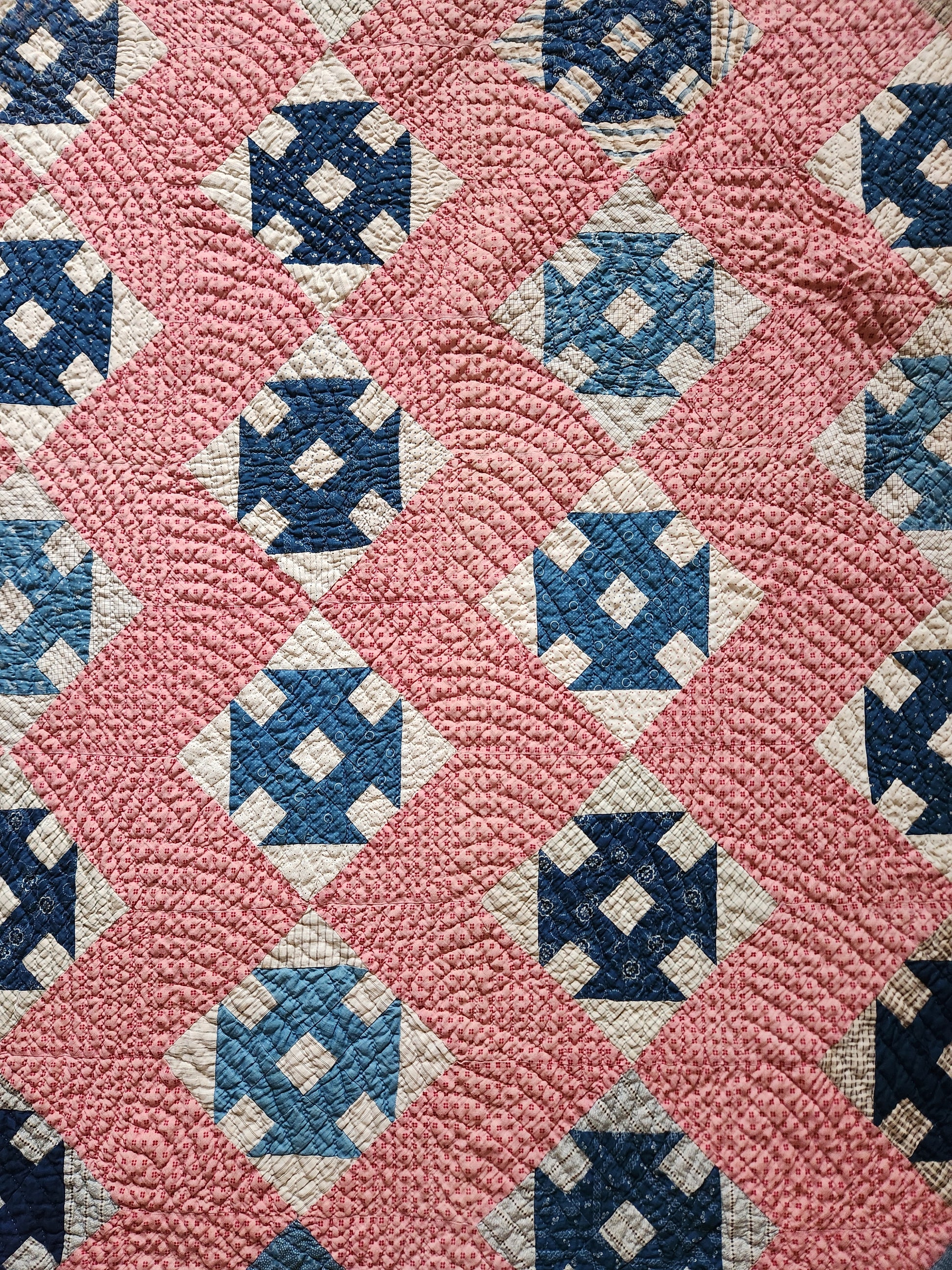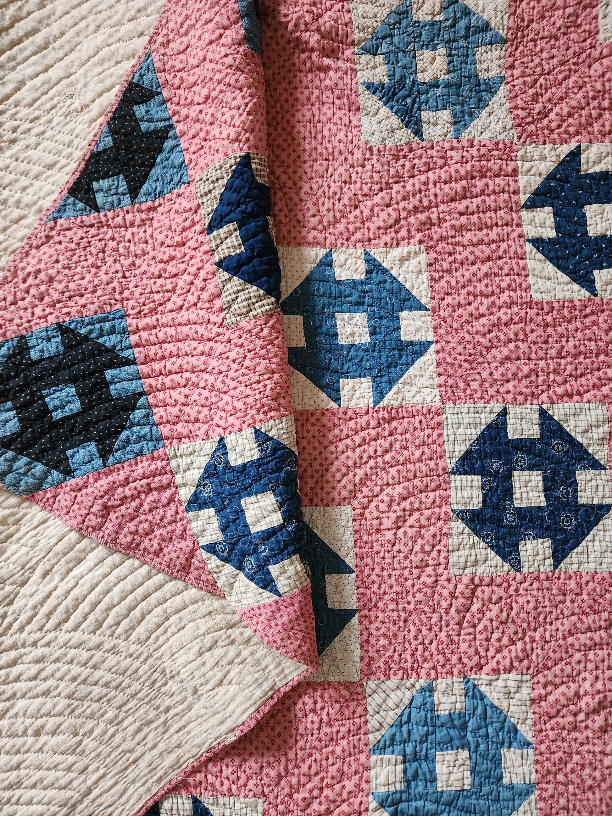 A gorgeous, simple and classic patchwork quilt, hand pieced using the best kind of shirting and prints with tons of indigos and other blues. Hand quilted in a Baptist fan, it is soft and drapey. There is an original, hand mend in the feed cloth backing.