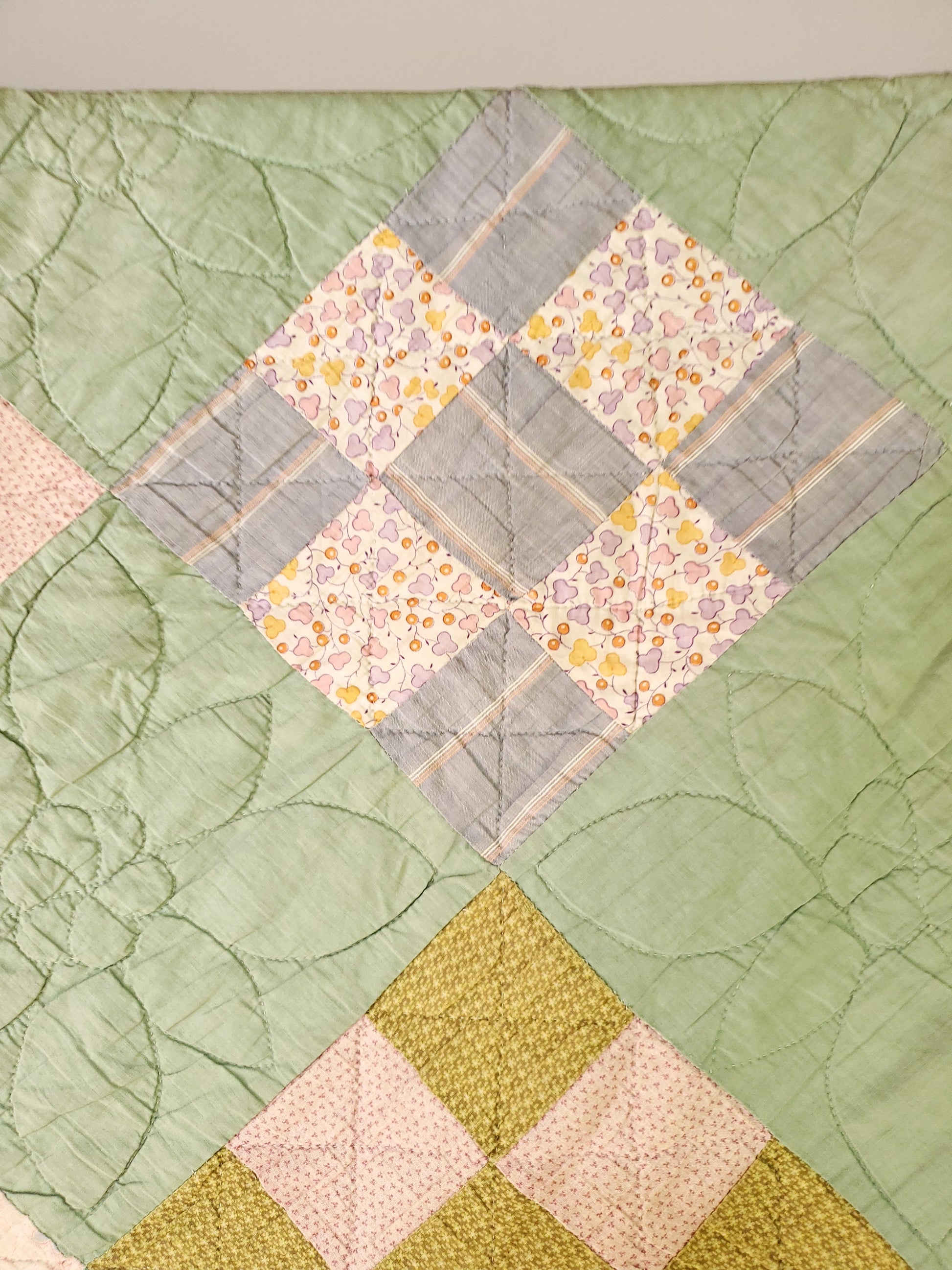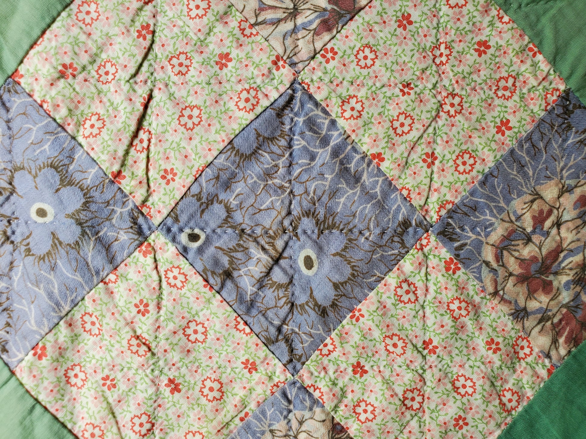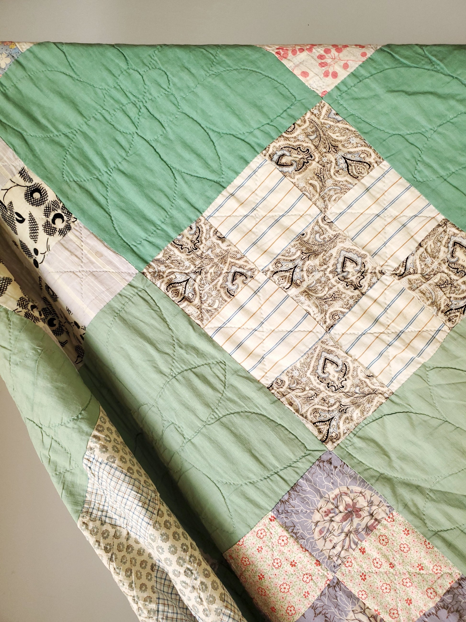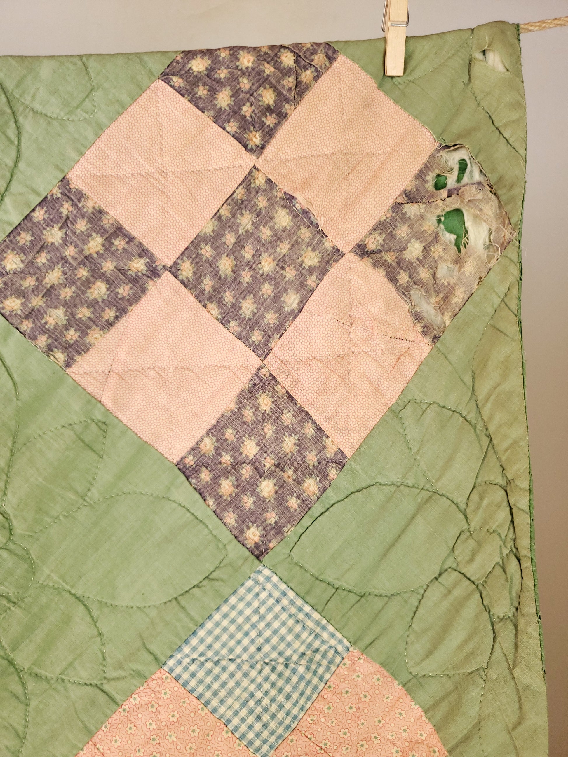 A sweet, green, Nine Patch Quilt from the 1930s. It is hand pieced and hand quilted in a flower motif. There are some split to the fabric in a few blocks and some areas of wear at the edges as shown. The patches are a mix of shirting, feed sack, and dress prints and contain lots of sweet designs. This has been aired, not washed.
