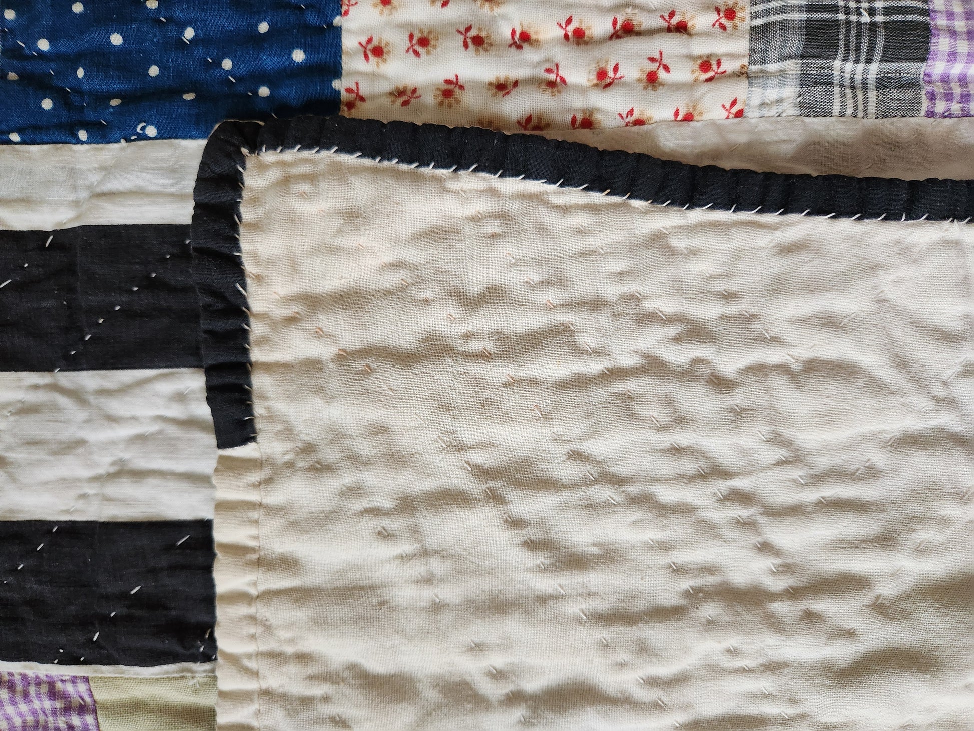 Condition: Good. Freshly washed. A few areas where pale stains have left faded spots. Note the two adjacent patches shown with some minor dots of fabric loss within the marking on the black gingham patch, left. Two small dark dots on the lower bar, black gingham scrap.