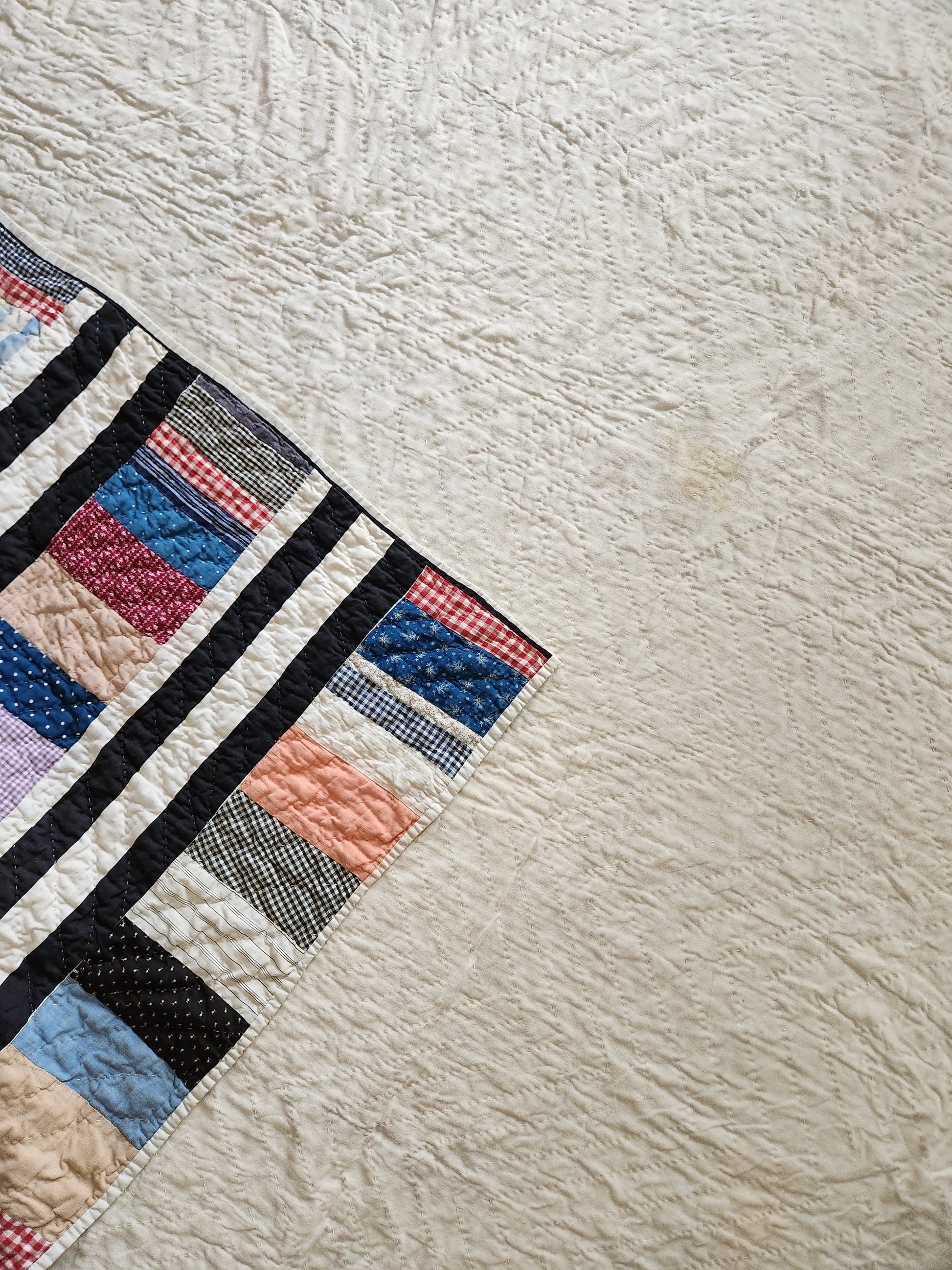 Graphic and bold, this quilt speaks volumes for daring composition and keen use of varied scraps. The layout is wonderful with the bold, black & white, striped cotton sheet cloth framing rows and rows of scrappy, pieced bars. It is freshly washed and in great condition with some residual spotting on a few patches. It is machine pieced and hand quilted. This is a fabulous statement piece for any space.